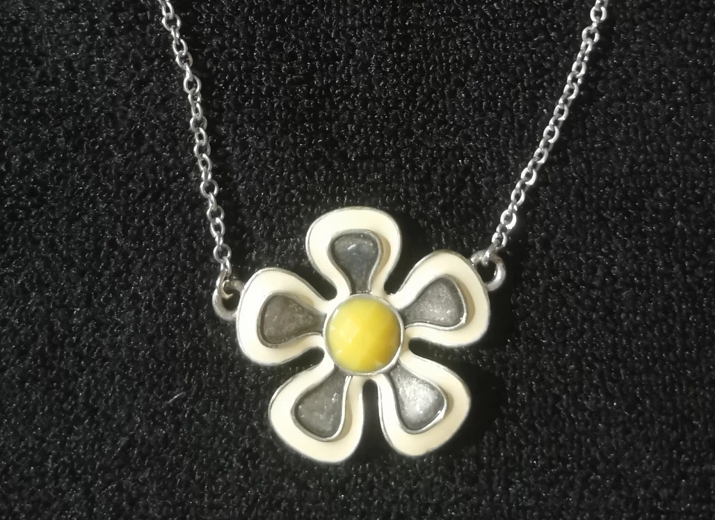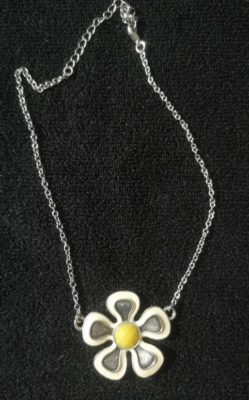 Cute daisy flower necklace! The pendant has a yellow centre with white petals and a silver outline. The chain is also silver. Perfect for adding a bit of sunshine to your outfit
