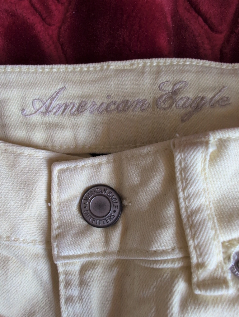 You can't tell the color in the photos very well, but they are a nice yellow .Cute American Eagle denim shorts in a size 6! These are a light yellow colour and have a bit of stretch to them. Perfect for summer! I believe they were a low rise but they have not fit me in 2 years so I'm selling them