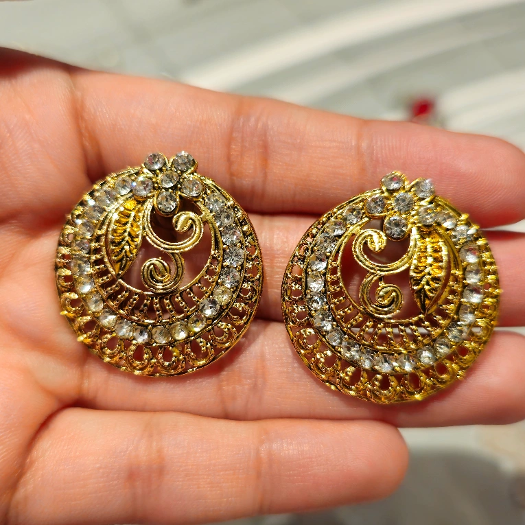 These are a pair of gold-tone earrings. They feature a round design with intricate detailing and clear stone accents. They're in great shape and ready to add a touch of sparkle to your look!