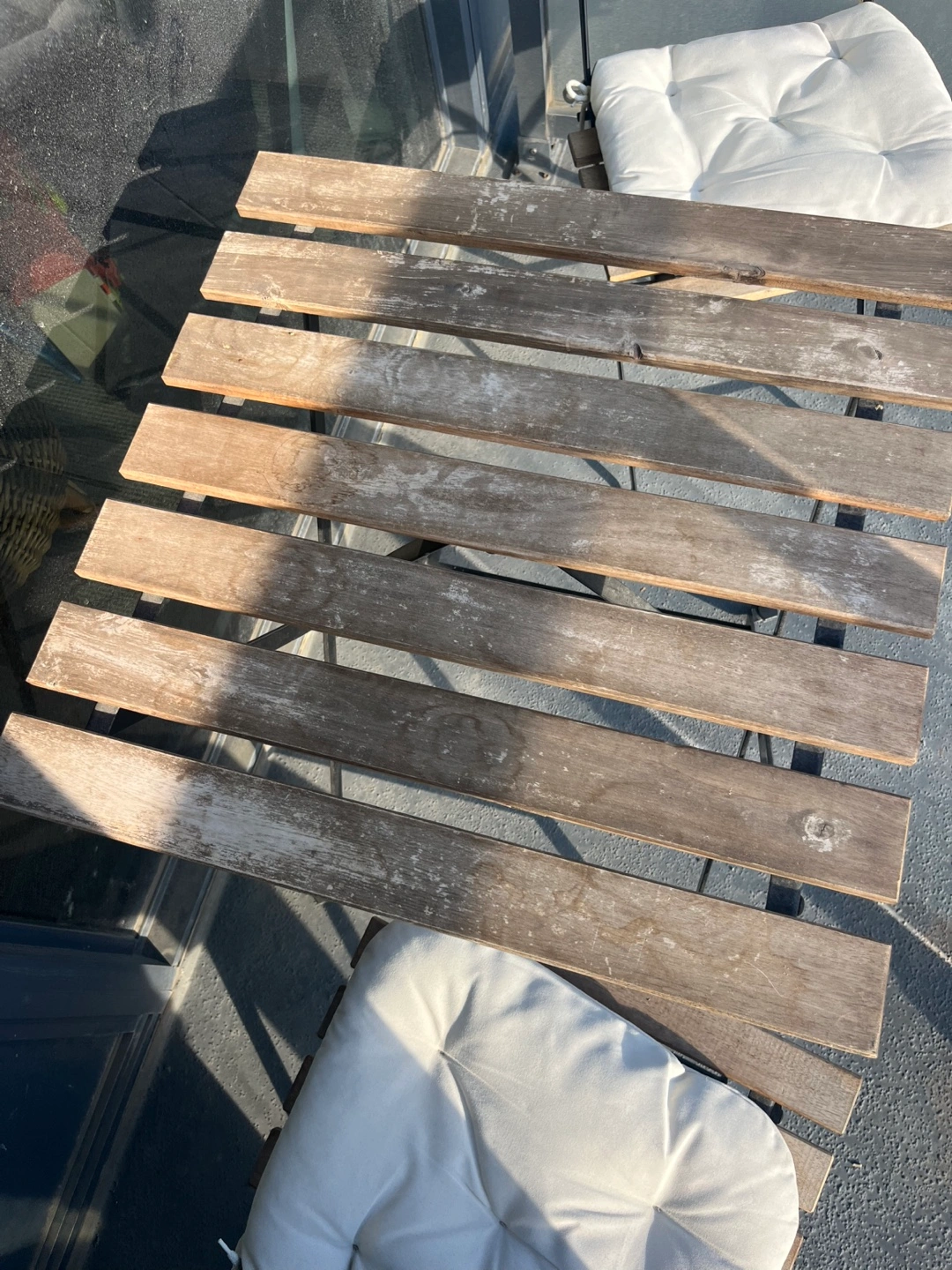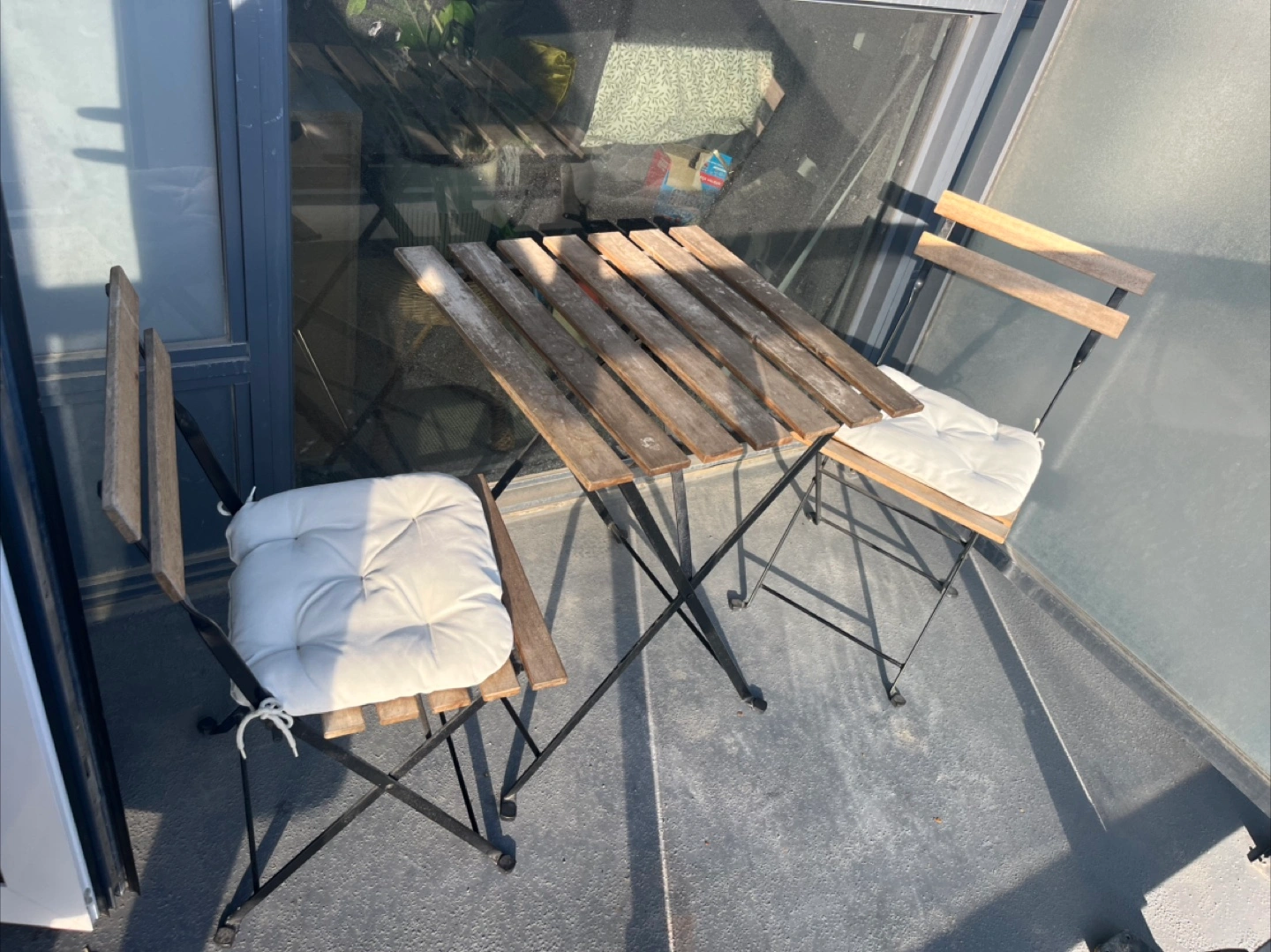 Selling wooden table and chair set, perfect for a small balcony or patio! The set includes a small wooden table and two chairs with comfy white cushions. It's a great spot for enjoying your morning coffee or a relaxing evening outdoors. Pickup only at Church and College, DM to coordinate timing!
