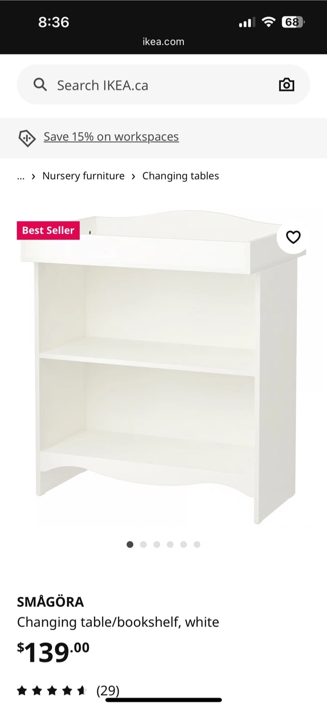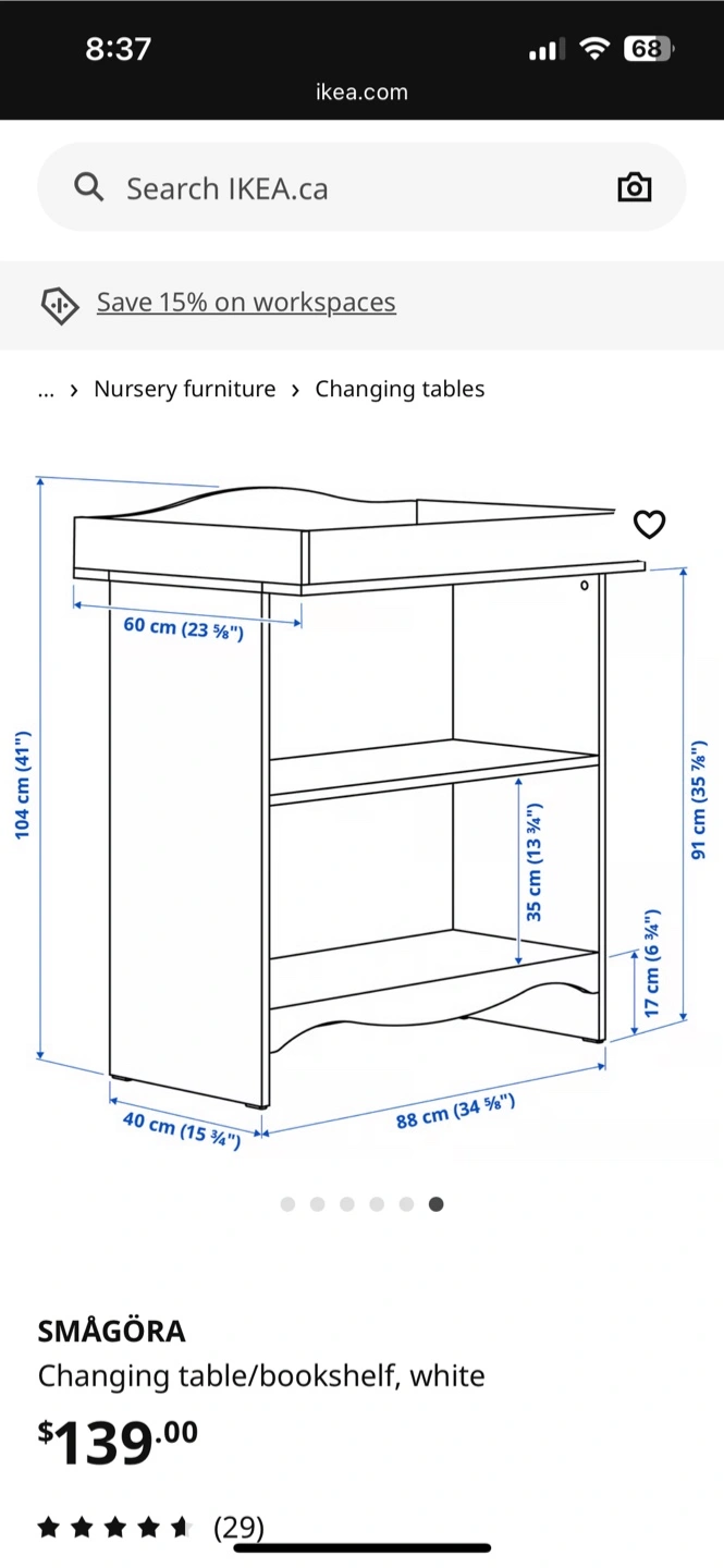 Selling an IKEA SMÅGÖRA changing table and bookshelf in white. Key specs: - Dimensions: 104 cm (41") height, 60 cm (23 ¾") width, 40 cm (15 ¾") depth, 88 cm (34 ¾") length - Shelf height: 35 cm (13 ¾") and 17 cm (6 ¾") Originally bought for $139
