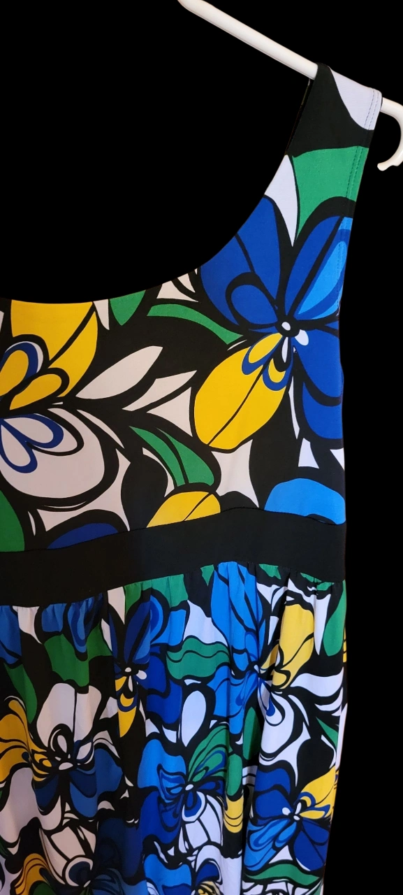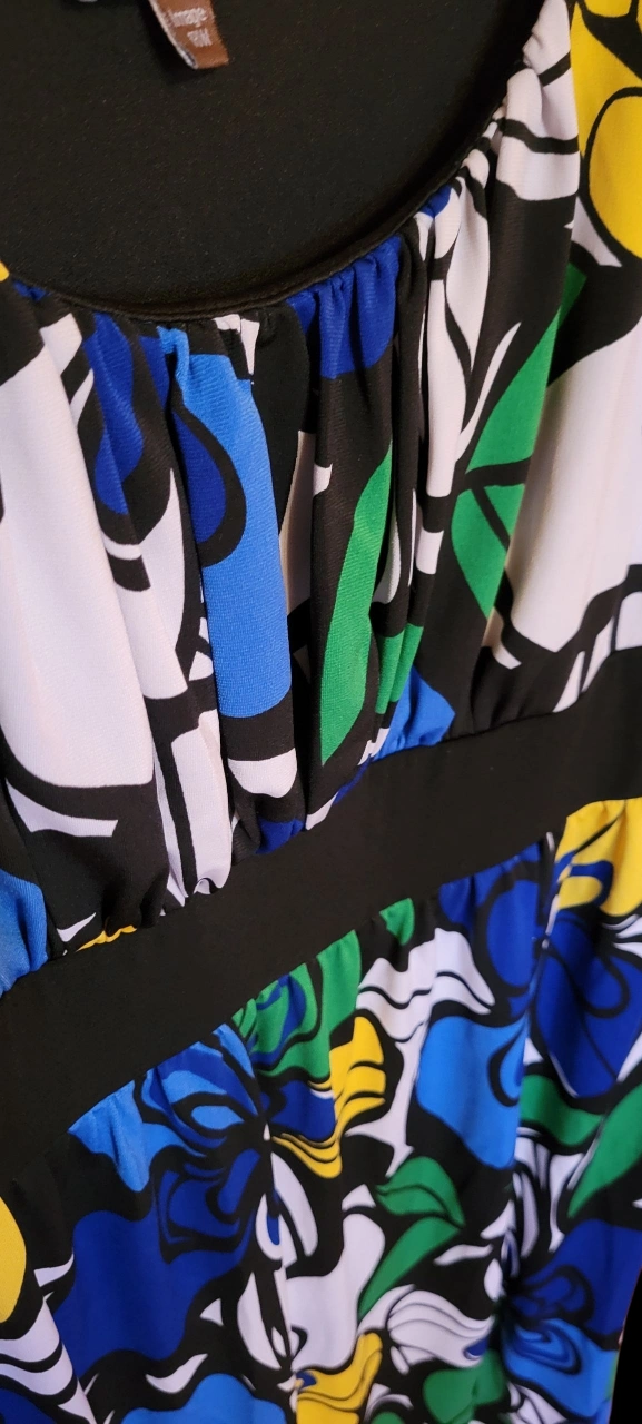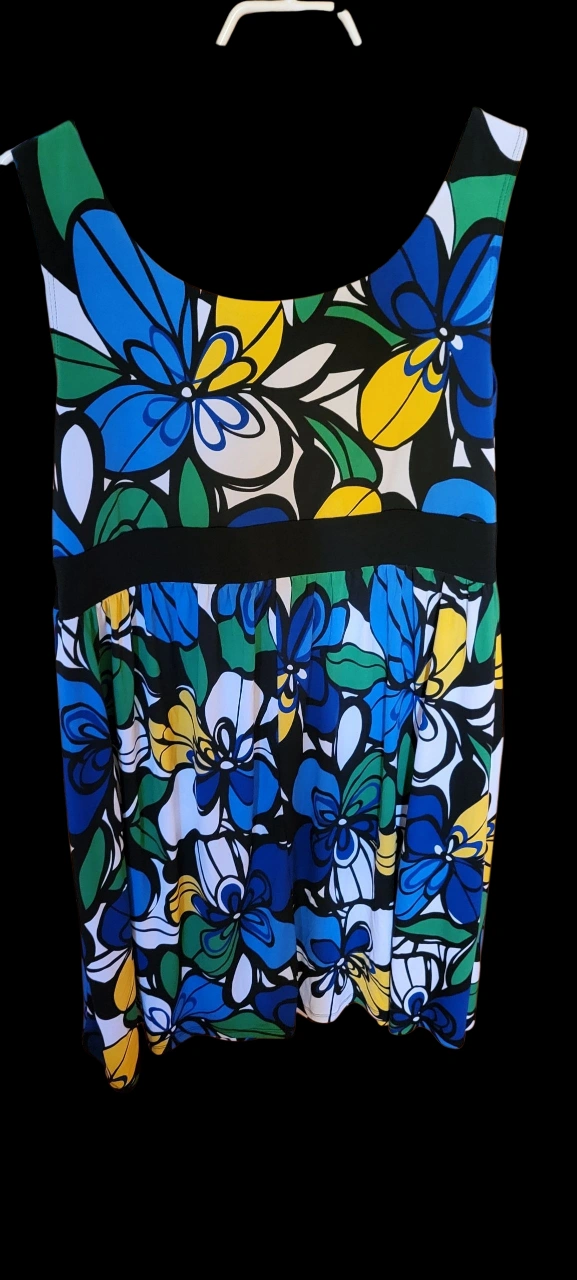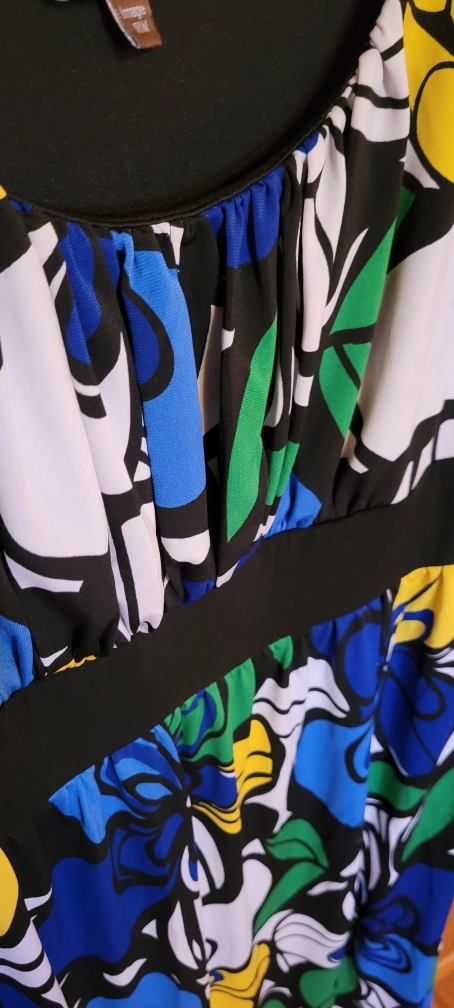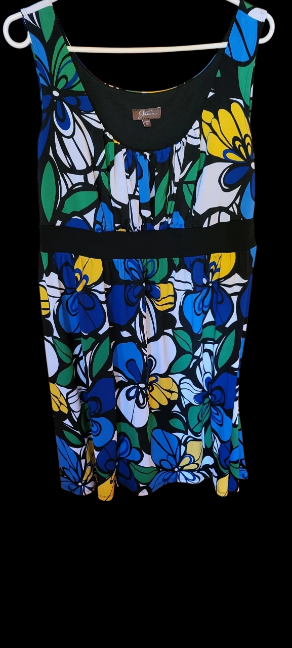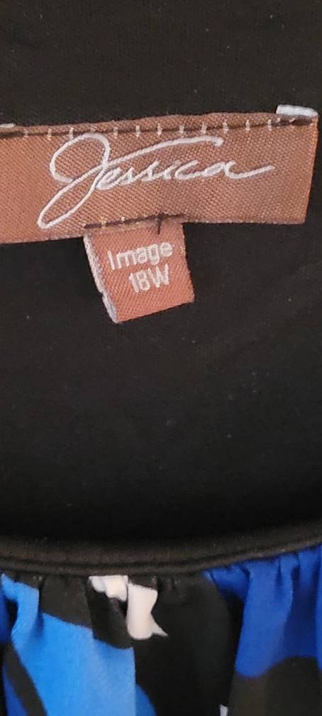This fits like a 2XL, but is a bit tight under the bosom. I'd say a 1XL, to be safe. It is knit and silken cloth, lined over the bust. Product of Jessica, sized as 18. It flows to the knee. I'm 5'3", bust is 58.