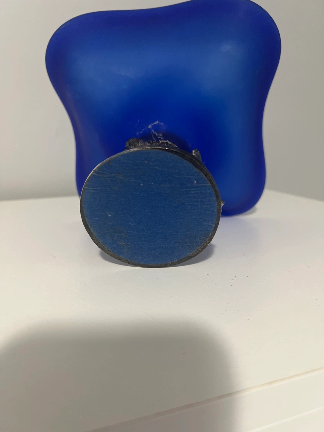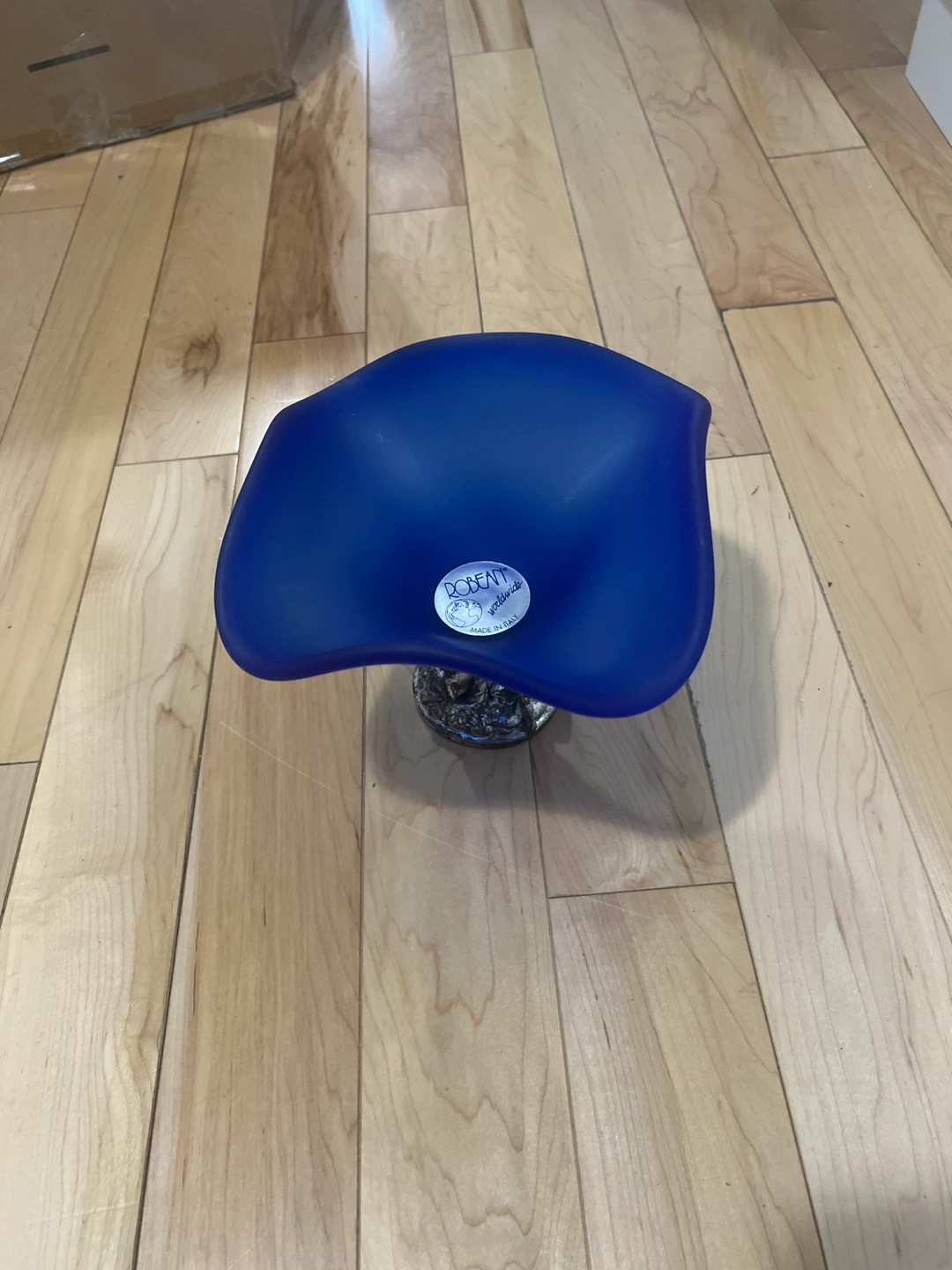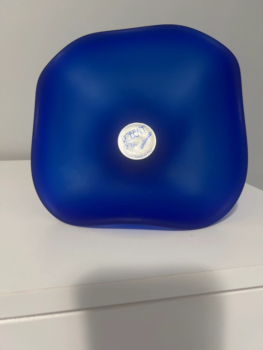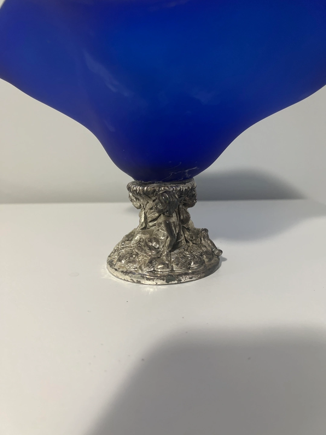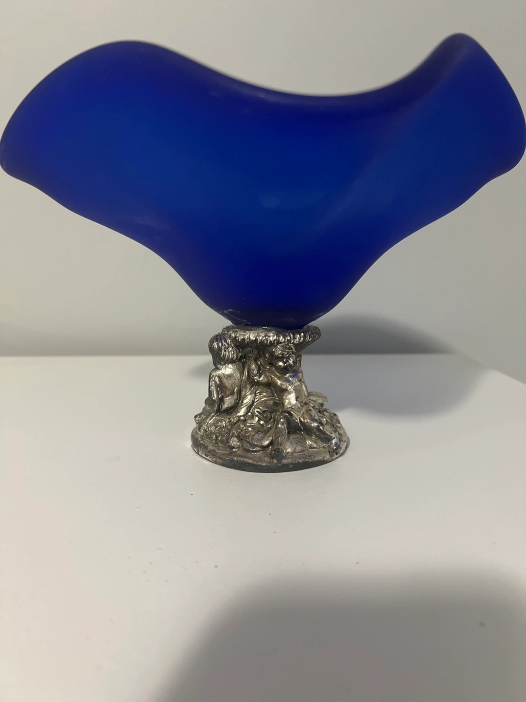 Made in Italy, Vintage Robean bowl, likely from the 1960s, featuring a distinctive cobalt blue frosted glass bowl atop a silver-toned base decorated with cherubs or putti. * Type: Vintage decorative bowl, possibly intended as a centerpiece or for holding fruit. * Materials: Frosted blue glass and a silver-toned metal base. * Style: Vintage, likely from the 1960s, with a classical or rococo-inspired base design.
