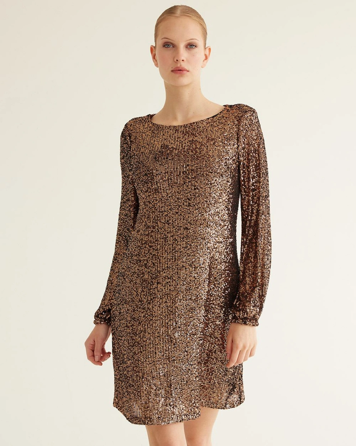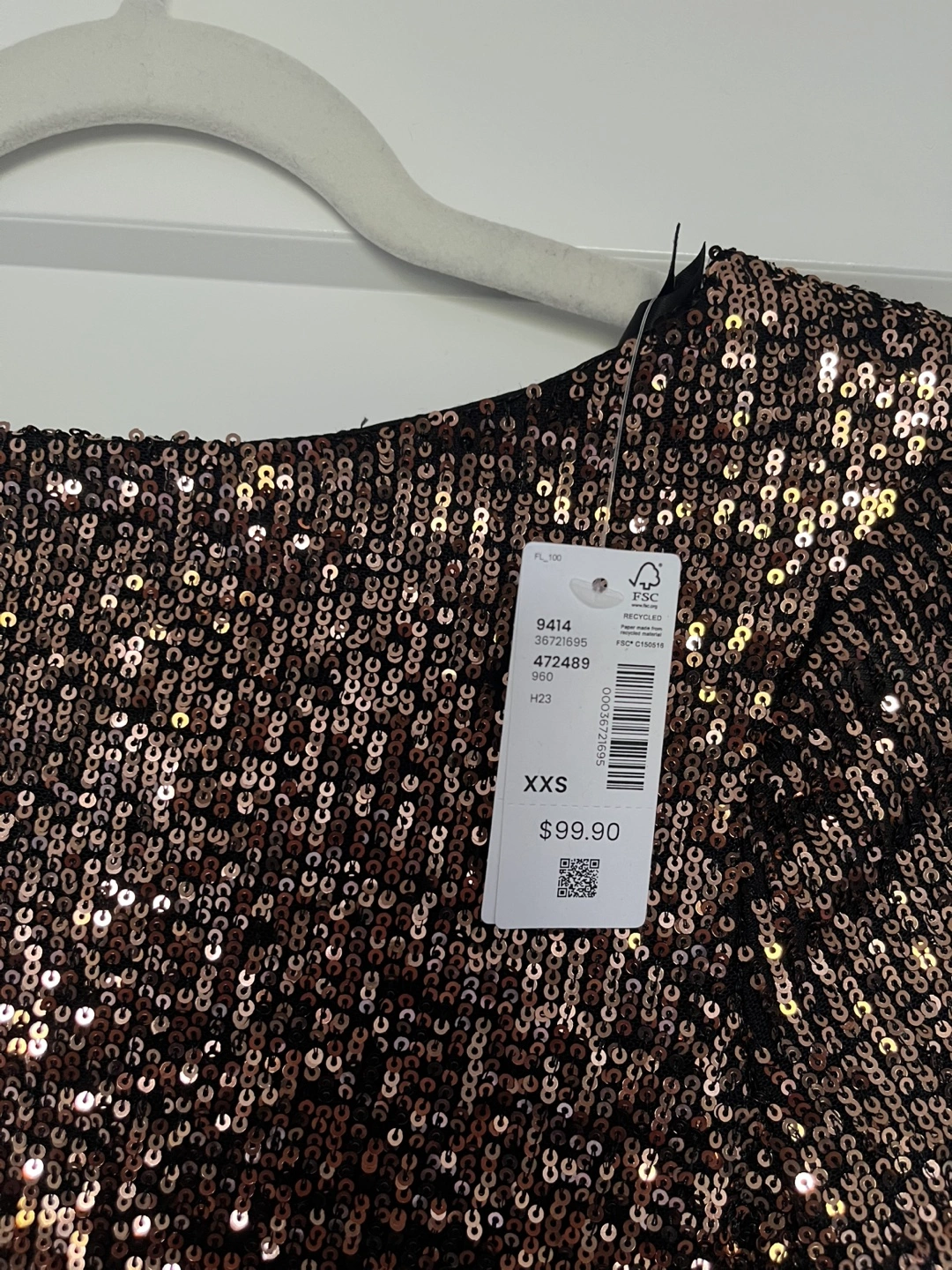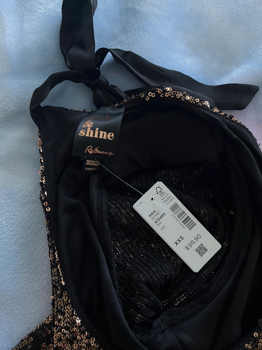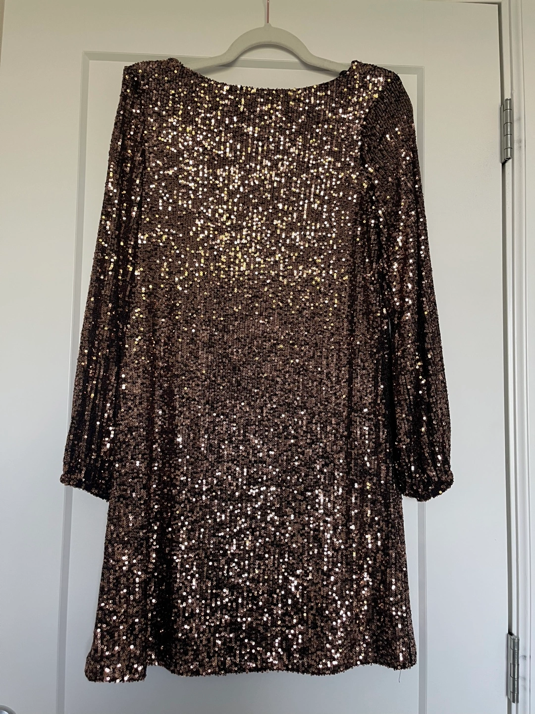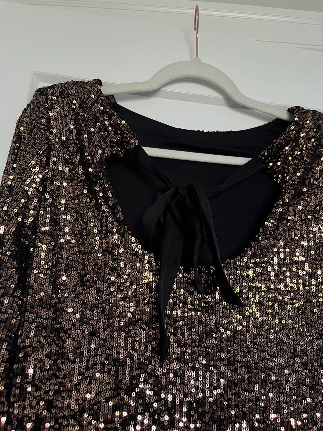 Selling a Reitmans bronze sequin shift dress in size XXS. It's a beautiful dress with a ribbon tie back that's perfect for parties or special occasions. Retails for $99.90. It’s brand new with tag! Just didn’t think it suited me ):