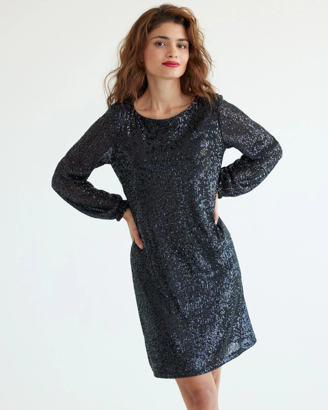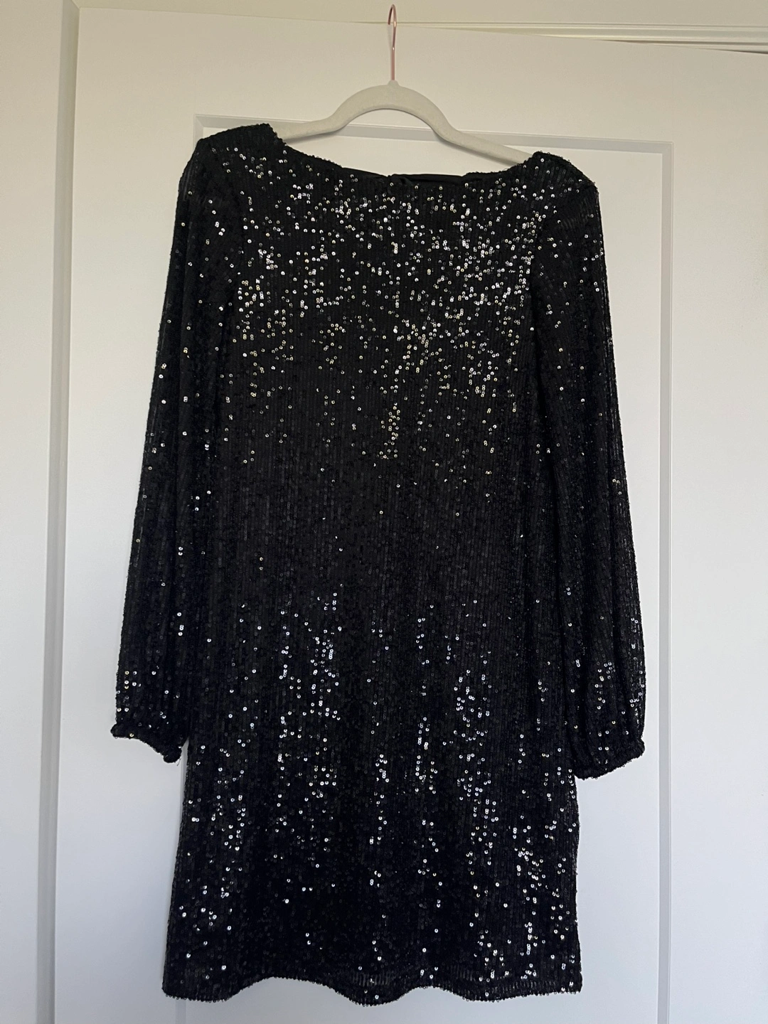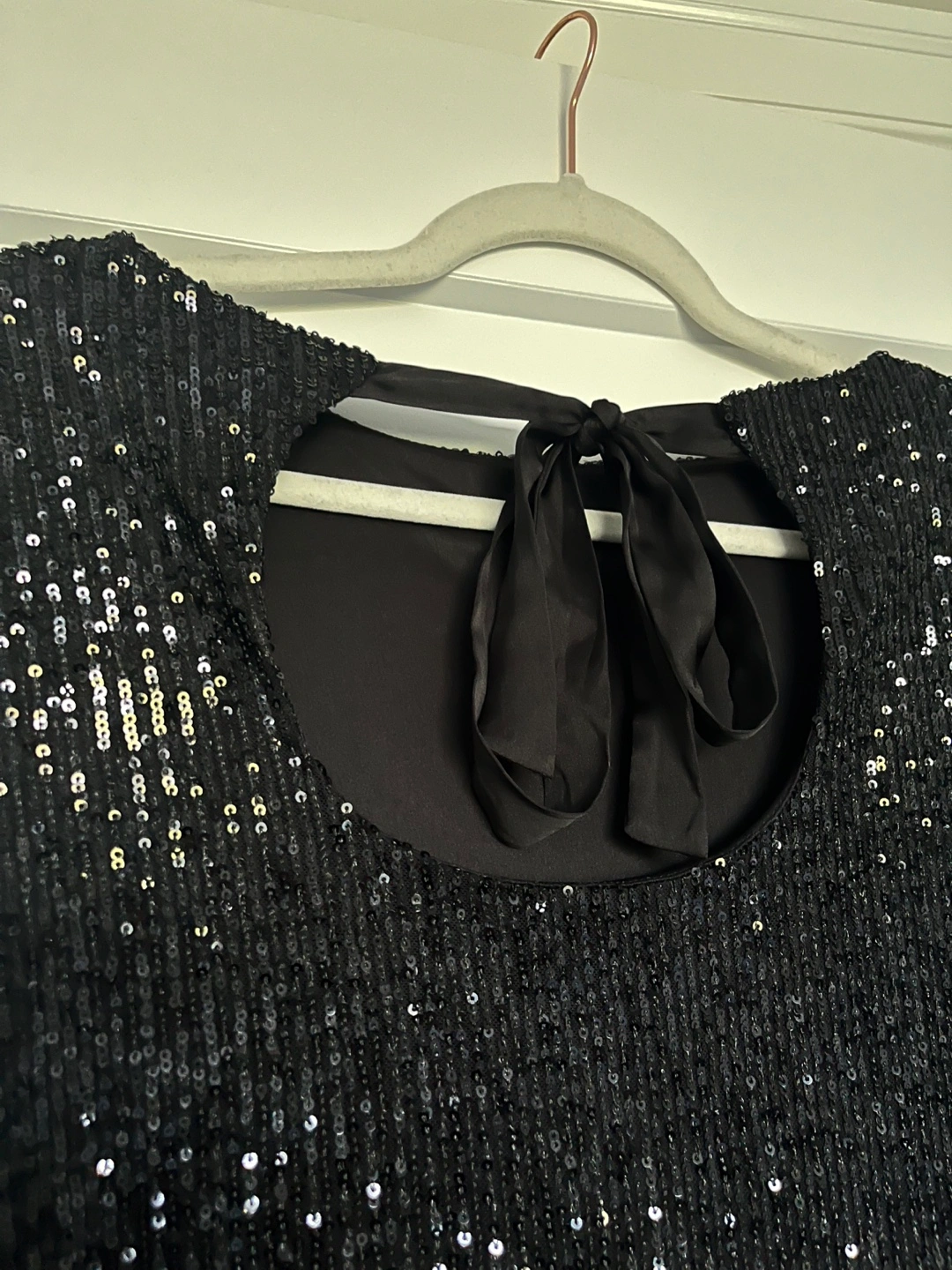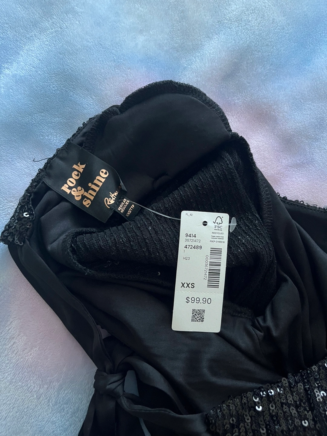 Selling a Reitmans black sequin shift dress in size XXS. It's a beautiful dress with a ribbon tie back that's perfect for parties or special occasions. Retails for $99.90. It’s brand new with tag! Just didn’t think it suited me ):