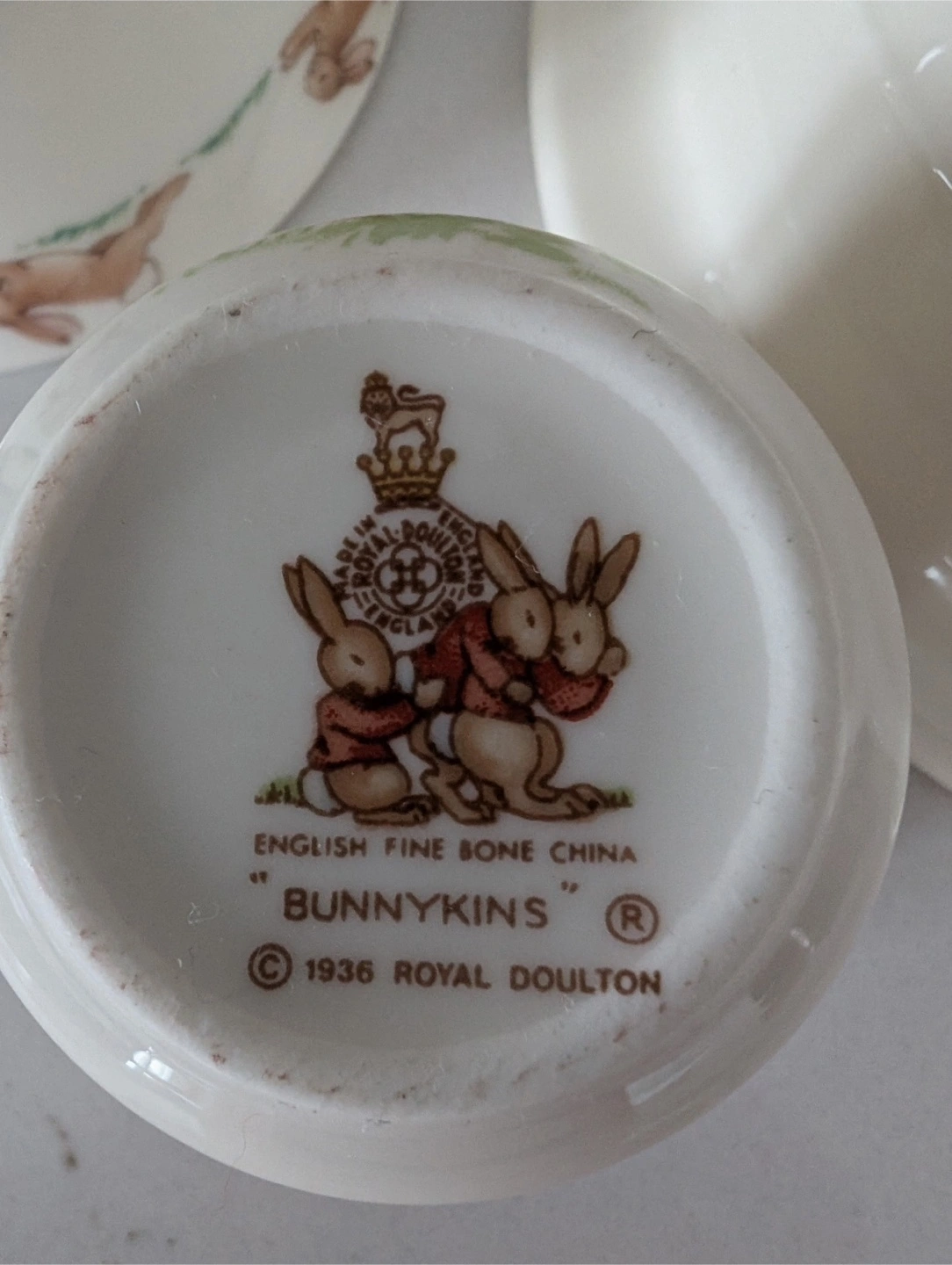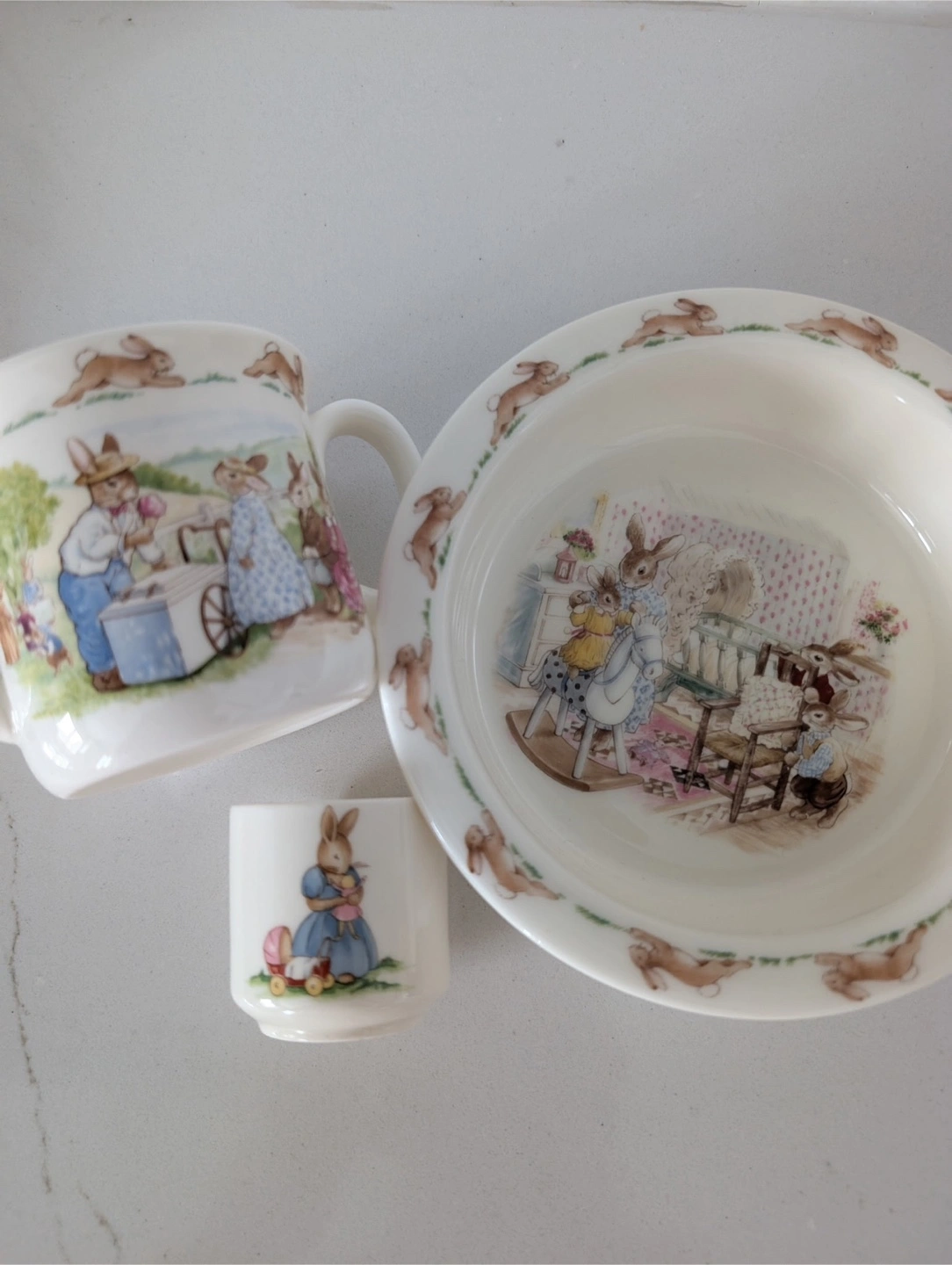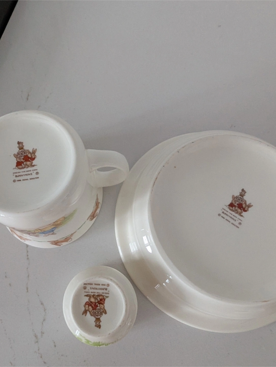 Selling a set of Royal Doulton Bunnykins dishes. Includes a mug, bowl, and small cup. They're in great shape and feature the classic Bunnykins design!