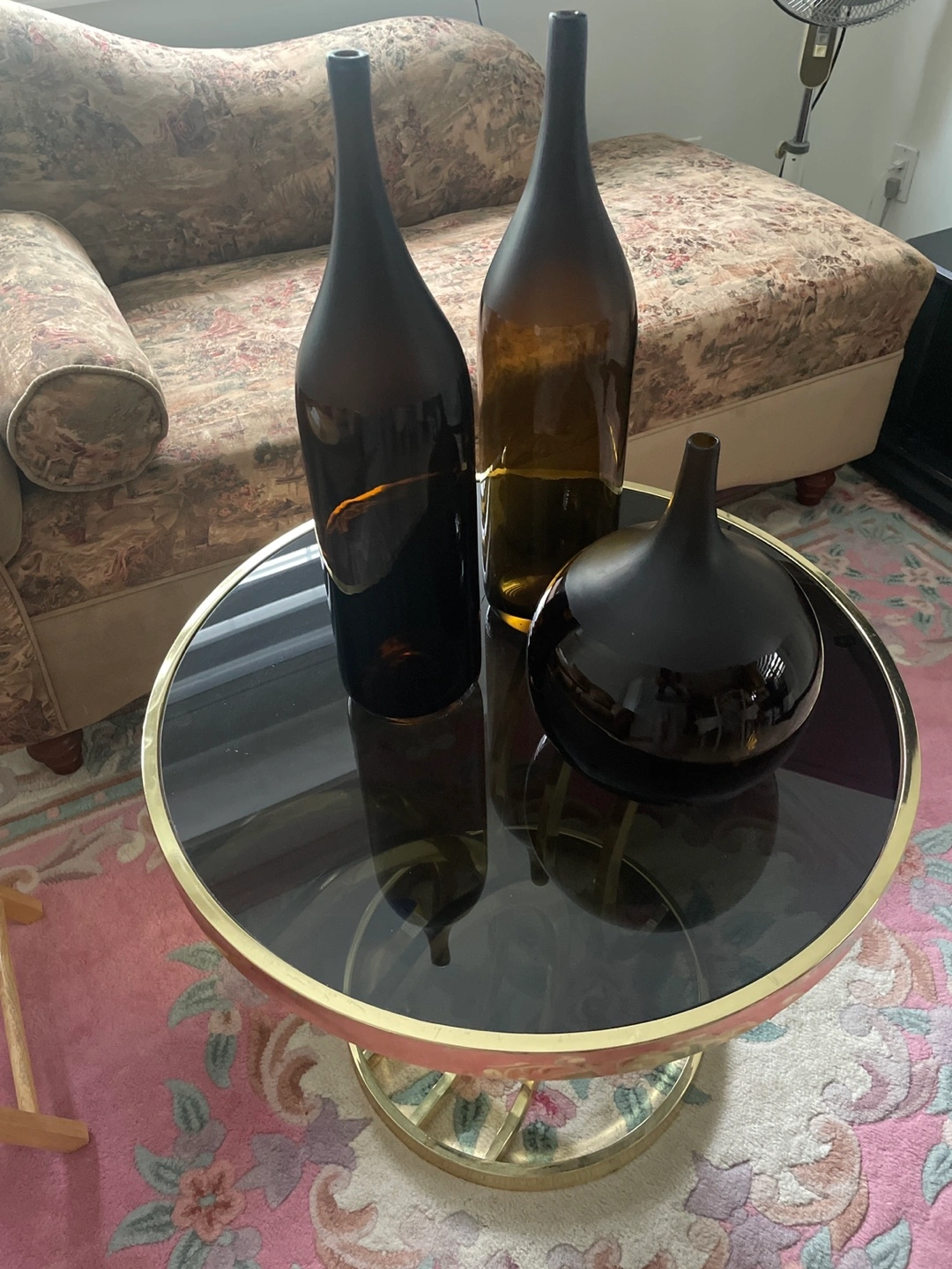 Selling a set of three decorative glass vases. They're in great shape and would look lovely in any home. The vases are varying shapes and sizes, with a dark brown/amber tint. Perfect for adding a touch of elegance to your space!