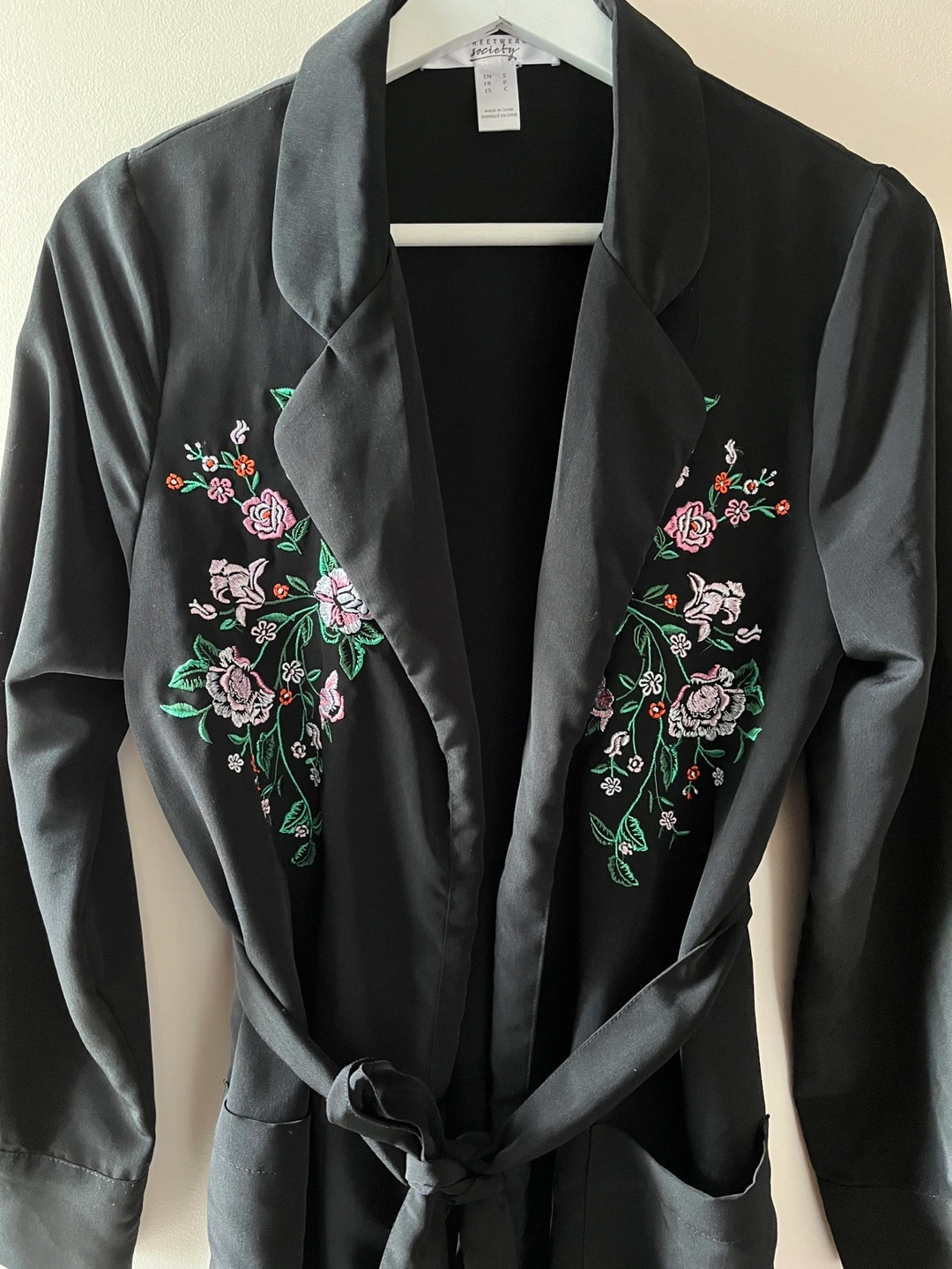 Selling a cute black floral kimono that looks great over jeans and a black top. It features a lovely floral design and a tie waist. Size small. Worn once. Perfect condition.