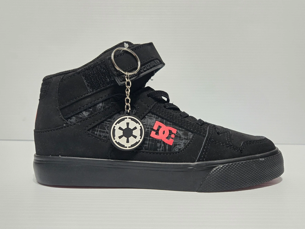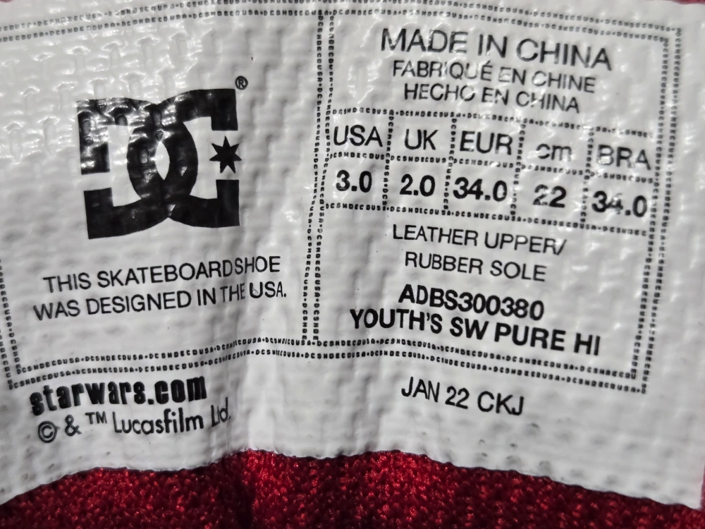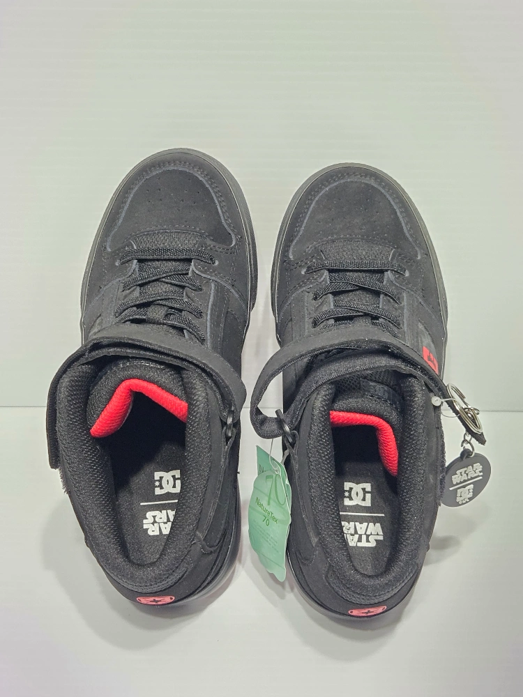 Selling a pair ofnew Star Wars DC Youth's SW Pure Hi skate shoes in size 3 youth big kids(US). These are black with red DC logo accents and a Star Wars themed design. They have a leather upper and rubber sole. Perfect for any young skater or Star Wars fan! 50$