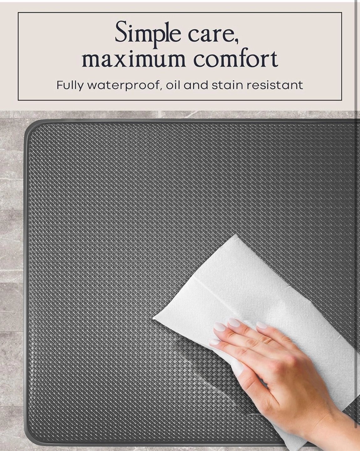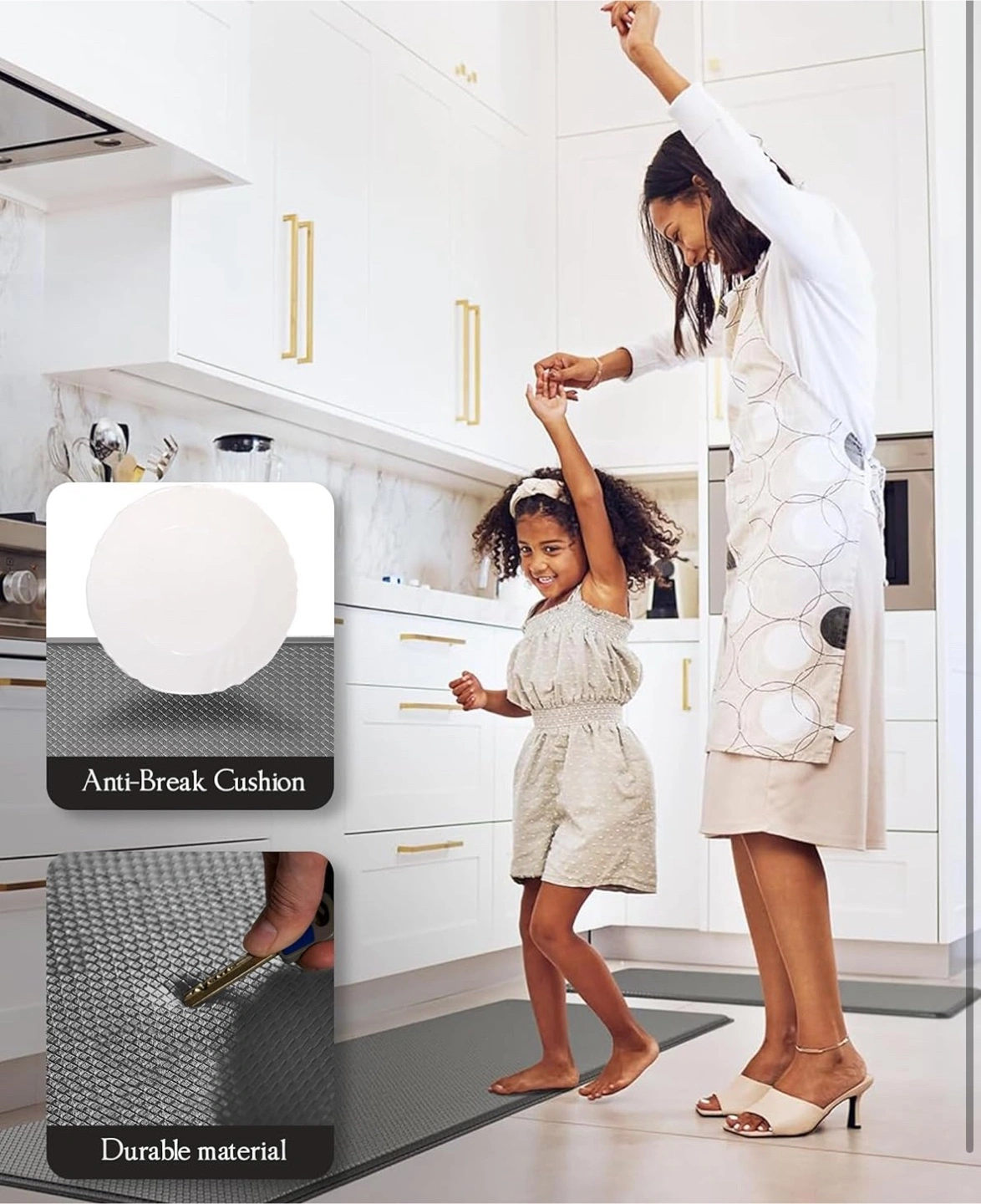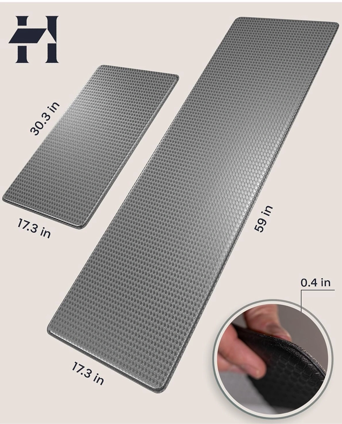 This kitchen mat set is grey and includes two mats. One is 17.3 in x 30.3 in and the other is 17.3 in x 59 in. They are extra soft, reduce fatigue by evenly distributing pressure, and have a non-slip backing for additional stability. They also feature an anti-break cushion and are made of durable material
