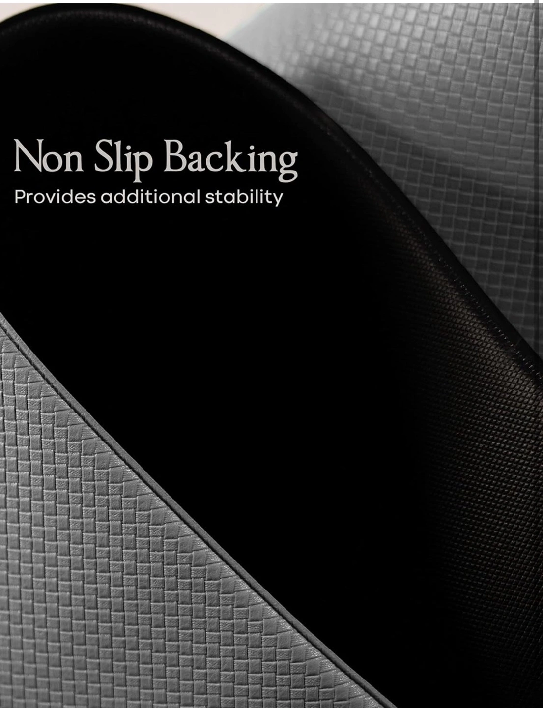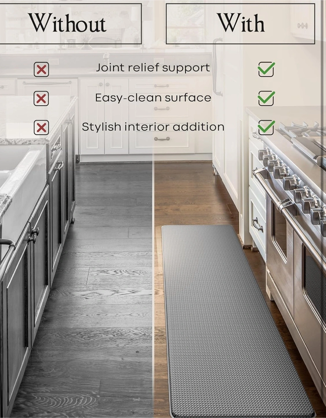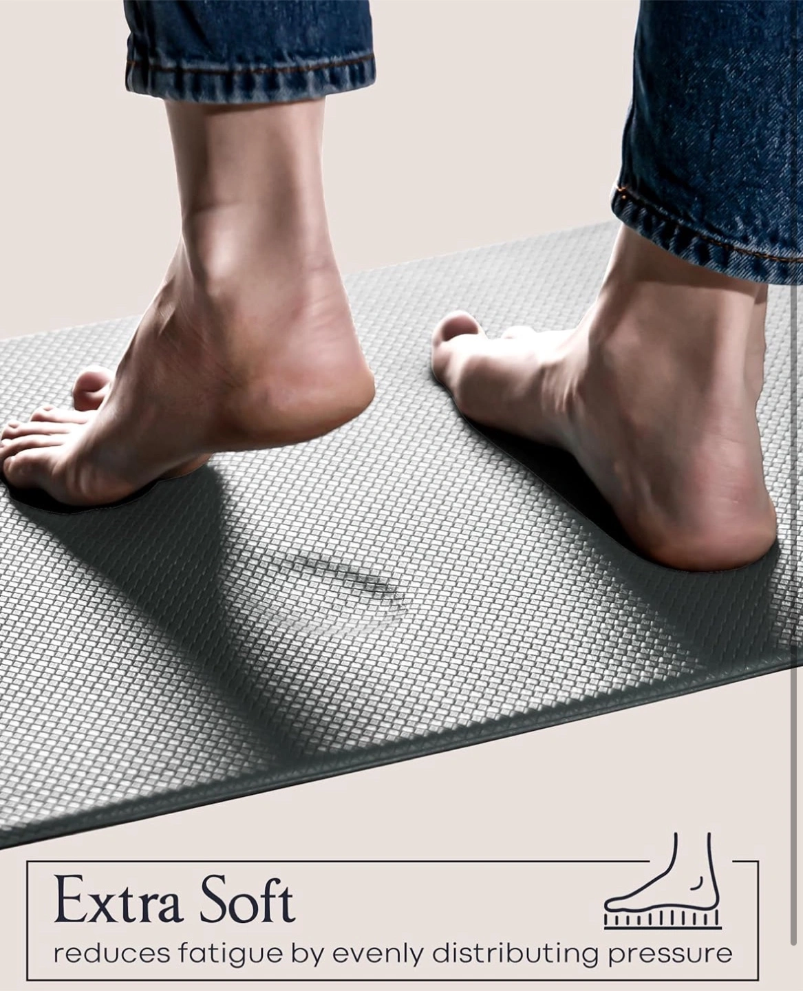 This kitchen mat set is grey and includes two mats. One is 17.3 in x 30.3 in and the other is 17.3 in x 59 in. They are extra soft, reduce fatigue by evenly distributing pressure, and have a non-slip backing for additional stability. They also feature an anti-break cushion and are made of durable material