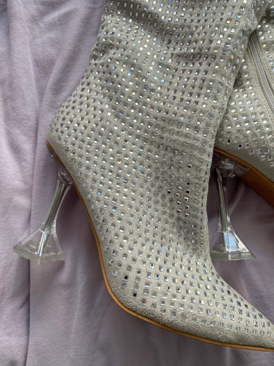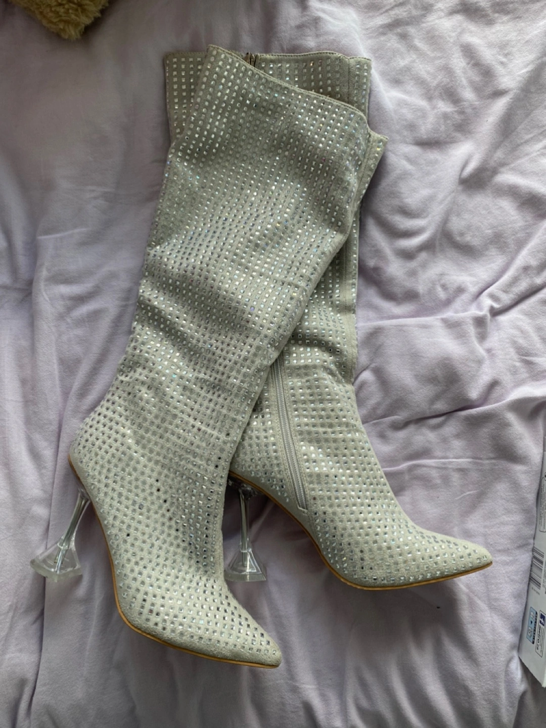 These are a pair of knee-high boots with a pointed toe and a clear stiletto heel. They're covered in small rhinestones, giving them a sparkly look! They have a zipper closure on the side. Only worn outside once so still in great condition.