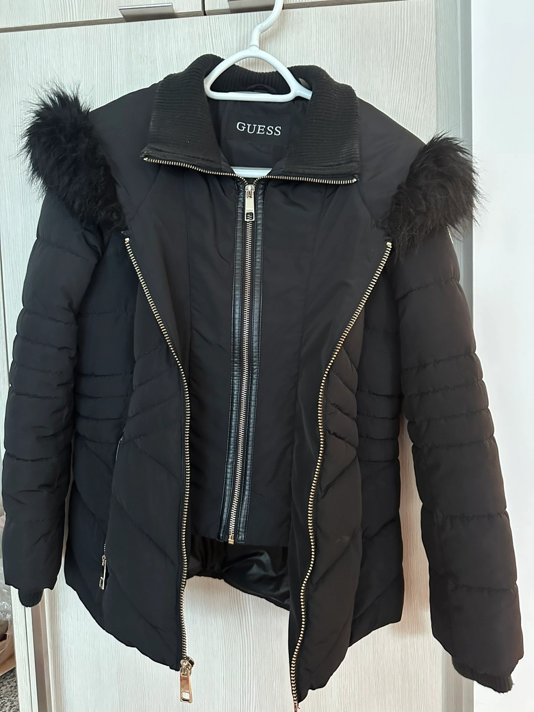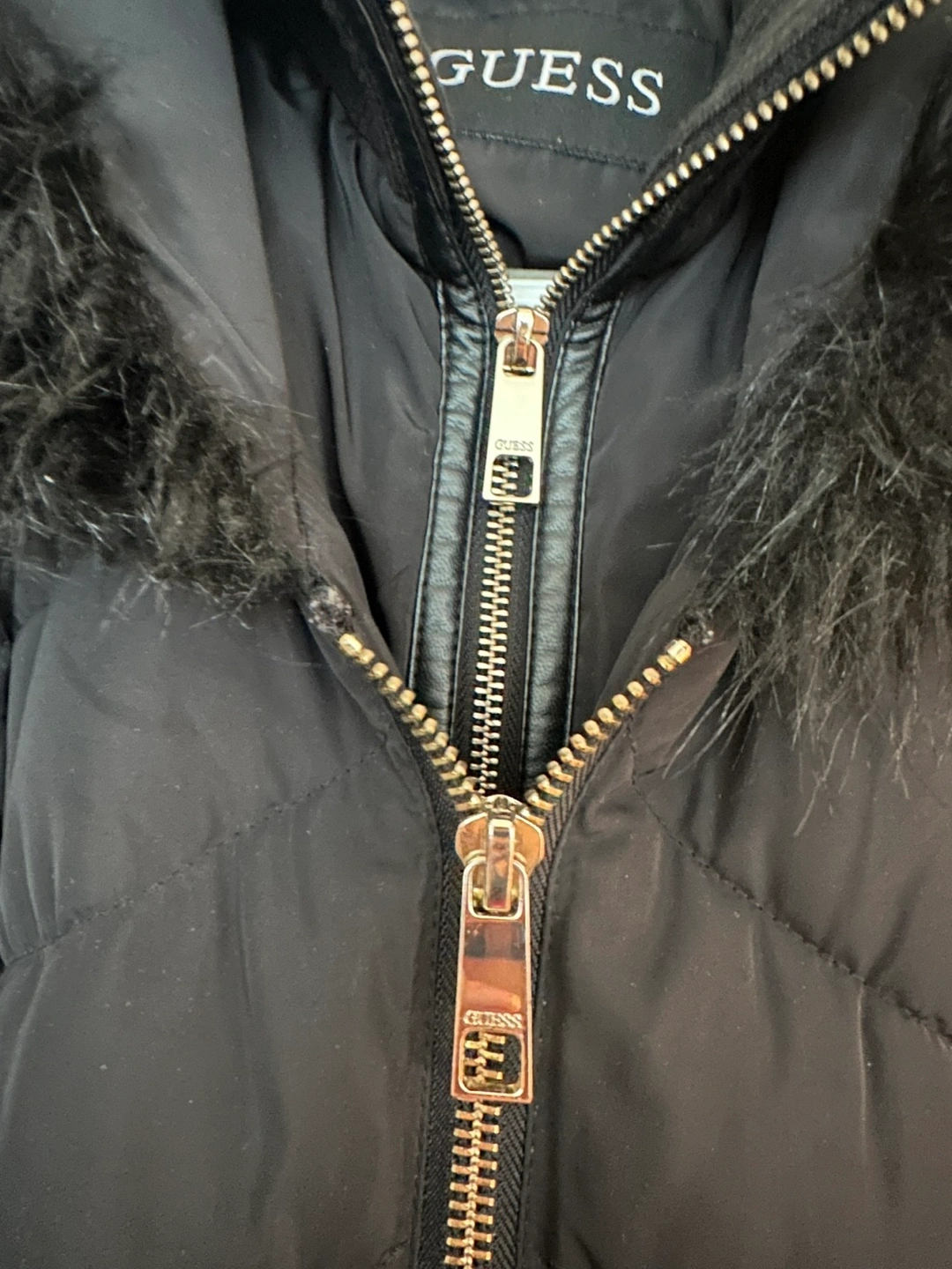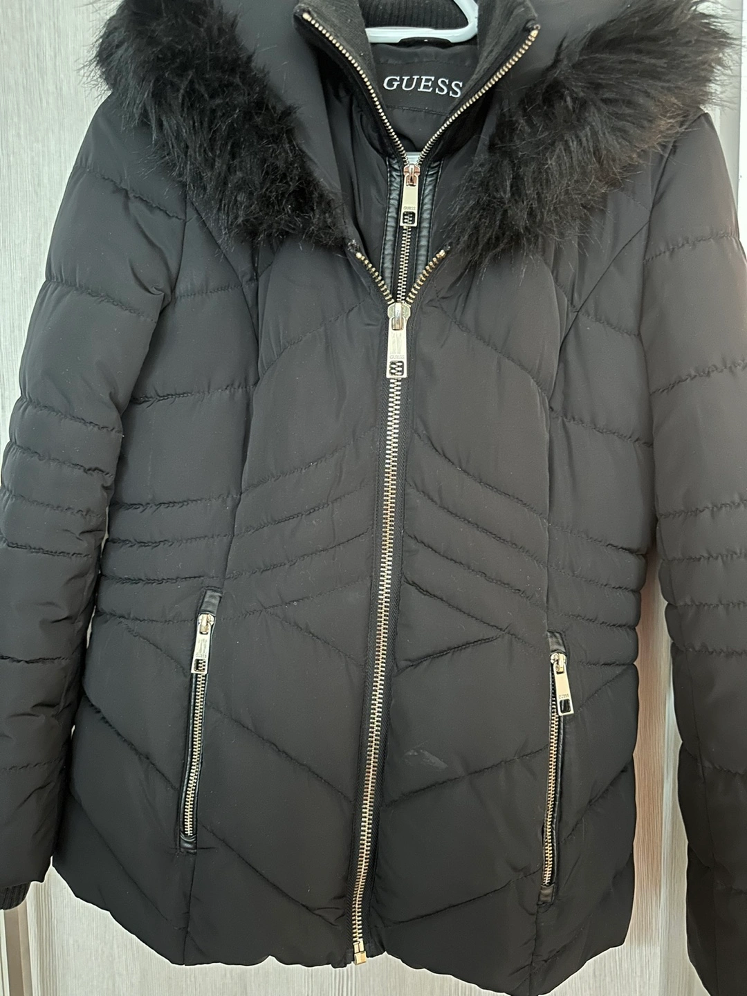 Selling a Guess black puffer coat in size small. It's in great condition and perfect for the colder weather! Dry clean only. Made with polyester fibres.