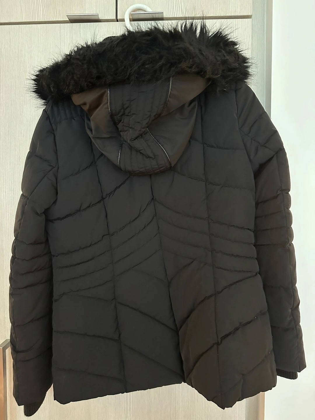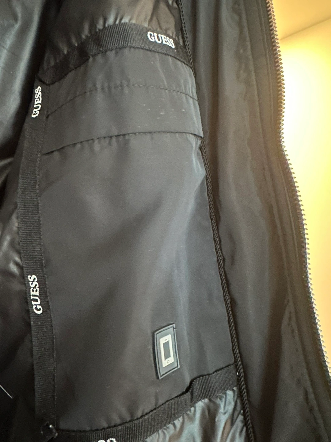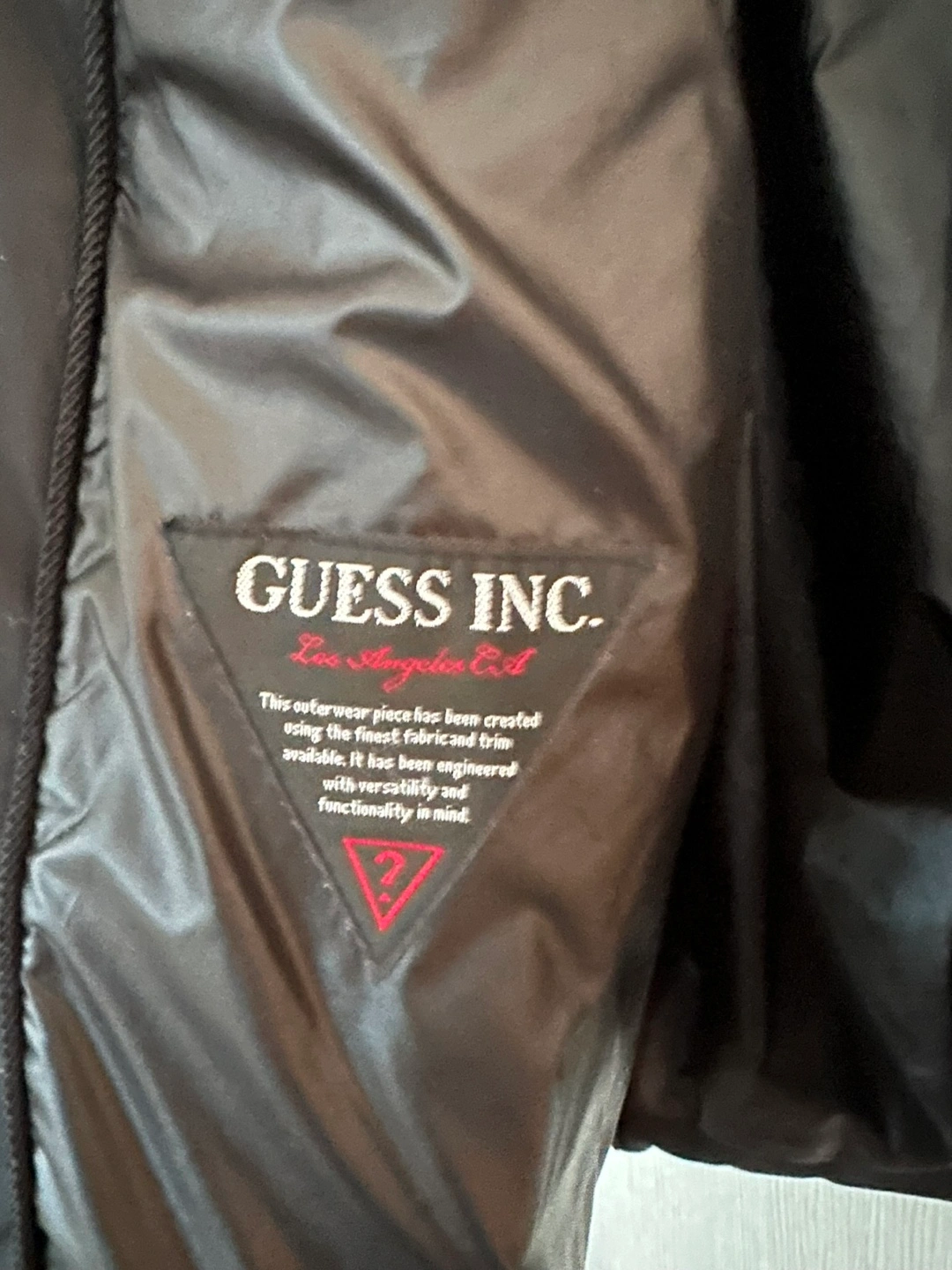 Selling a Guess black puffer coat in size small. It's in great condition and perfect for the colder weather! Dry clean only. Made with polyester fibres.