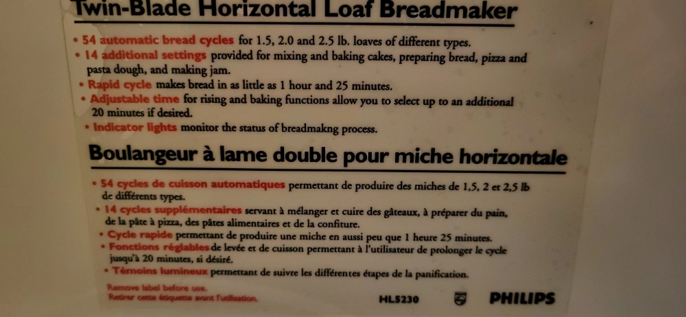 Selling a Philips Twin-Blade Horizontal Loaf Breadmaker. Approximately 17" L x 9.5" W x 1' H. Has 54 automatic bread cycles for 1.5, 2.0, and 2.5 lb loaves. There are also 14 additional settings for mixing and baking cakes, preparing bread, pizza and pasta dough, and making jam. Rapid cycle makes bread in as little as 1 hour and 25 minutes. Adjustable time for rising and baking functions allow you to select up to an additional 20 minutes if desired. Indicator lights monitor the status of the breadmaking process