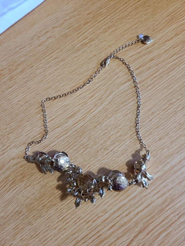 Selling a Betsey Johnson rose necklace. It features a beautiful design with purple and clear stones. It's in great condition!