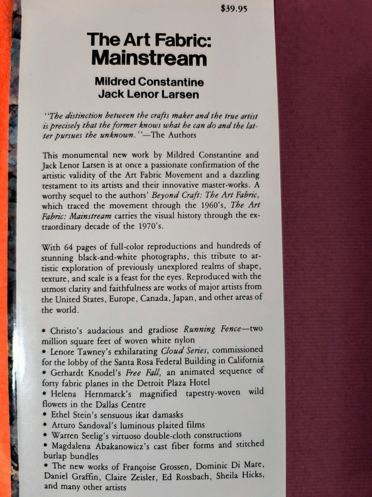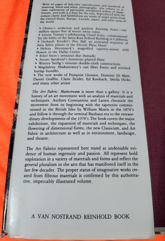"The Art Fabric: Mainstream" by Mildred Constantine and Jack Lenor Larsen. A fascinating look at fabric art, from around the world. many high resolution photos & glossy print. *15 inches tall × 11 wide* There is slight tear (as shown in photos) on the book jacket, otherwise in excellent condition. This harder to find look into Fabric art is interesting and collectable for any art lover. ** Pick Up In Kentville **
