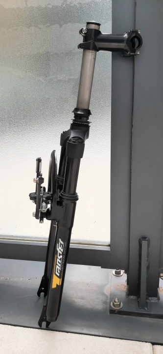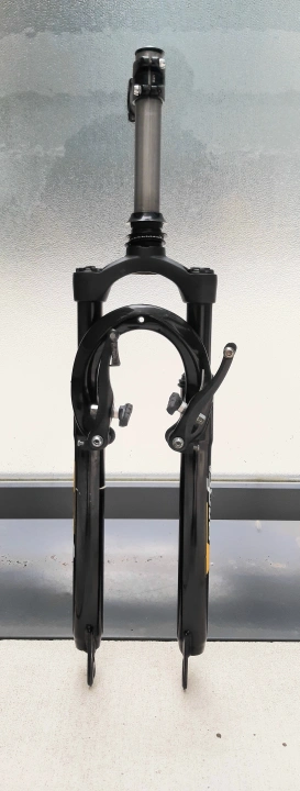 Selling a TRANSFER suspension fork for a bicycle. It's black and in good condition, ready to be installed on your bike