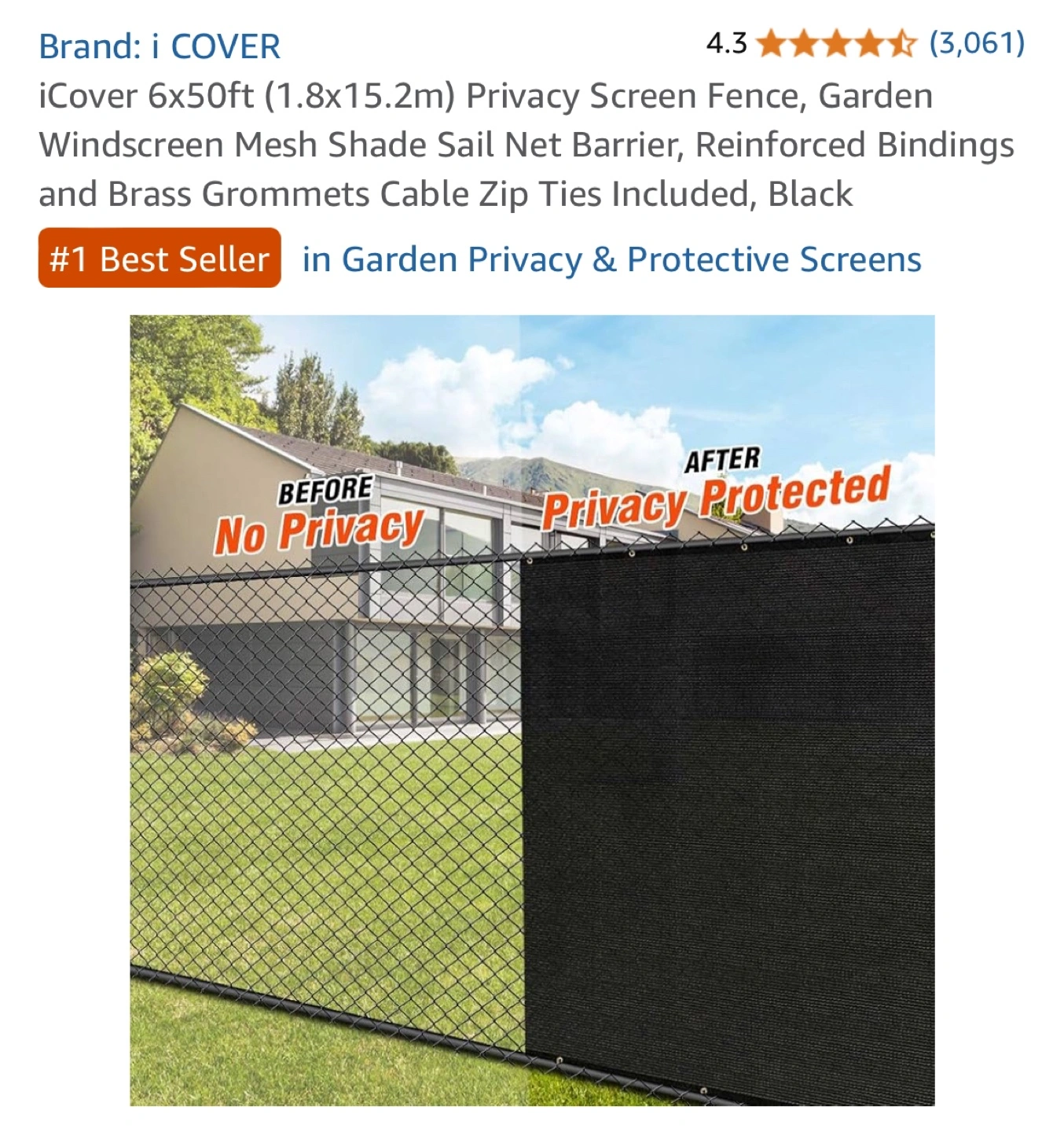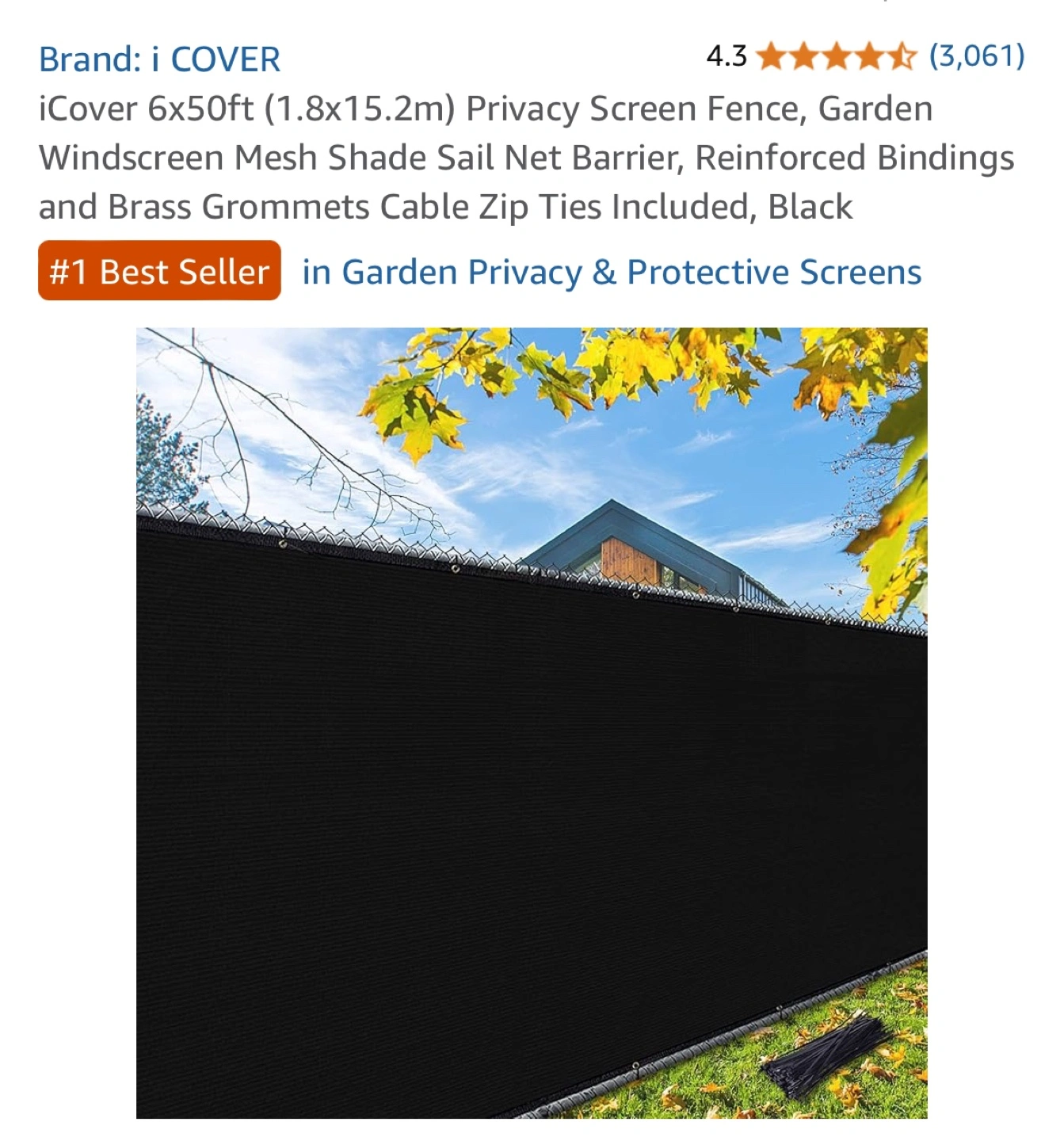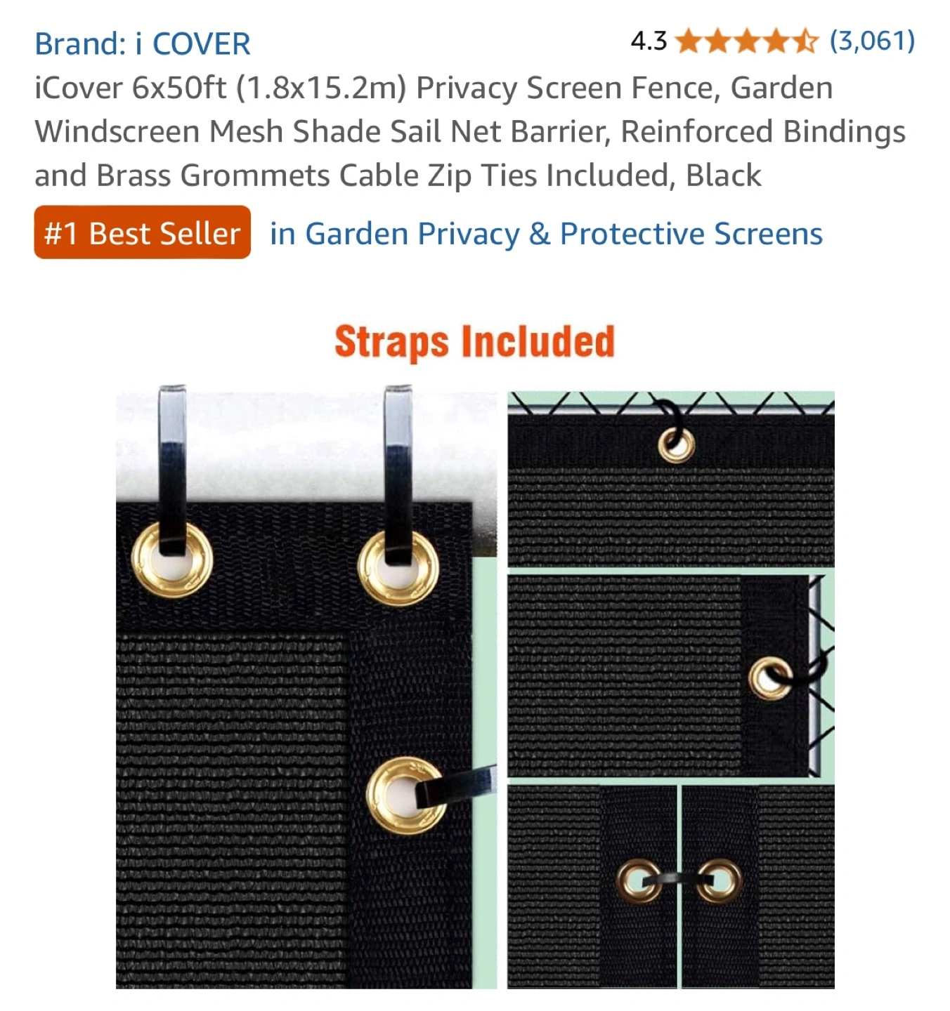 Looking to add some privacy to your yard or garden? This iCover privacy screen is just what you need! It's 6x50ft (1.8x15.2m) and made of garden windscreen mesh shade sail net barrier material. It also comes with reinforced bindings and brass grommets, plus cable zip ties for easy installation. A #1 Best Seller in Garden Privacy & Protective Screens!