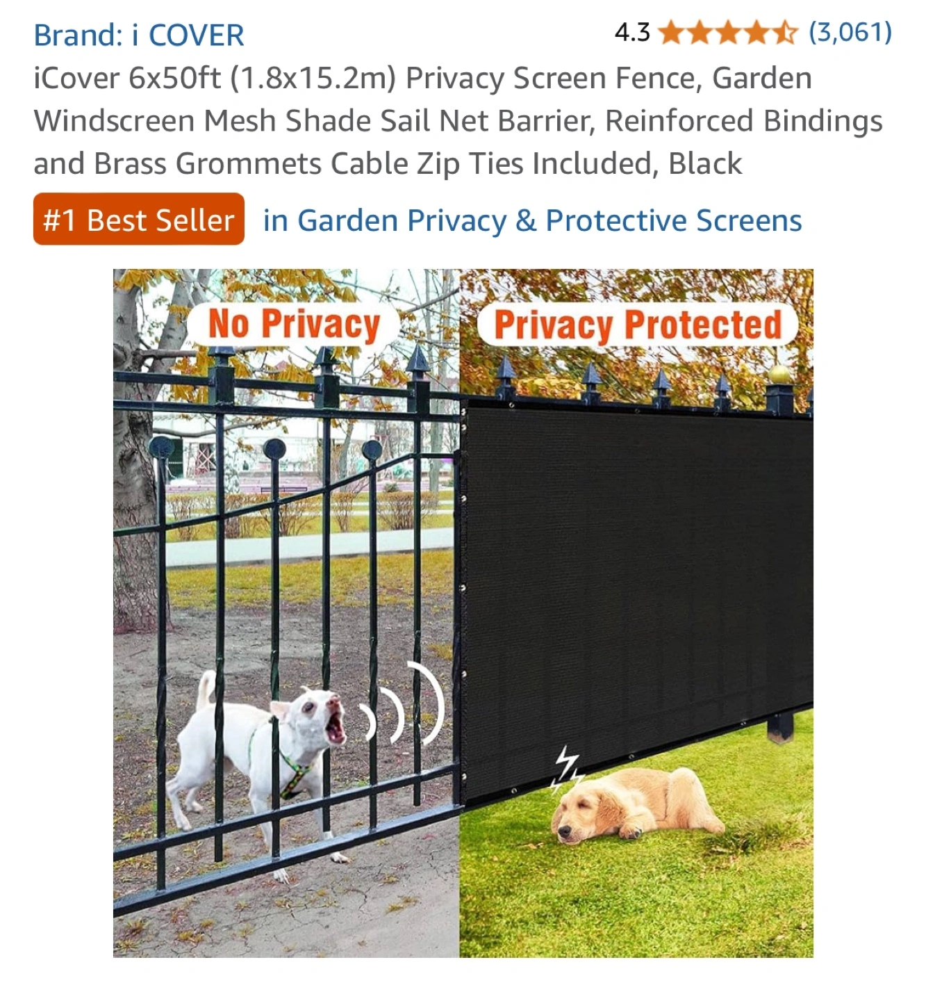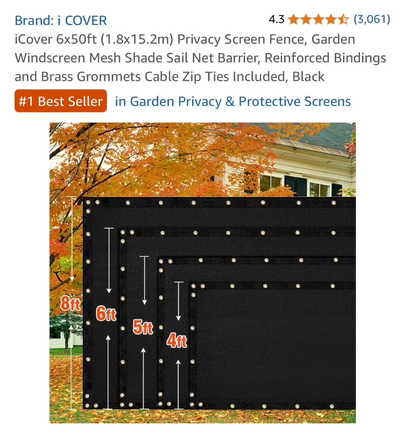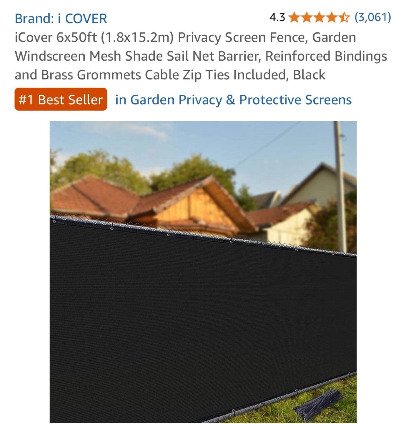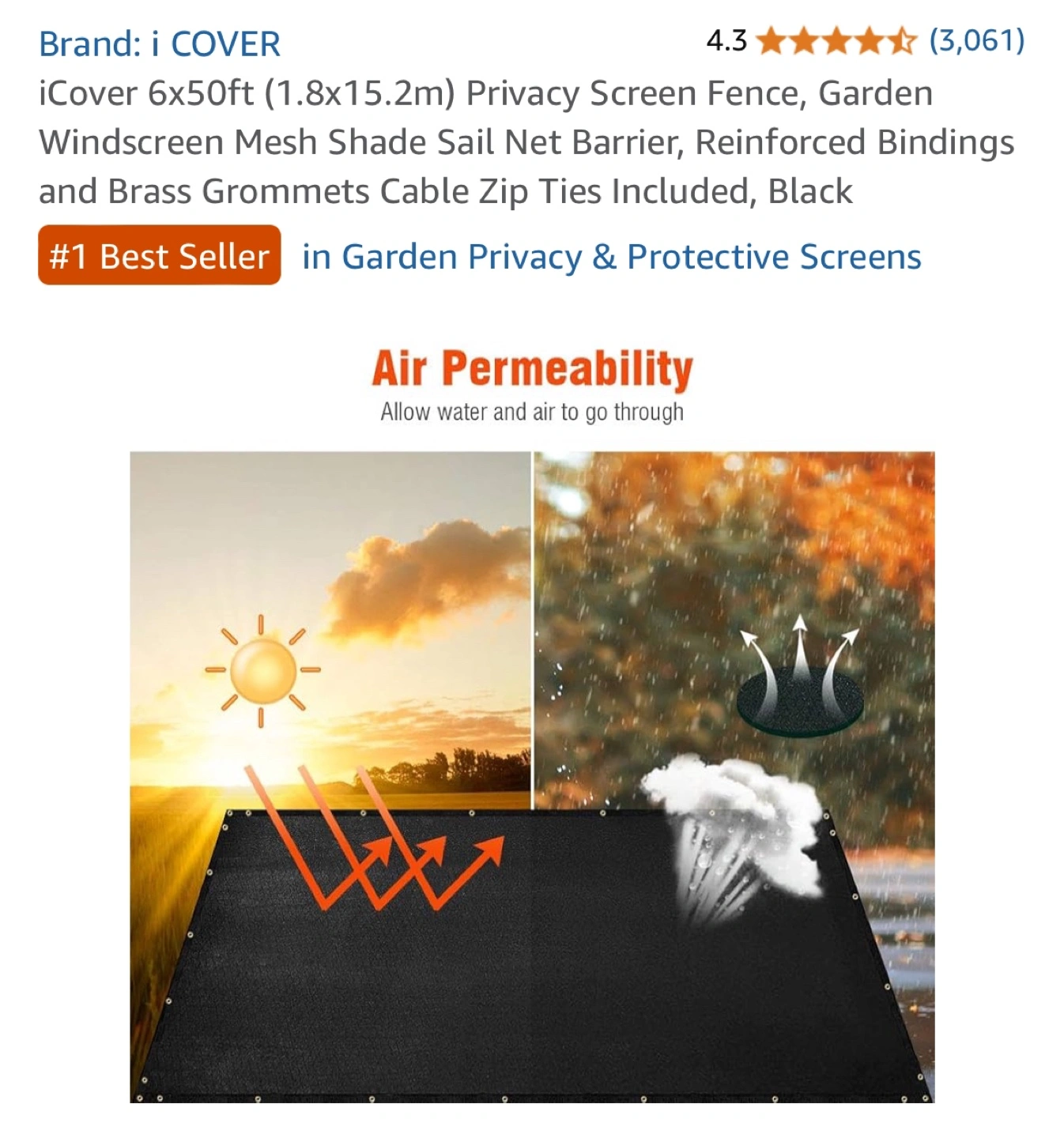 Looking to add some privacy to your yard or garden? This iCover privacy screen is just what you need! It's 6x50ft (1.8x15.2m) and made of garden windscreen mesh shade sail net barrier material. It also comes with reinforced bindings and brass grommets, plus cable zip ties for easy installation. A #1 Best Seller in Garden Privacy & Protective Screens!