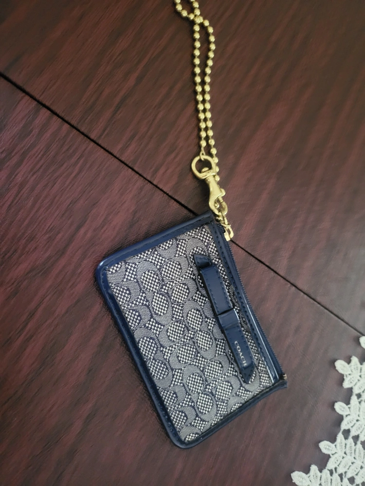 Selling a cute Coach card holder! It's in great condition and perfect for keeping your cards organized. It features a zippered compartment and a clear window for your ID. The navy colour is super versatile