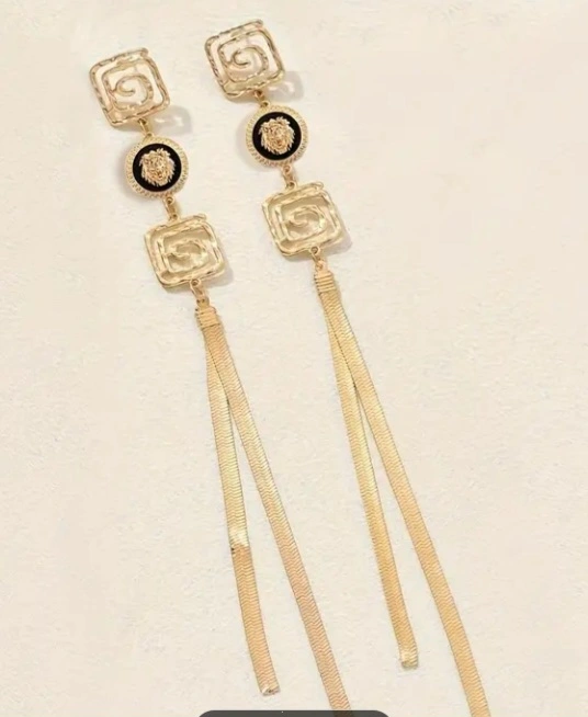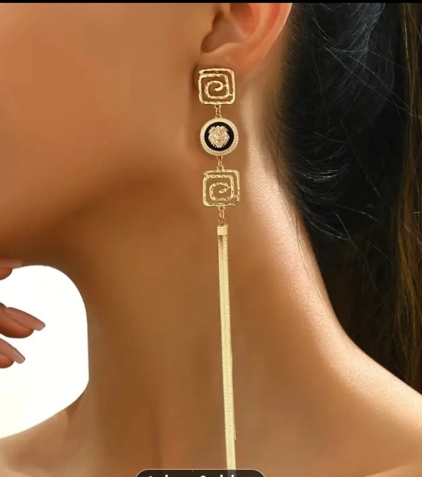 Selling a pair of gold tone dangle earrings. They have a unique design with square and circle elements. The earrings are about 6.5 inches long.