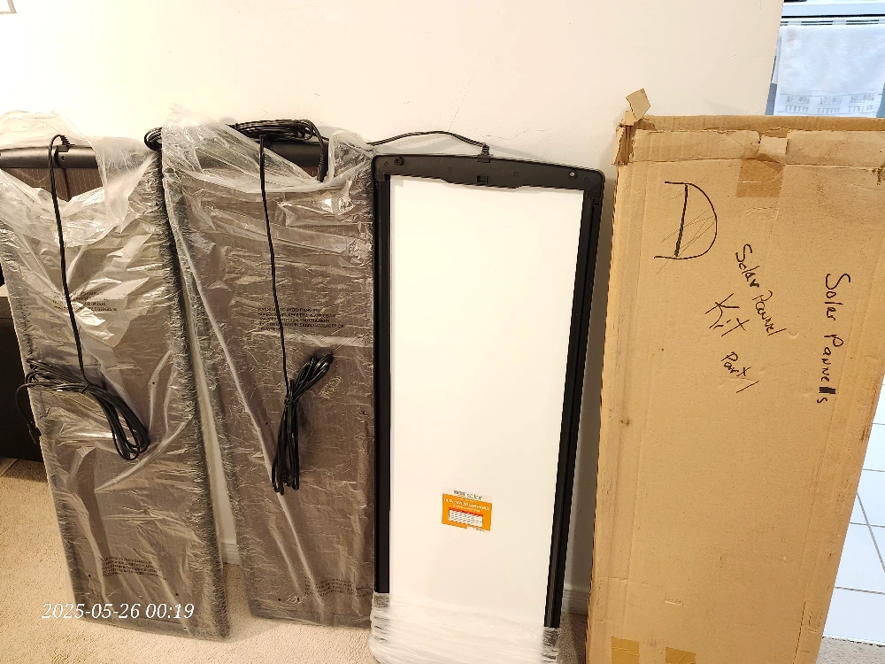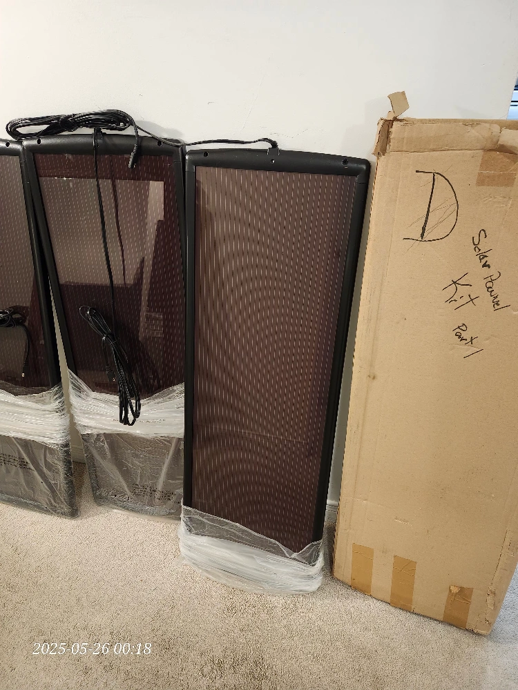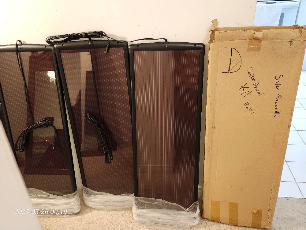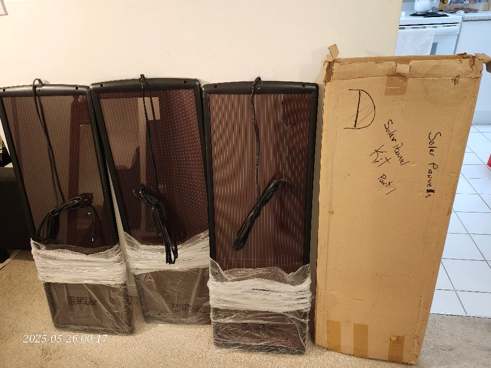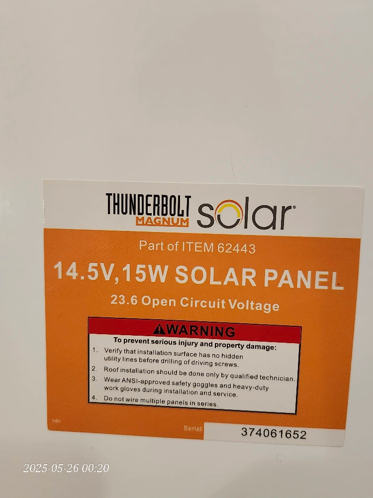 New Thunderbolt Solar Magnum 14.5V, 15W solar panel. It has a 23.6 Open Circuit Voltage. The part number is ITEM 62443. Comes with the original box A pack of 3 panel Power cord has two wire plug with 13 1/feet of heavy duty UV resistant insulation. 13"x38"x1/2"