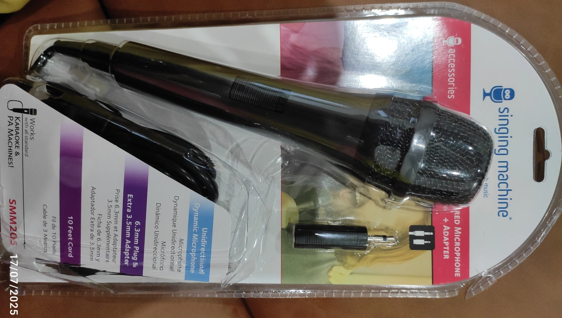 Selling a brand new Singing Machine SMM205 wired microphone! It comes with a 6.3mm plug and an extra 3.5mm adapter. It also works with all standard karaoke and PA machines. The cord is 10 feet long. totally new in packing