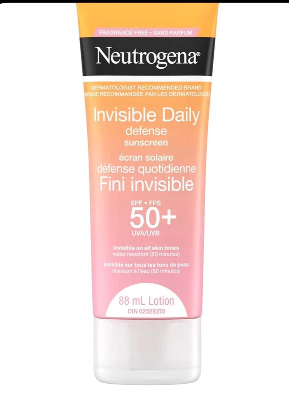 Selling a tube of Neutrogena Invisible Daily Defense Sunscreen with SPF 50+ It's fragrance-free and helps protect your skin from UVA/UVB rays. It's also water-resistant for up to 80 minutes and invisible on all skin tones. The bottle contains 88 mL of lotion