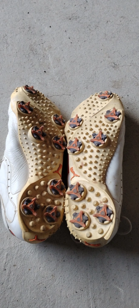 Selling a pair of Puma golf shoes! They are white leather with orange accents and marked as a US size 8. They show some wear and could use a bit of cleaning, but still have lots of life left for the golf course.