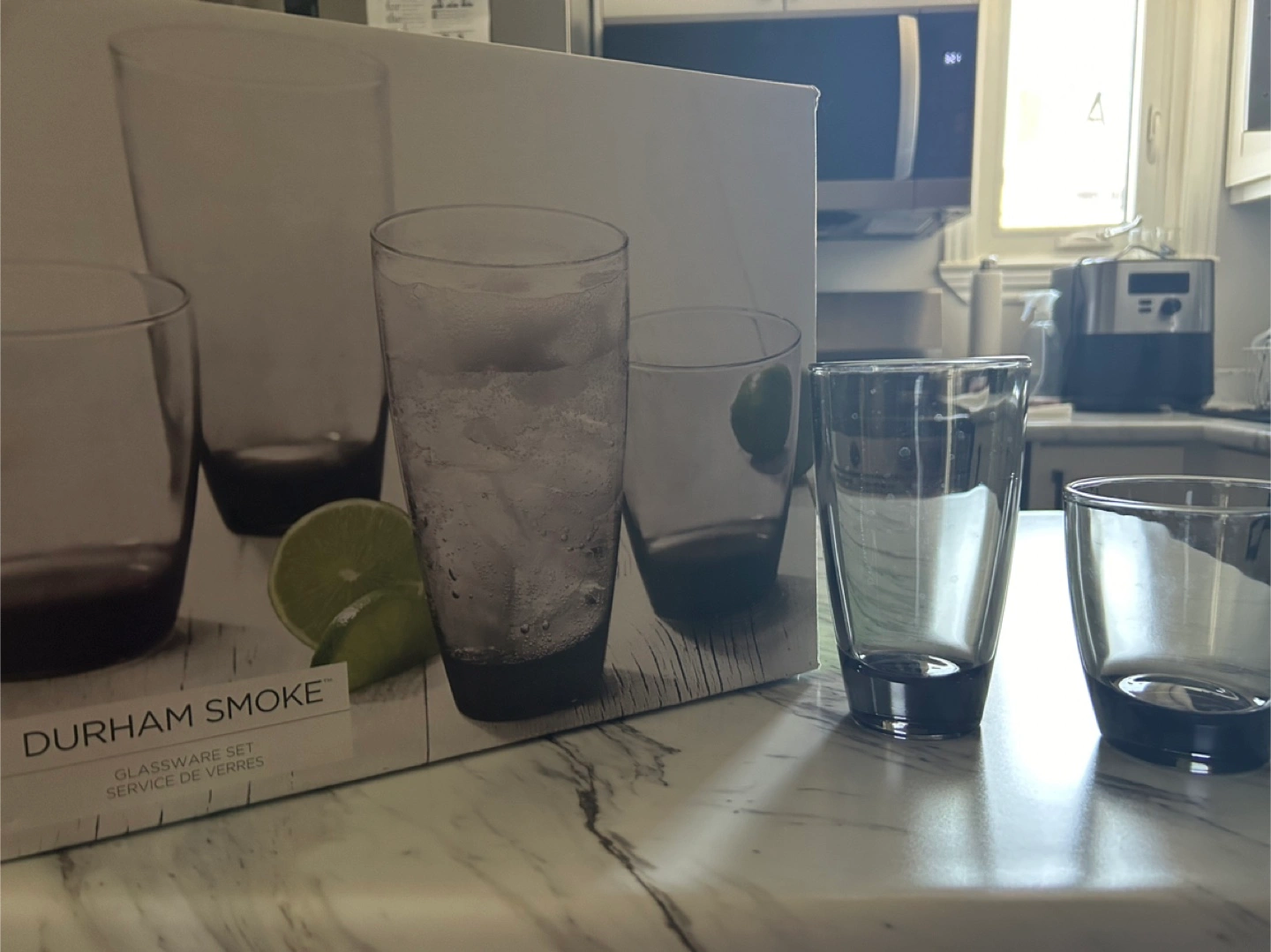 Durham Smoke glassware set available! These glasses are in great condition and ready to add a touch of elegance to your kitchen or dining area. Perfect for everyday use or special occasions. 4 Tall 4 Short 8 Glasses Total