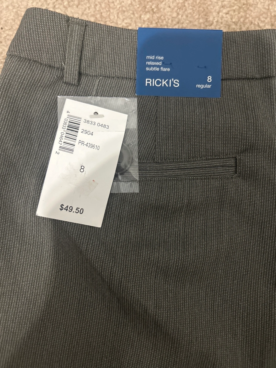 These are a pair of RICKI'S pants in size 8. They have a mid rise and a relaxed, subtle flare cut. They're a stylish grey colour and have the original tag still attached. Originally bought for $49.50