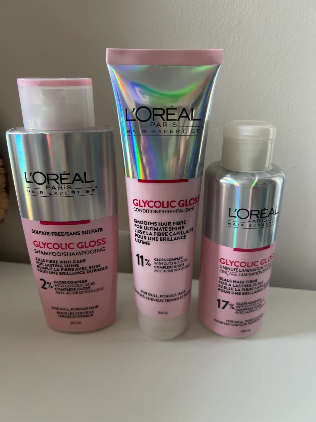 Selling a L'Oréal Paris Hair Expertise Glycolic Gloss set! It includes: - Glycolic Gloss Shampoo (280 ml) - Glycolic Gloss Conditioner (150 ml) - Glycolic Gloss 5 Minute Lamination Treatment (200 ml) Perfect for dull, porous hair to fill fibres with lasting shine and create a smooth surface $15 for the whole set
