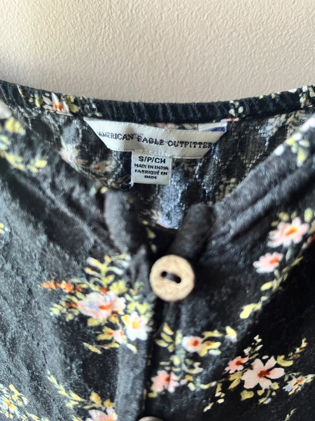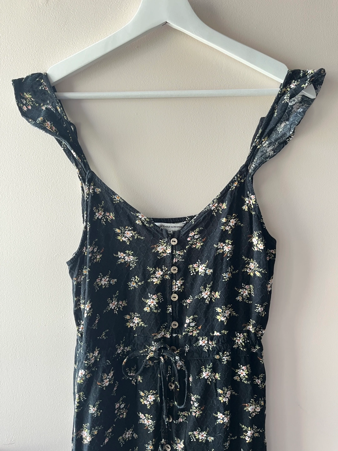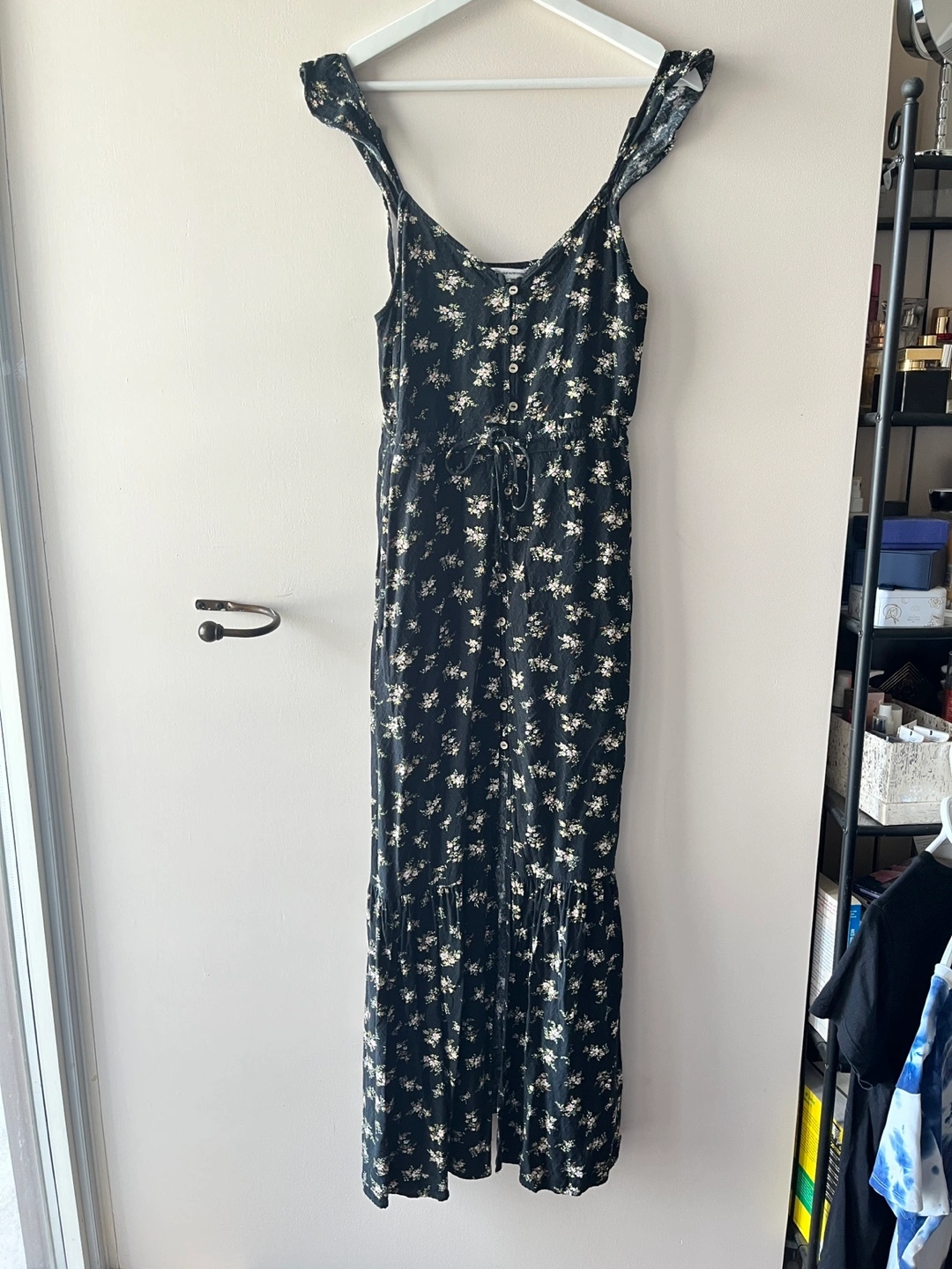 Cute American Eagle Outfitters floral maxi dress in size small. It's in great condition and features a lovely floral pattern on a black background. Perfect for a casual day out!