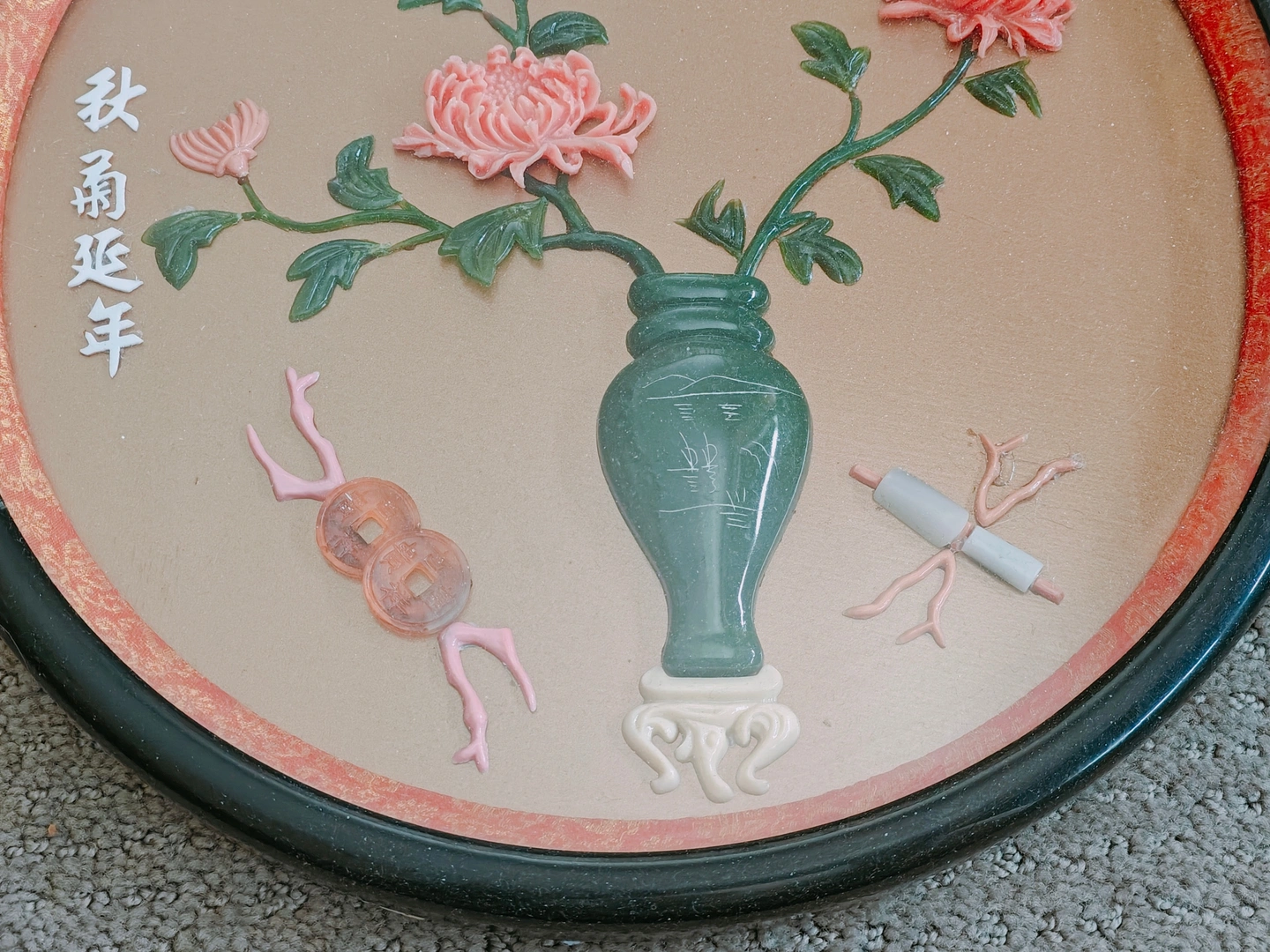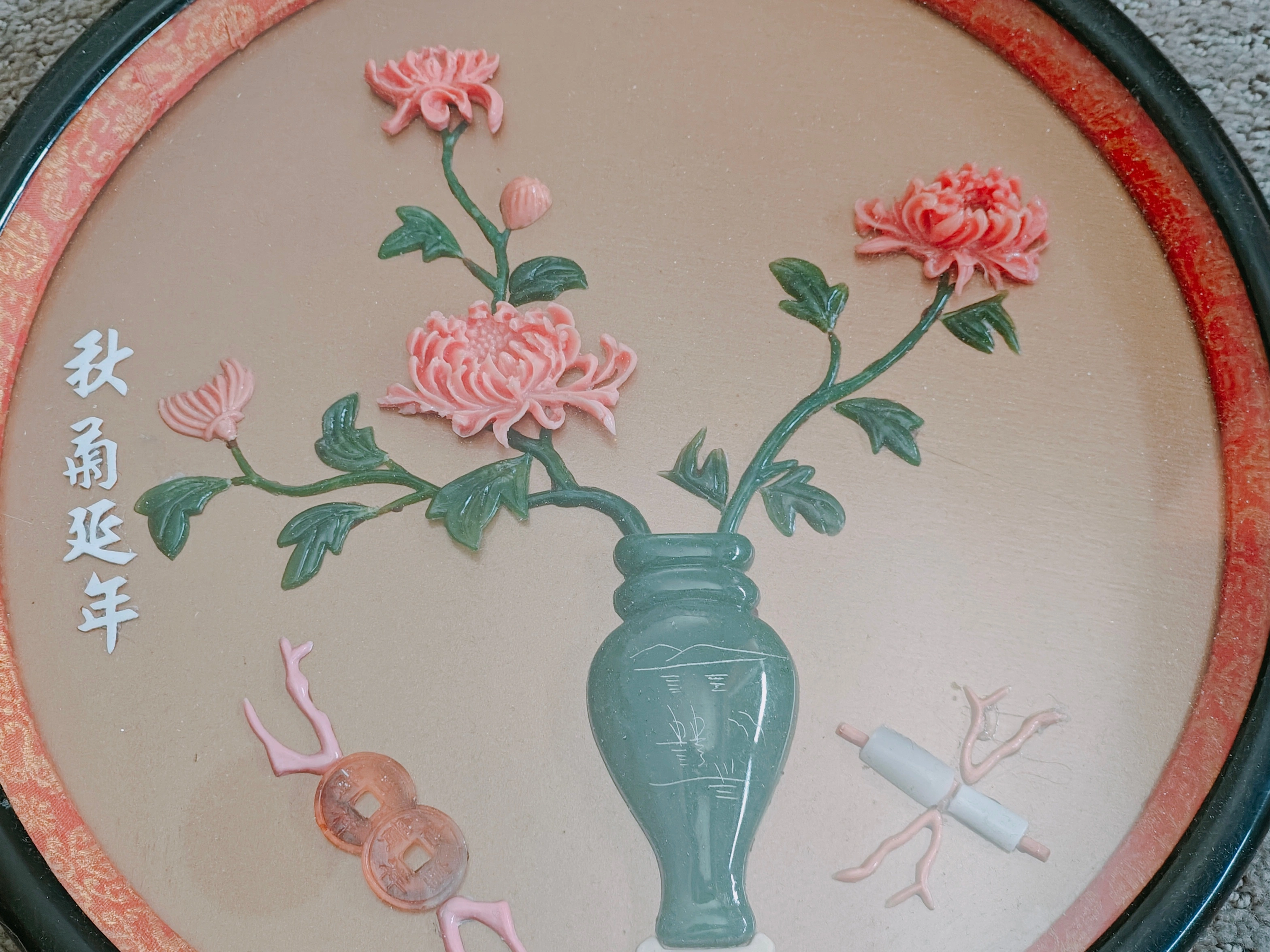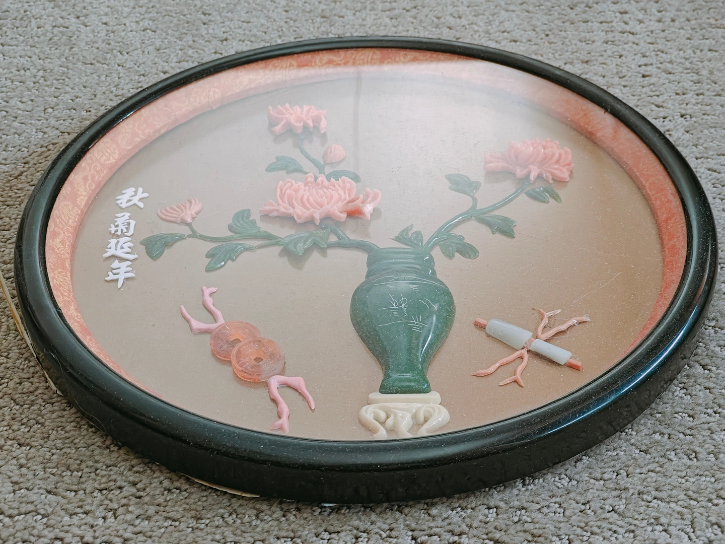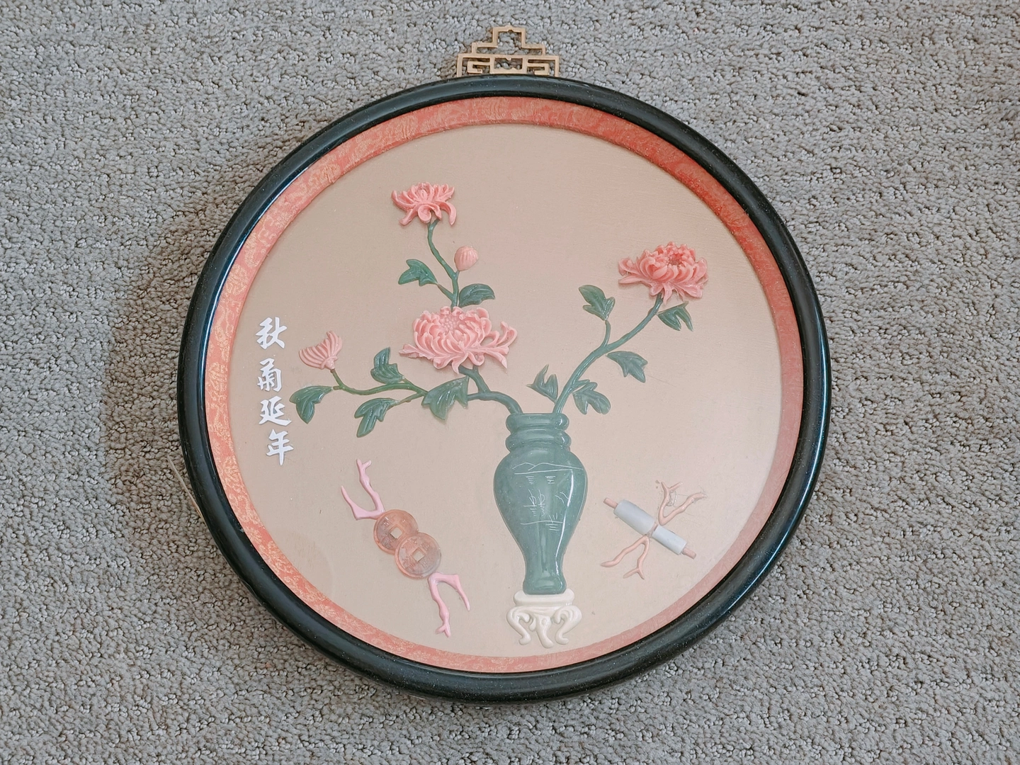 I am selling a 12" Vintage Chinese Asian Power Pot Wall Plaque Art Hanging Framed with Carved Imitation Jade in the shape of a flower plant in used, good condition. Round framed imitation jade vase, stems, and flowers. The figurine under the glass is 3D. Has Asian writing figures. The background is gold with an orange band border. Black plastic frame with glass cover. Brass hangers. Great condition! Dimensions: * Diameter: 12" * Frame Depth: 7/8" Comes from a pet and smoke-free environment. Pickup in Mount Pleasant (NW Calgary)
