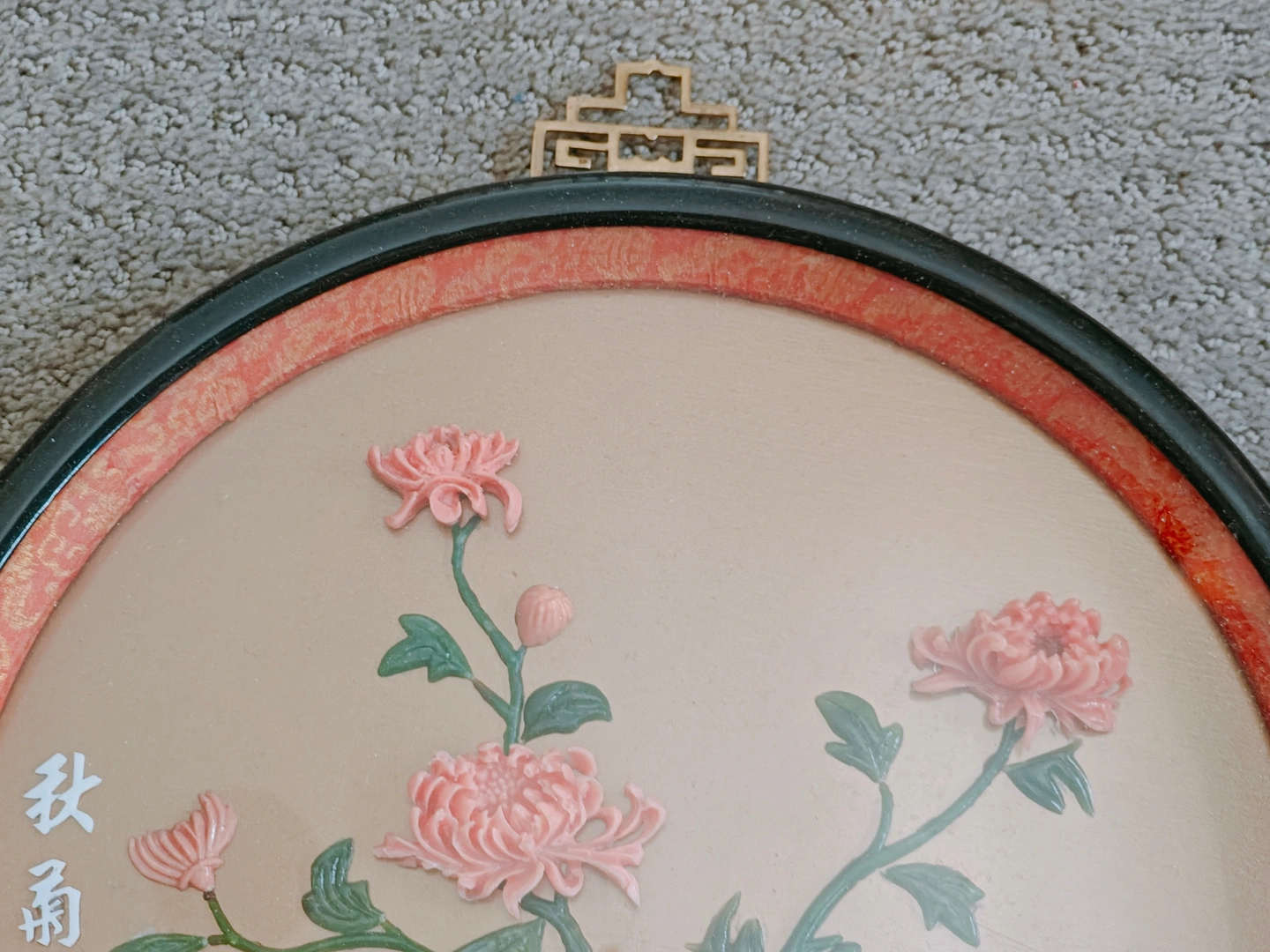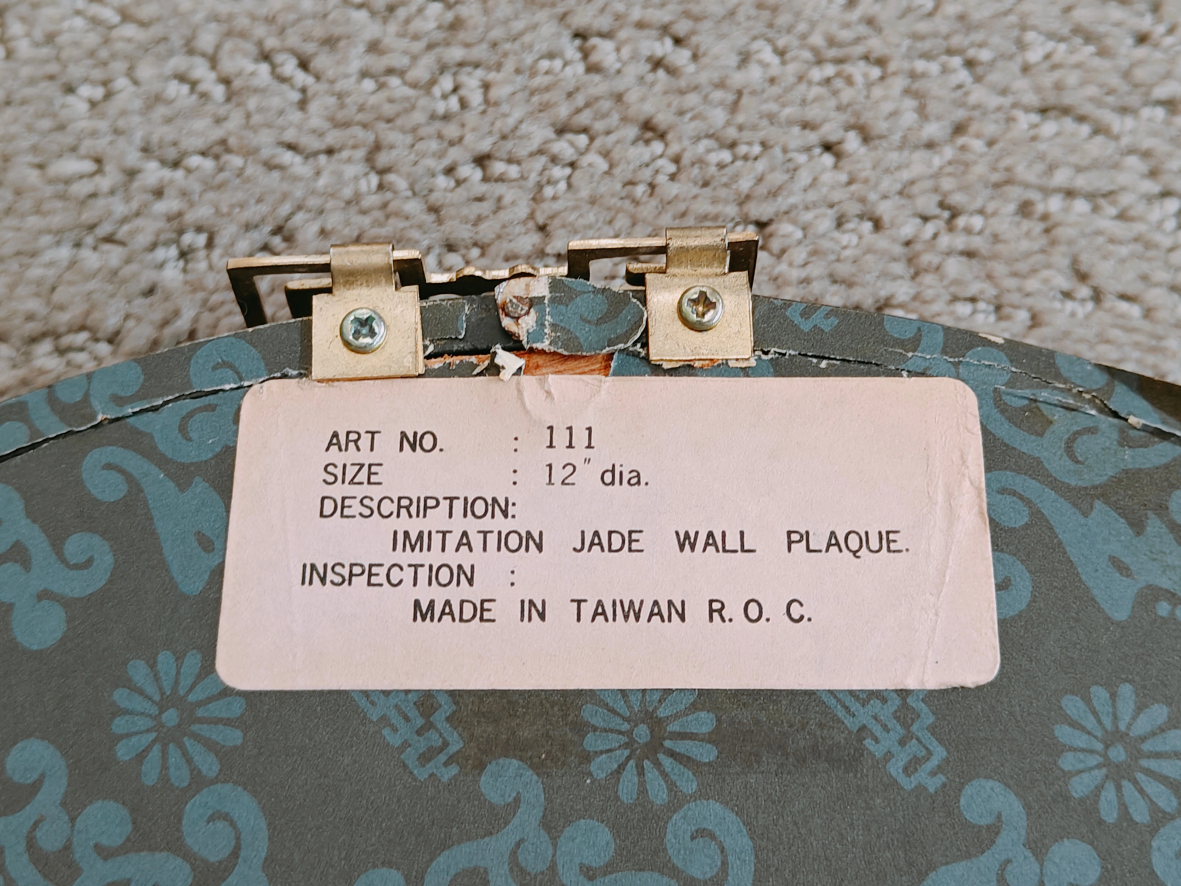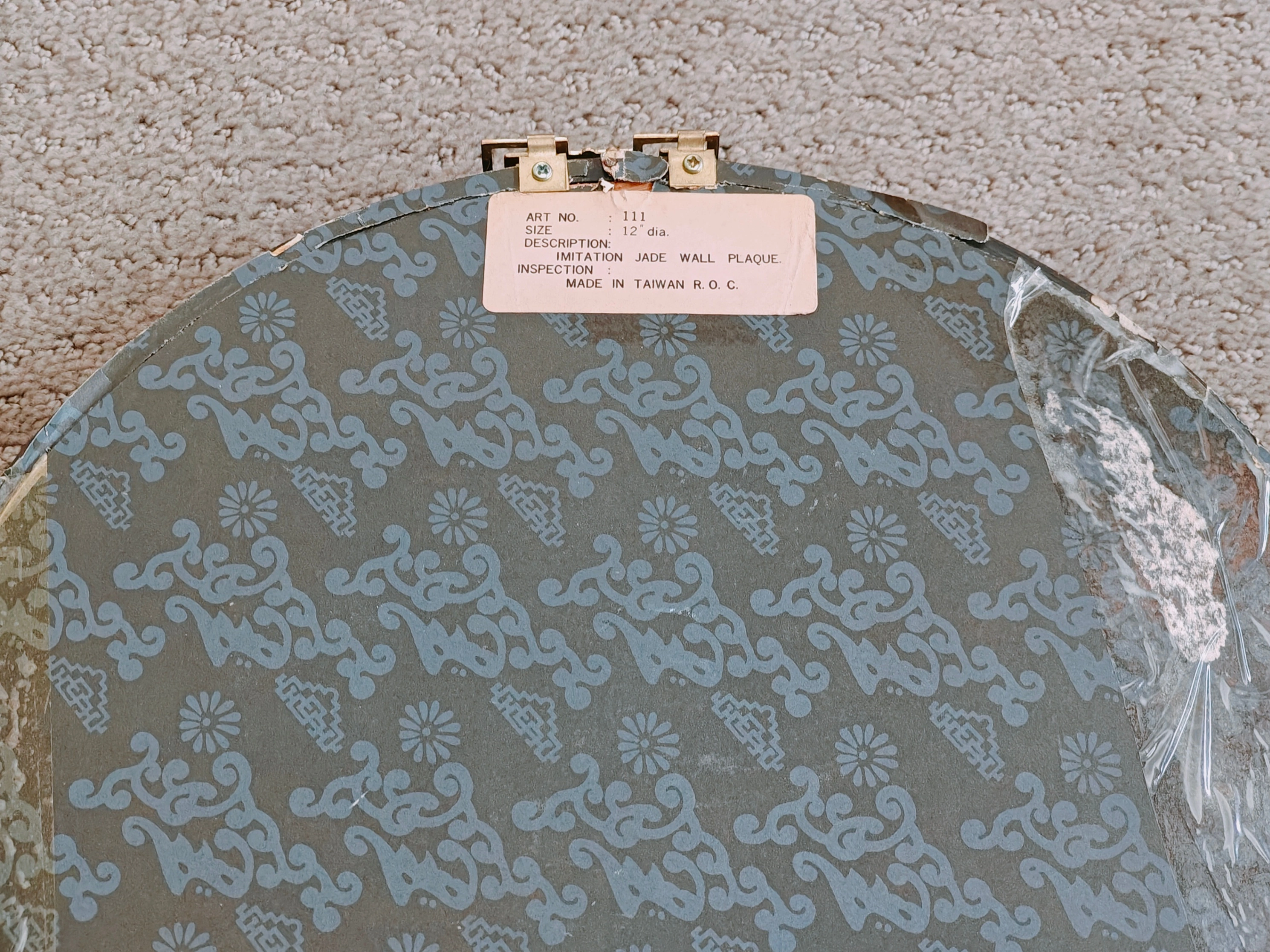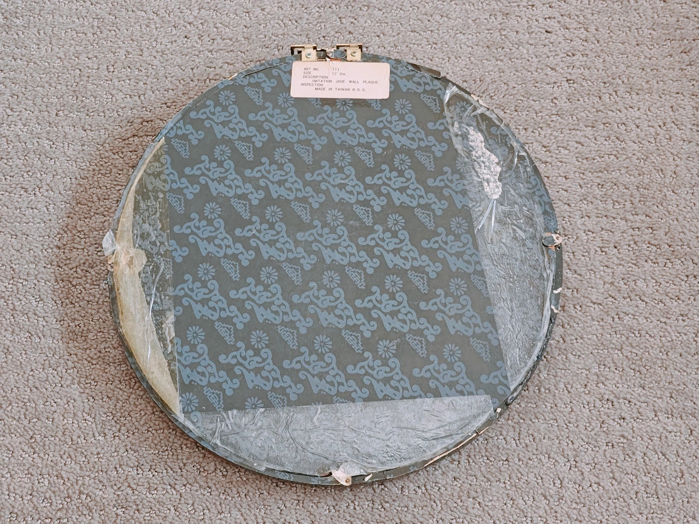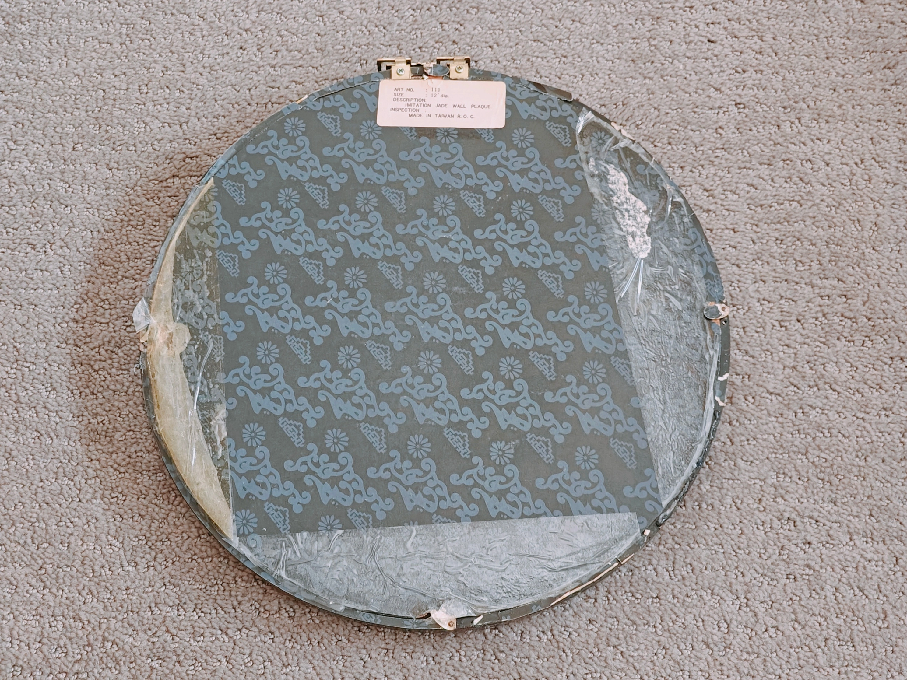 I am selling a 12" Vintage Chinese Asian Power Pot Wall Plaque Art Hanging Framed with Carved Imitation Jade in the shape of a flower plant in used, good condition. Round framed imitation jade vase, stems, and flowers. The figurine under the glass is 3D. Has Asian writing figures. The background is gold with an orange band border. Black plastic frame with glass cover. Brass hangers. Great condition! Dimensions: * Diameter: 12" * Frame Depth: 7/8" Comes from a pet and smoke-free environment. Pickup in Mount Pleasant (NW Calgary)