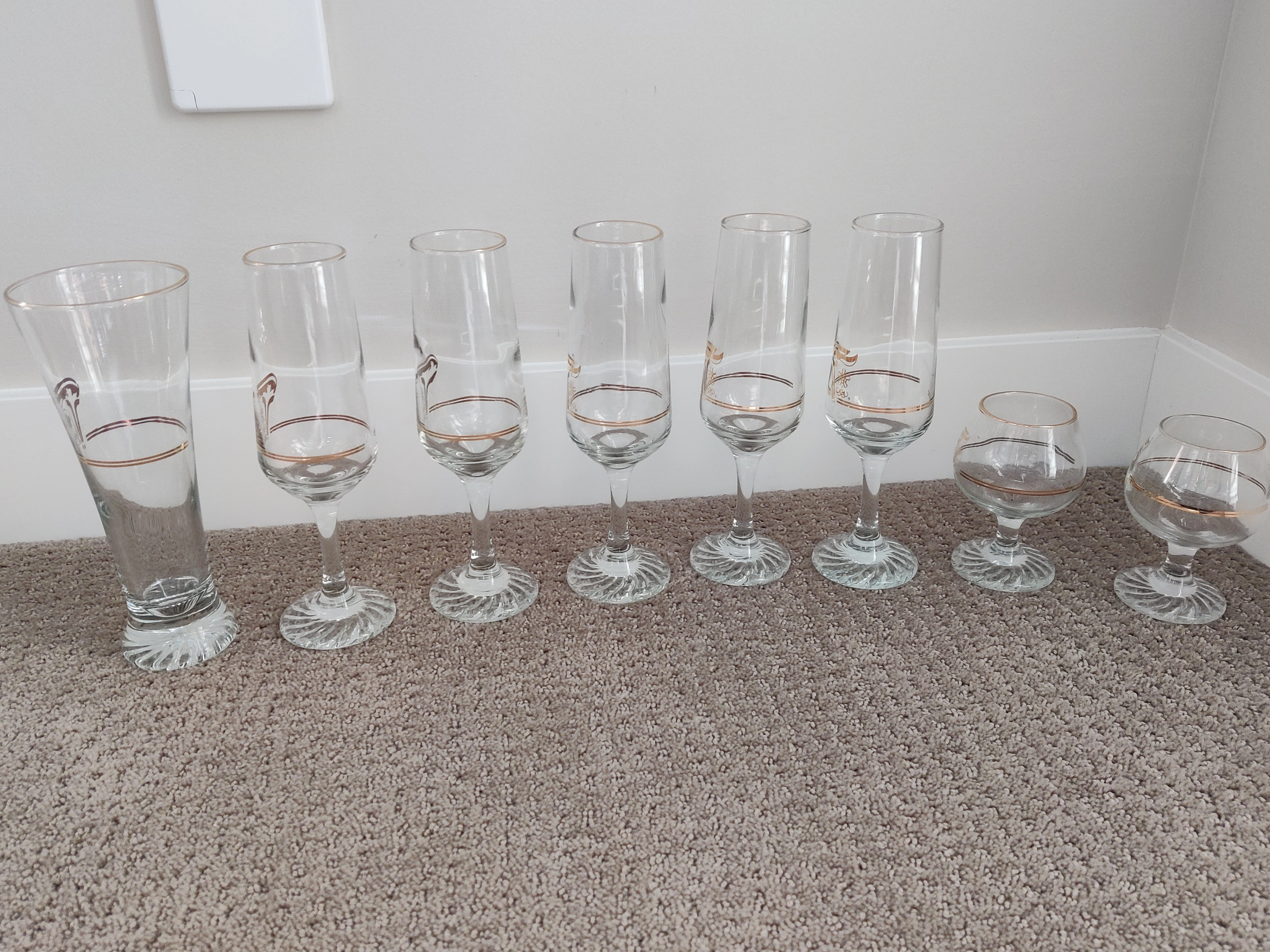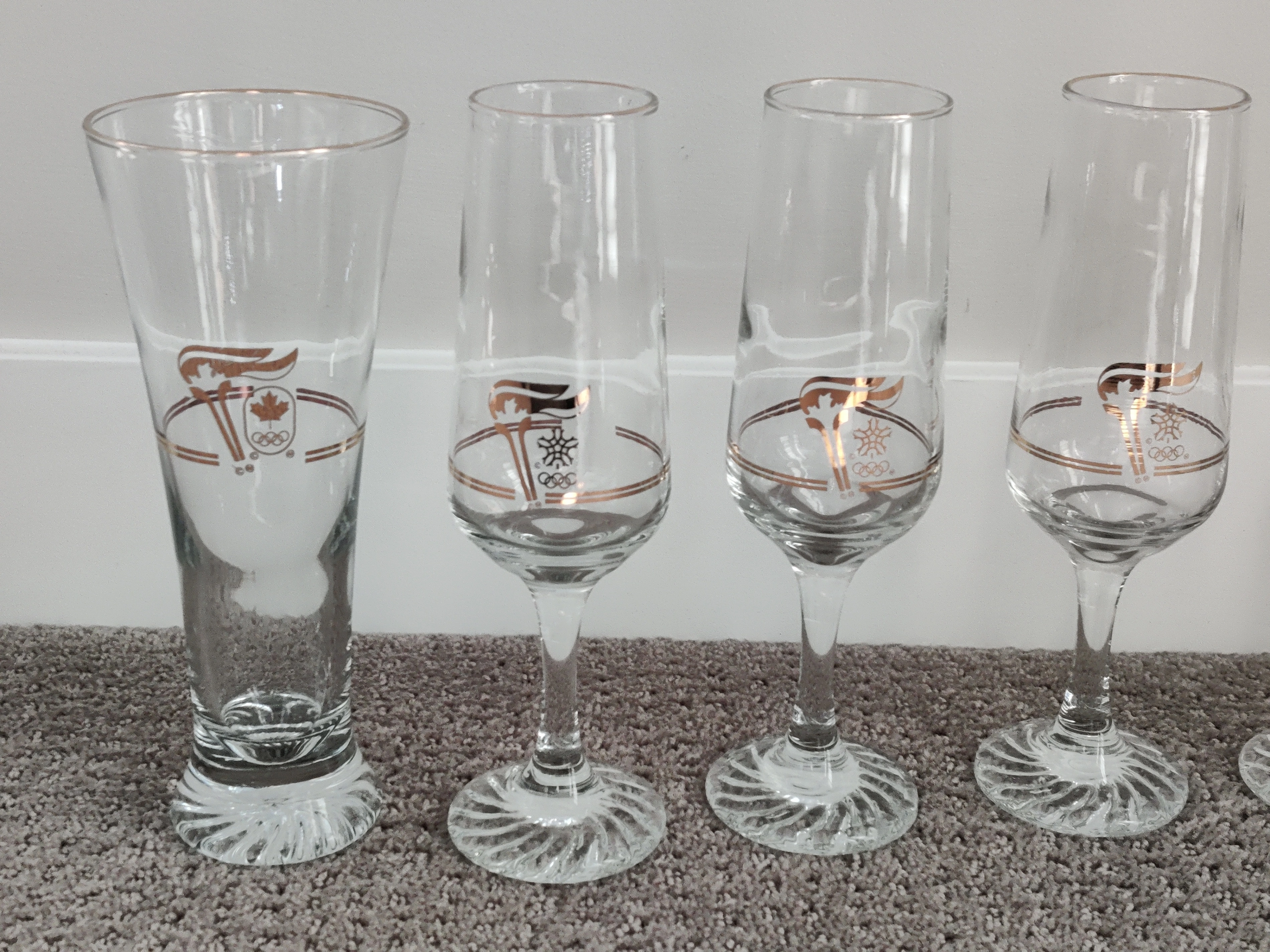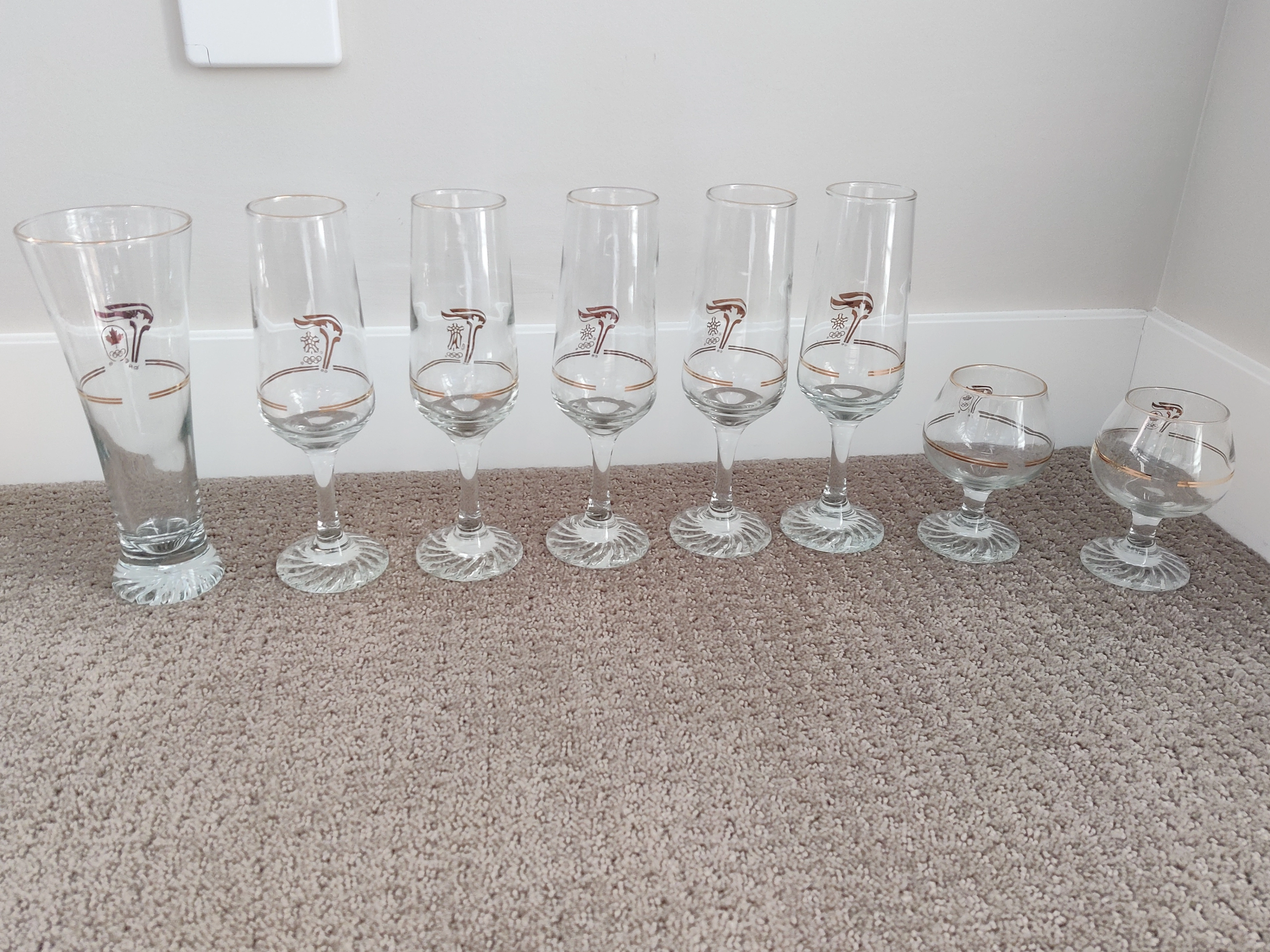 NOTE: As is common with vintage gold-trimmed glassware, some of the gold decoration has chipped off on some of the glasses. Please review the attached pictures to see the exact condition of each piece. This wear adds to their authentic, vintage character. I am selling a Set of 8 Vintage 1988 Calgary Winter Olympics Petro Canada Glassware Set - Champagne Pilsner Flute Sniffer Glasses - Collectible Barware in great condition. Relive the spirit of the 1988 Winter Olympics with this rare and unique set of 8 collectible glasses from the event. This set was a commemorative item from Petro-Canada, a major sponsor of the games, and is a fantastic piece of Calgary and Olympic history. This set is in great vintage condition, with no chips or cracks in the glass. Each glass is trimmed with a decorative band of what appears to be 22k gold leaf, along with the iconic Olympic torch symbol and the "Petro-Canada" sponsor logo. This is a varied set of barware, perfect for a collector or for use on a special occasion. Pilsner * Quantity: 1 * Height: 7.75" * Top Diameter: 3" * Base Diameter: 2.25" Champagne Flute * Quantity: 5 * Height: 8" * Top Diameter: 1-3/4" * Base Diameter: 2-3/8" Sniffer * Quantity: 2 * Height: 4" * Top Diameter: 2" * Base Diameter: 2-1/4" Whether you're a collector of Olympic memorabilia, a vintage glass enthusiast, or simply a fan of Calgary history, this set is a truly special find. Comes from a pet and smoke-free environment. Pickup in Mount Pleasant (NW Calgary)
