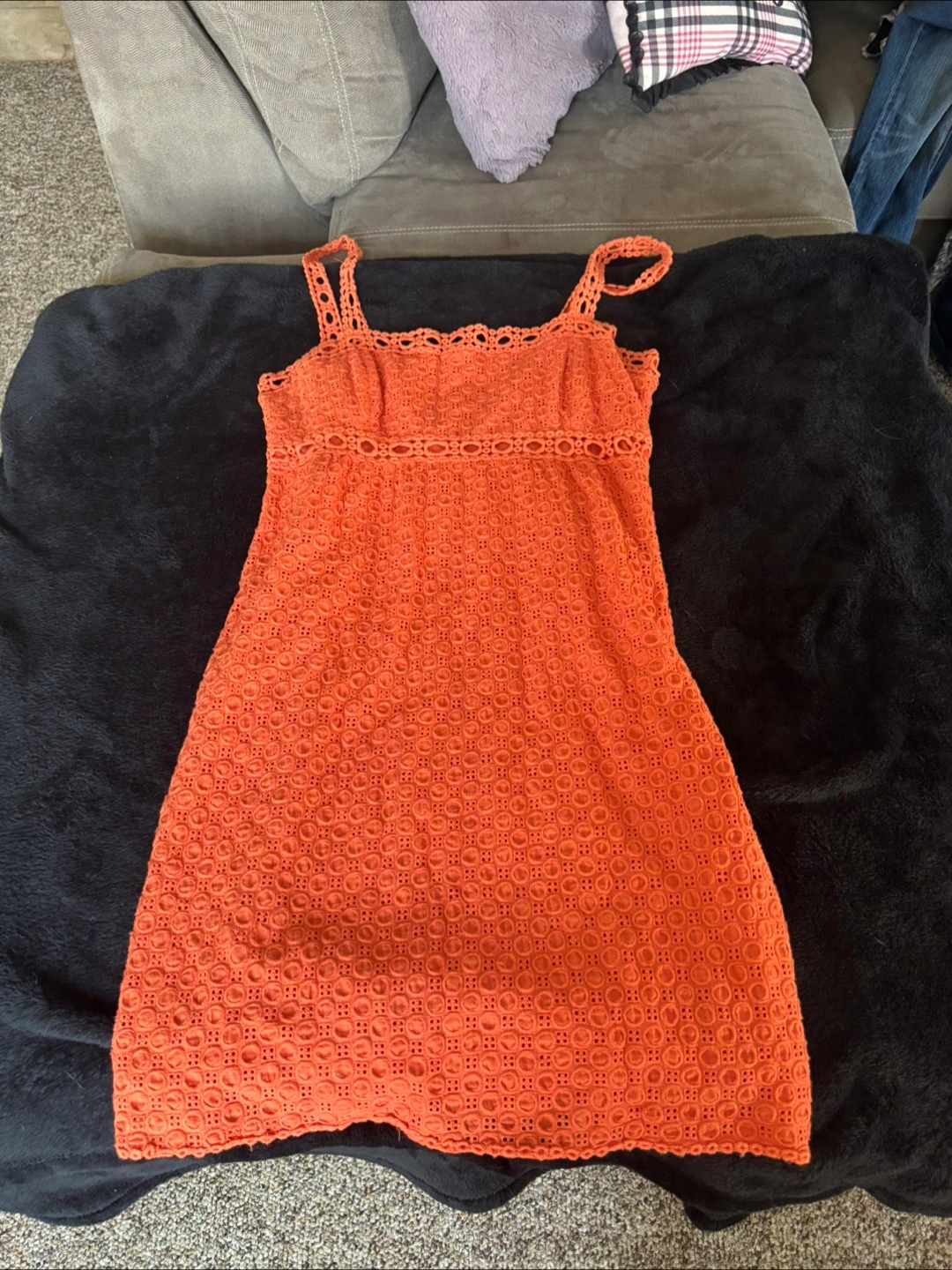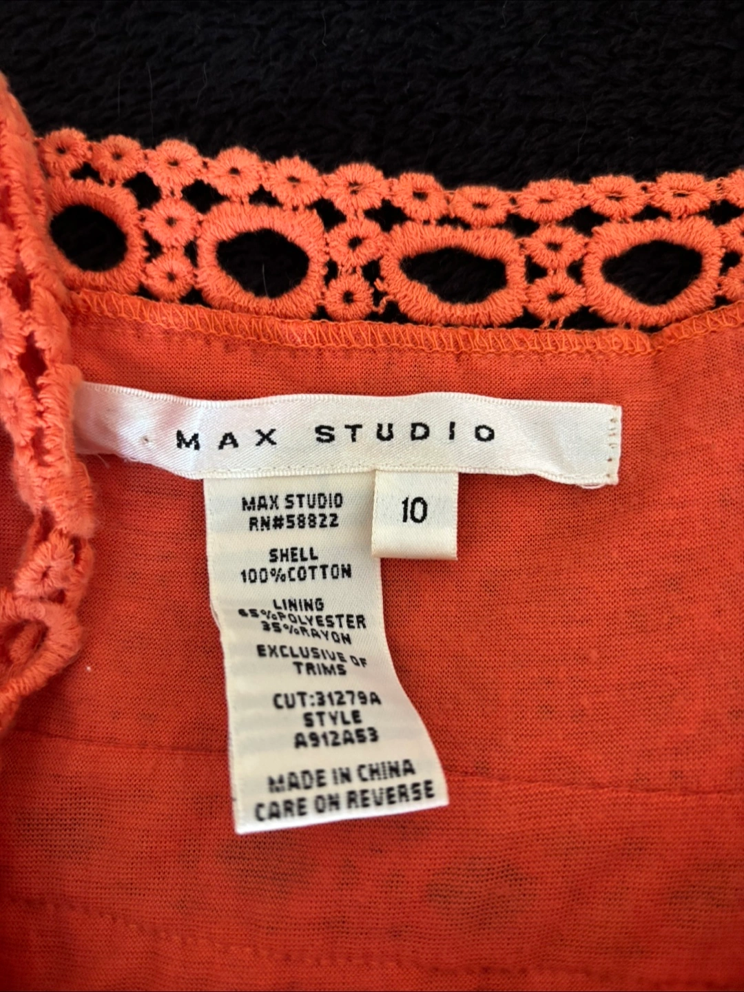 25Selling a cute orange dress from Max Studio! It's a size 10 and made of 100% cotton for the shell. The lining is 65% polyester and 35% rayon. It's in great condition and perfect for summer!