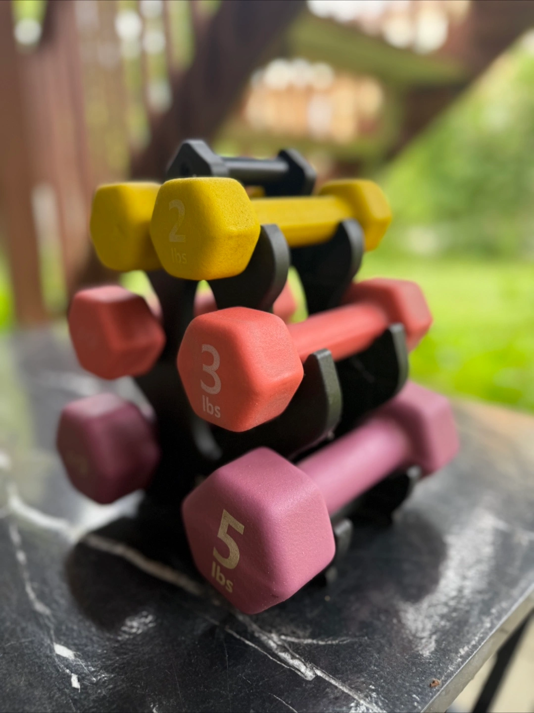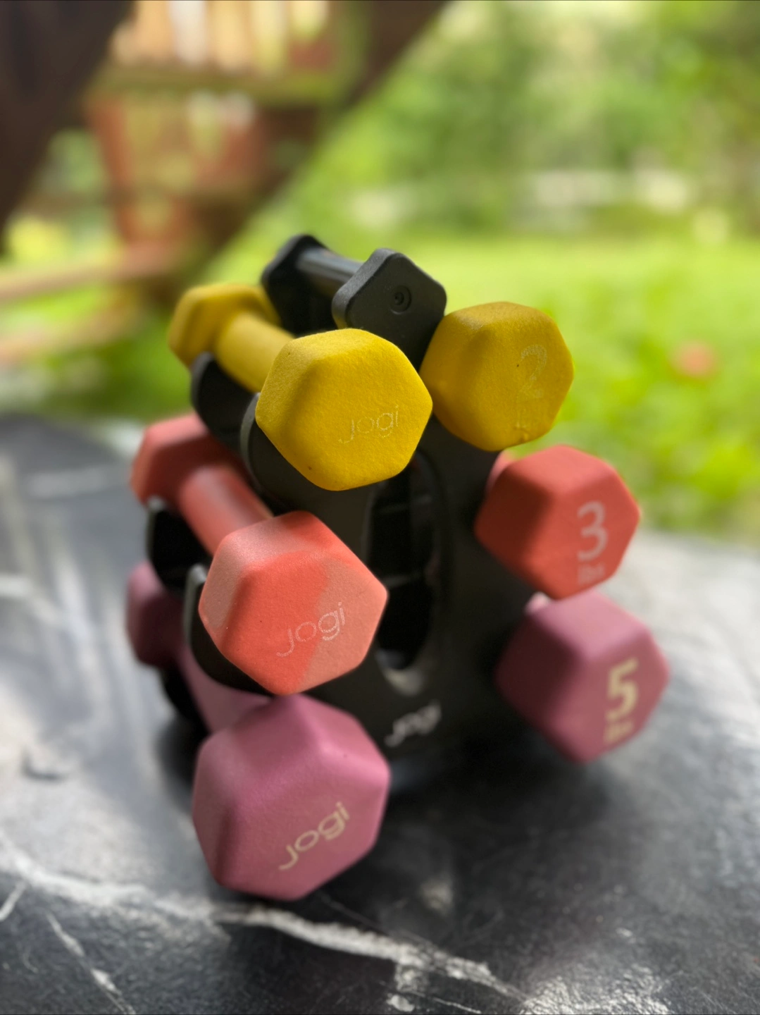 Selling a set of Jogi dumbbells with a convenient storage rack! The set includes three pairs of dumbbells: 2lb (yellow), 3lb (red), and 5lb (purple). Great for home workouts or adding some extra weight to your routine