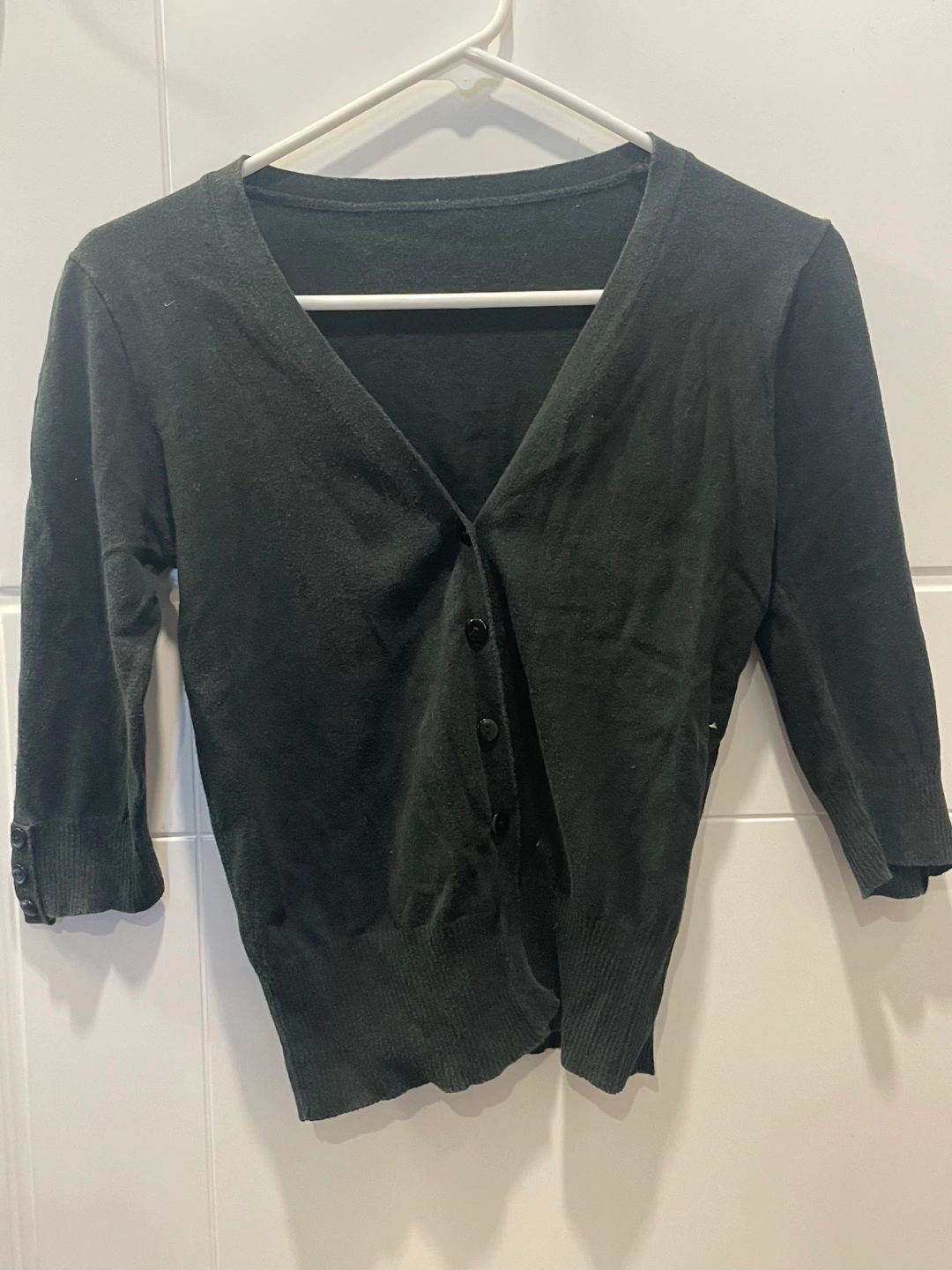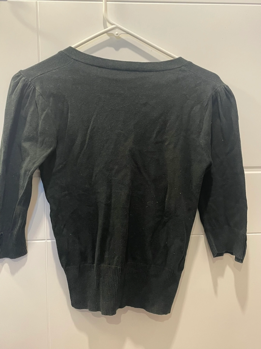 A simple black cardigan, perfect for layering! It's a size small and in great condition. Pairs well with just about anything!