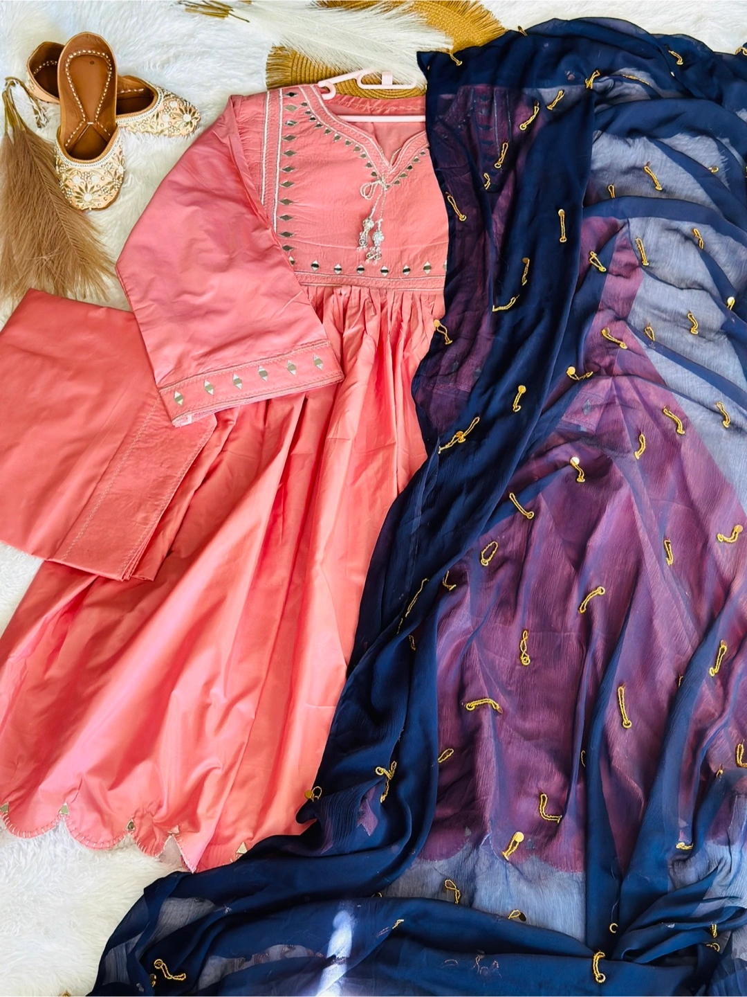 Selling a beautiful peach-coloured Anarkali dress, complete with a navy blue dupatta and matching shoes! The dress features delicate mirror work and a flattering silhouette. Perfect for special occasions or adding a touch of elegance to your wardrobe
