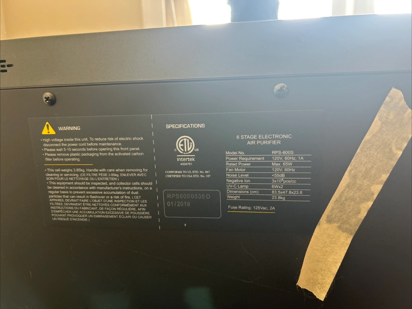 Selling a RPS 6-Stage Electronic Air Purifier. Key specs: - Model No: RPS-600S - Power Requirement: 120V, 60Hz, 1A - Rated Power: Max 65W - Fan Motor: 120V, 60Hz - Noise Level: <55dB - Negative Ion: 3x10^6 pcs/cc - CADR (Smoke): 8W/2 - Dimensions: 44.7x23.8cm - Weight: 23.8kg - Fuse Rating: 125Vac, 2A From a seniors home with no pets. Used for 18 months.