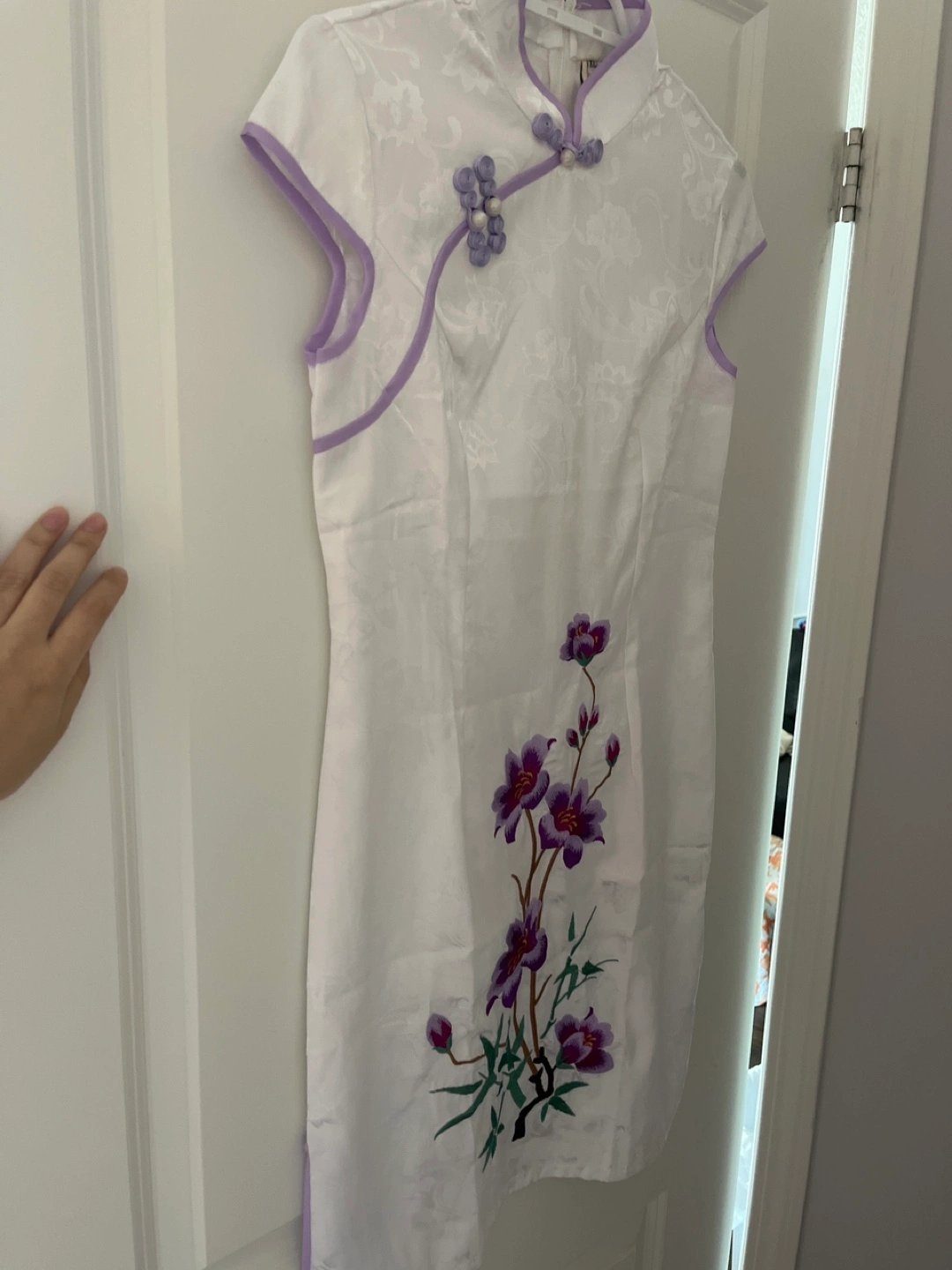 Selling a lovely cheongsam dress! It's white with a delicate floral pattern and has a cute purple trim. Perfect for a special occasion or adding a touch of elegance to your wardrobe