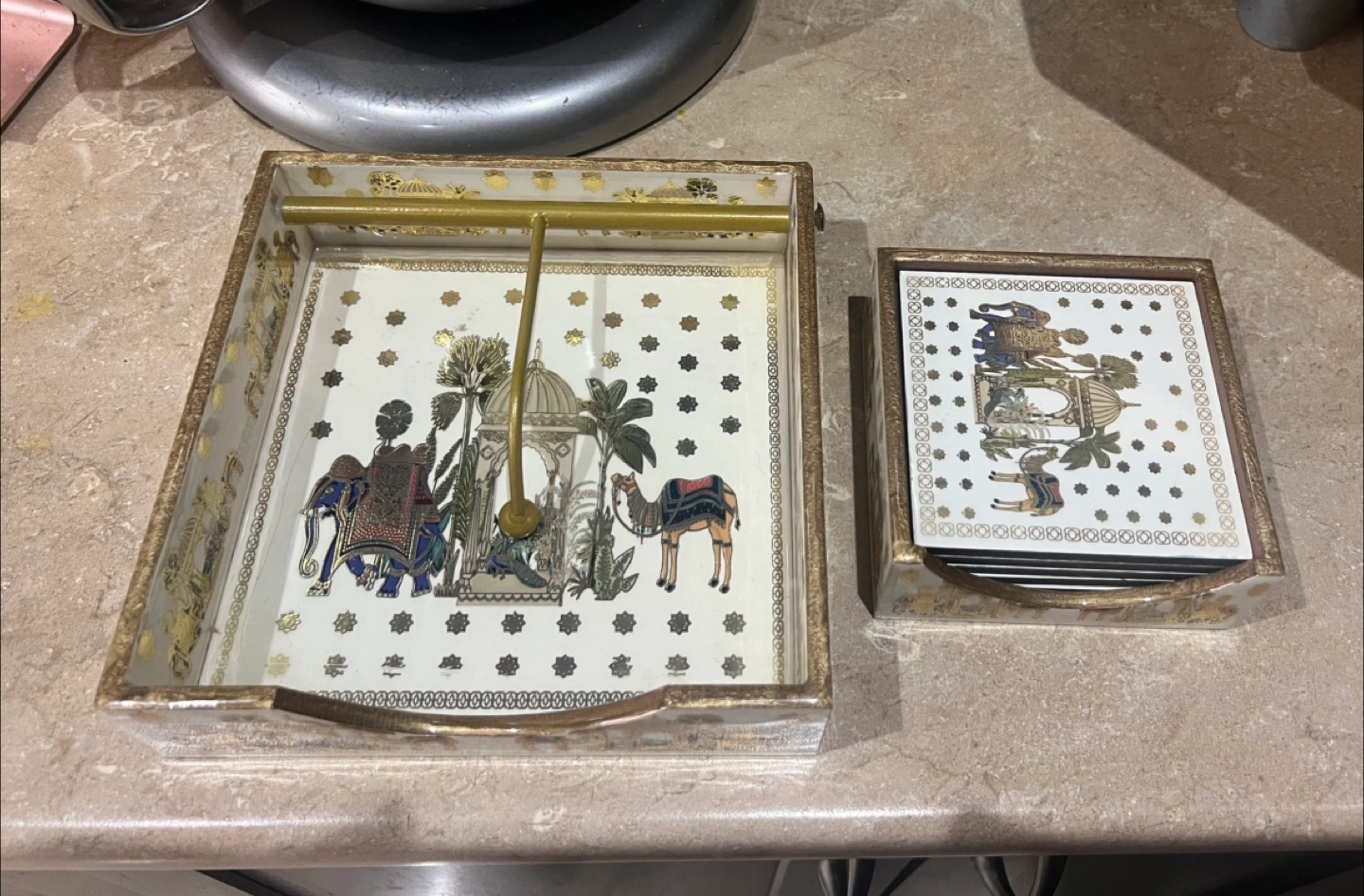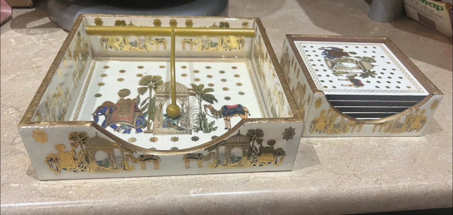 Selling a unique vintage napkin holder and coaster set. The set features intricate designs with elephants and camels, adding a touch of exotic charm to your table setting. Perfect for adding a vintage touch to your home!