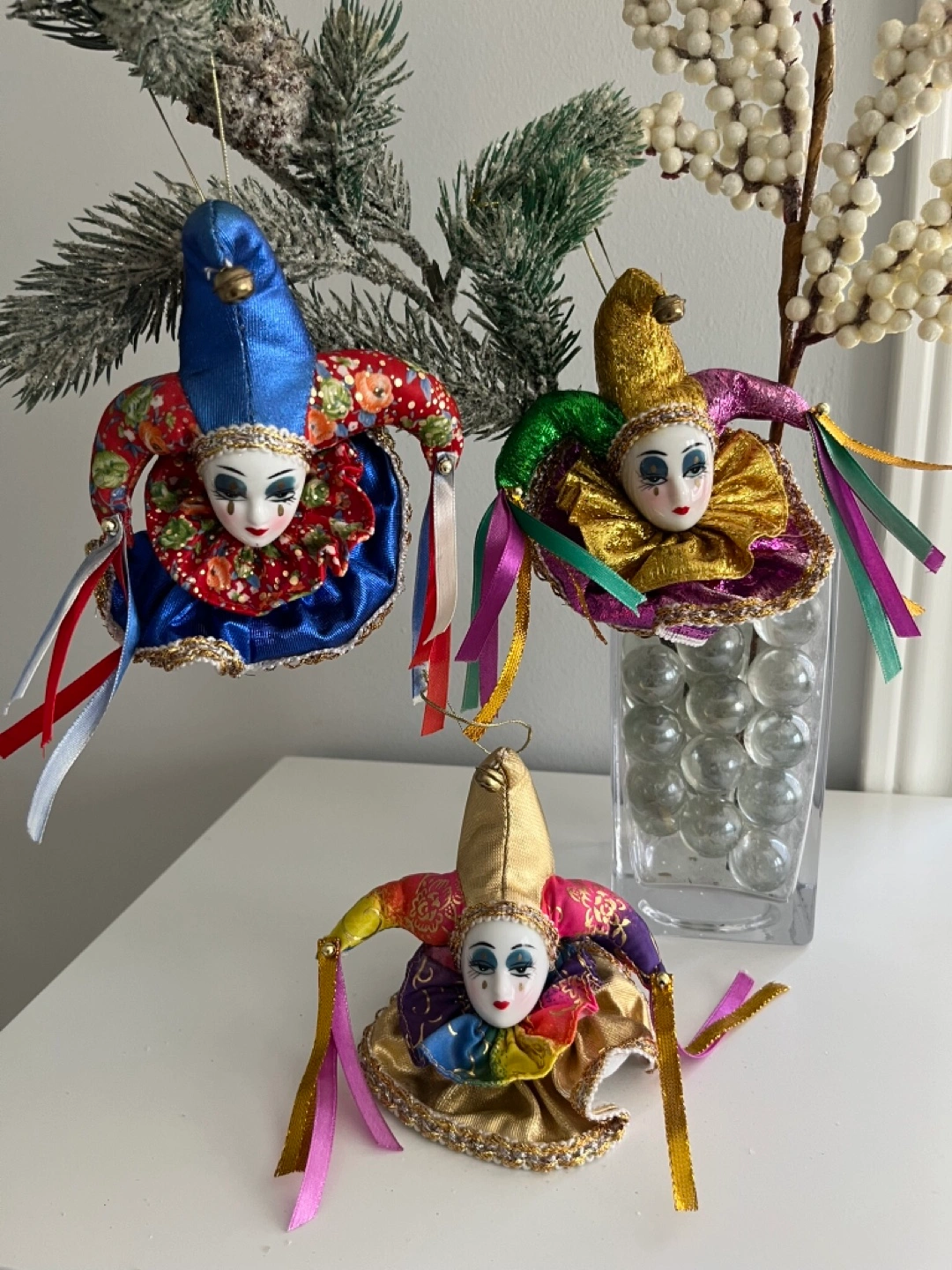 These are cute jester ornaments with porcelain faces! Set of 3 . They have colourful outfits and little bells on their hats. Cash only Bathurst And Steeles Pick up