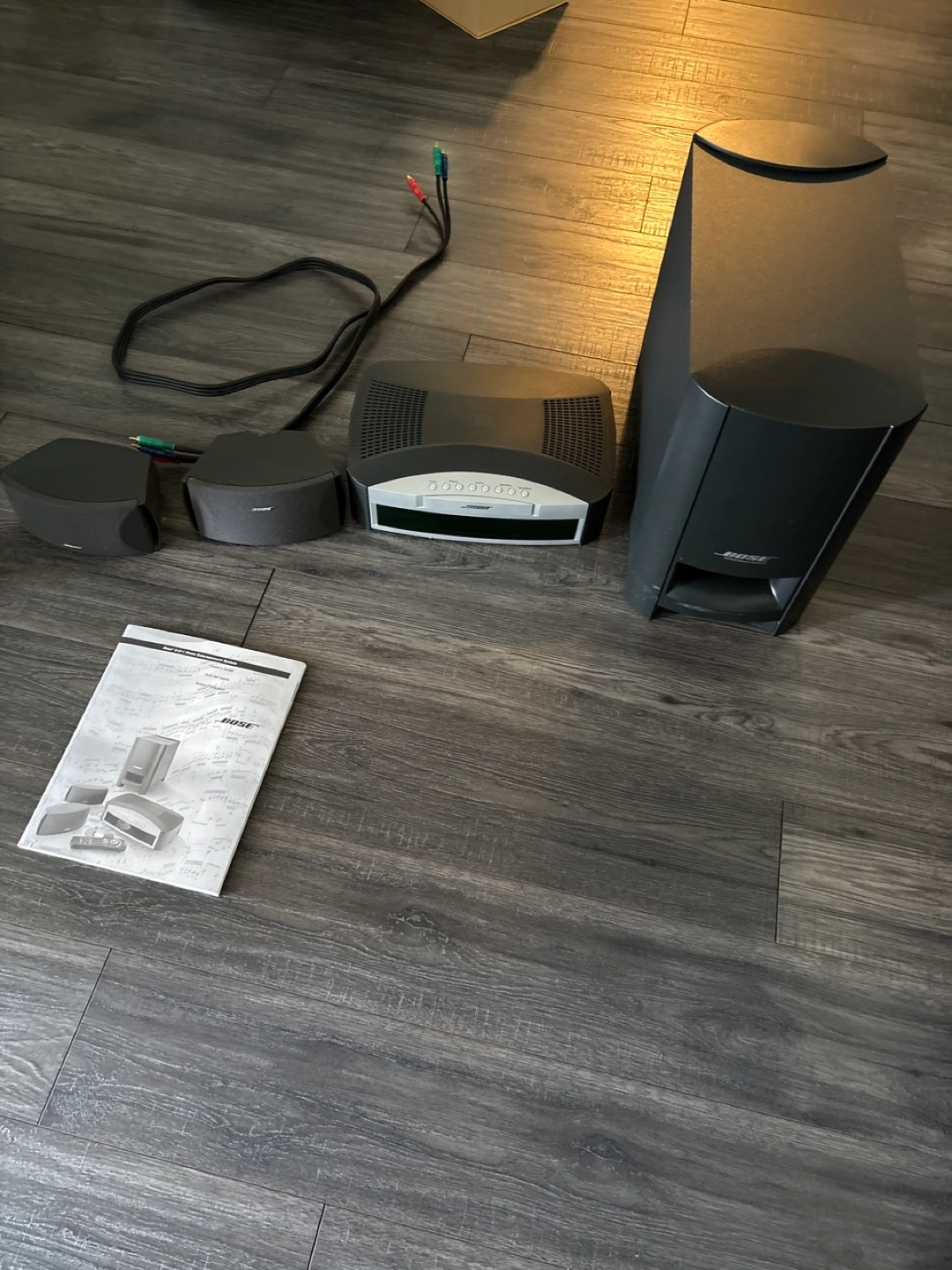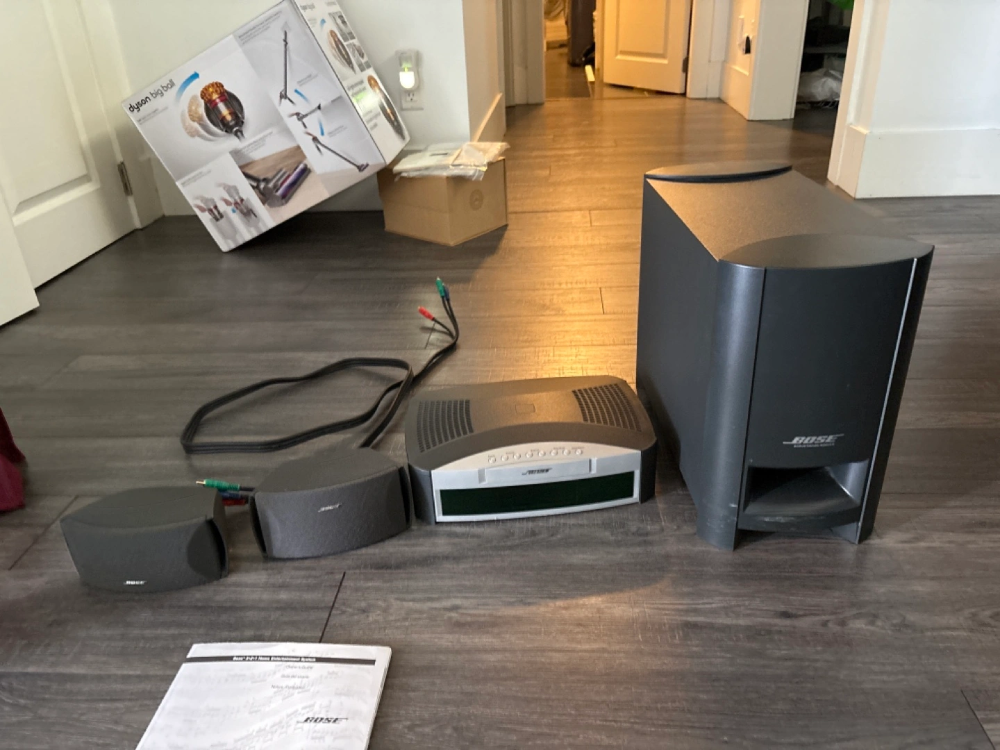 Selling a Bose Lifestyle 12 home entertainment system. It includes the main unit, subwoofer, two satellite speakers, and all necessary cables. It also comes with the original manual. Great for enhancing your home audio experience!