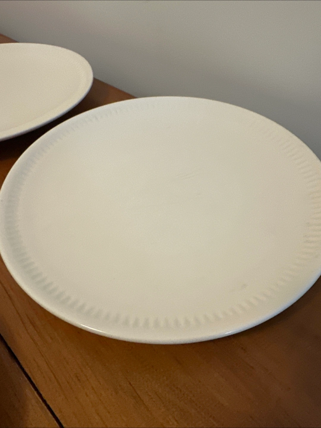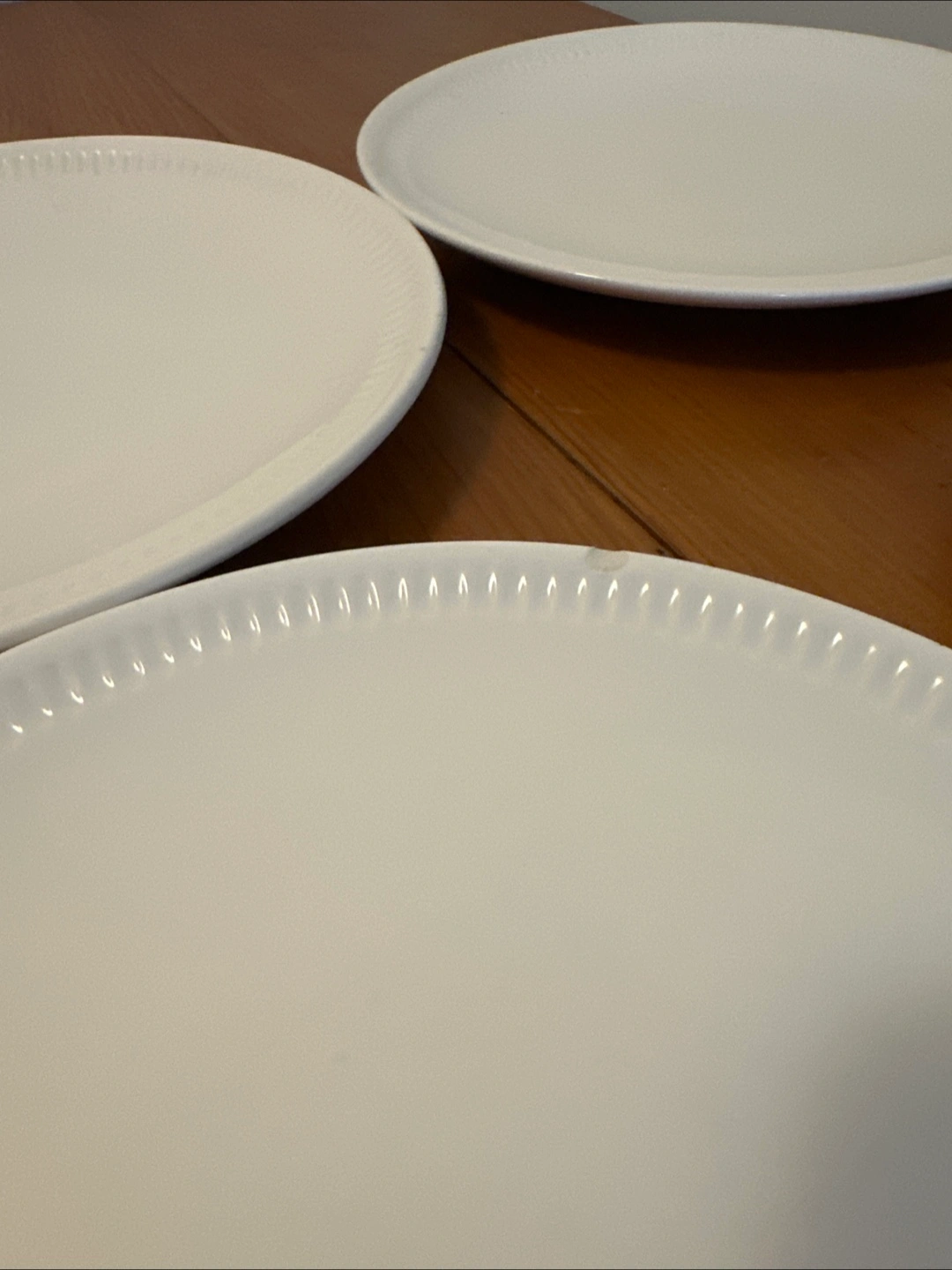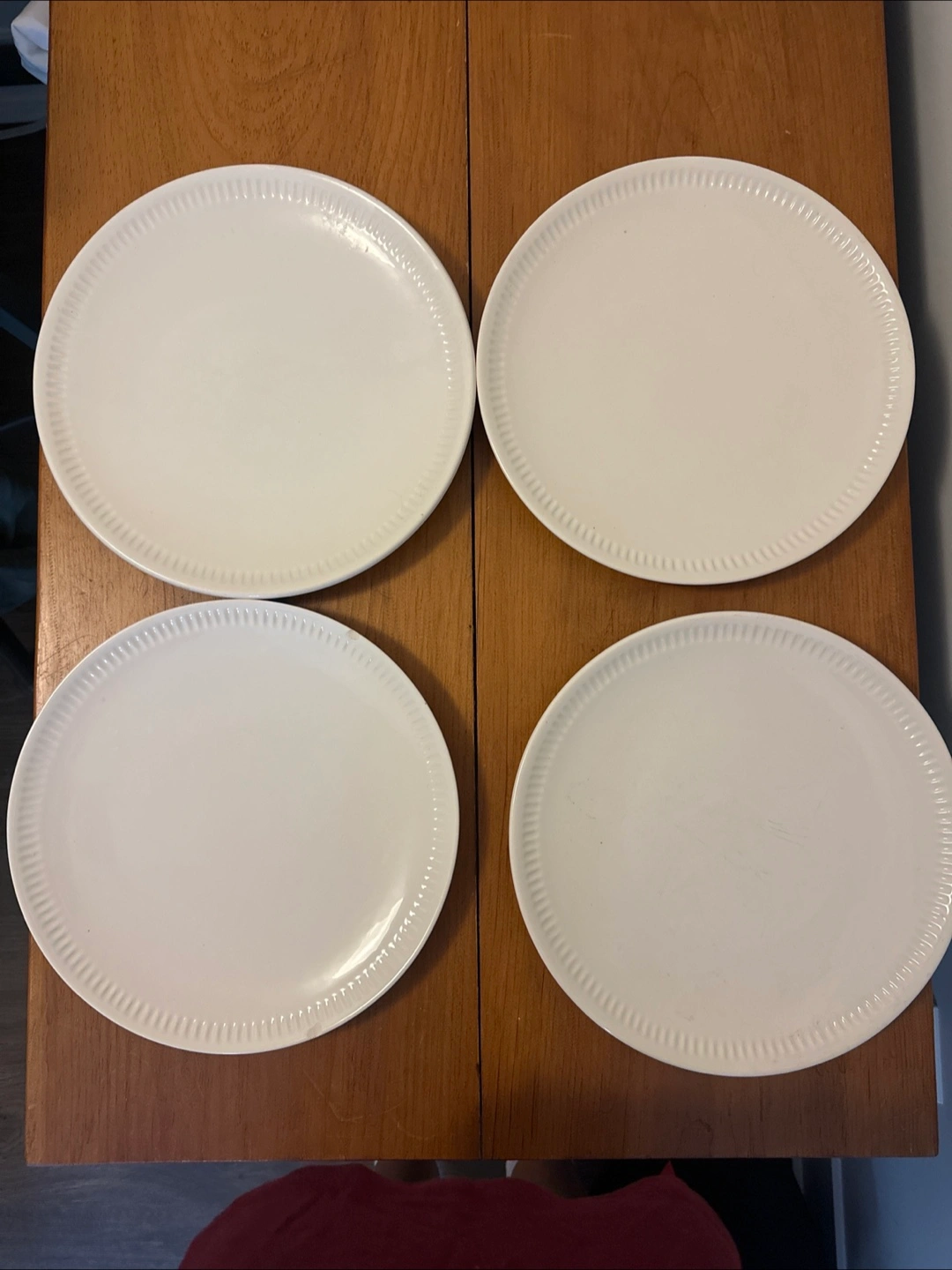 a set of four simple white dinner plates. They're in okay condition: one plate has a little chip and another has a few scratches. Still usable.