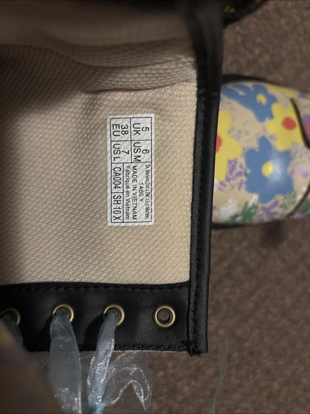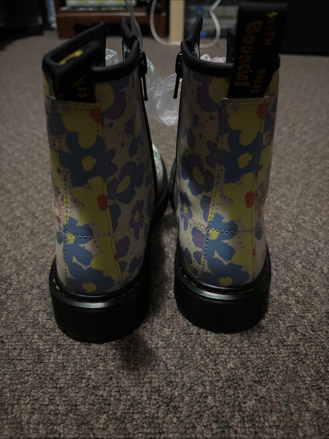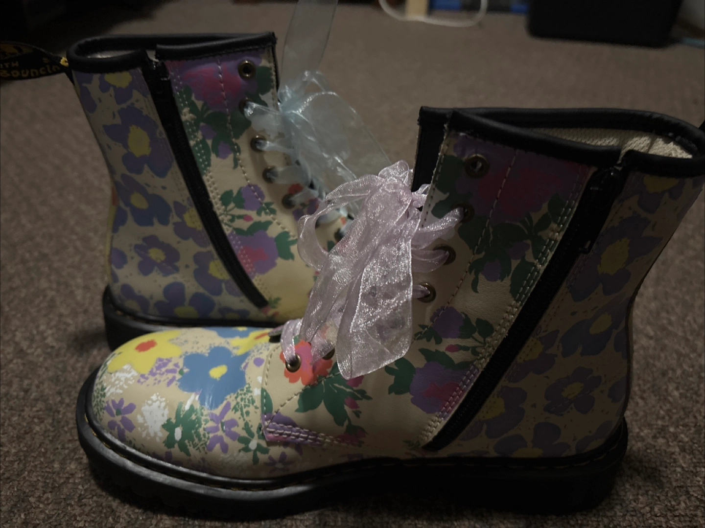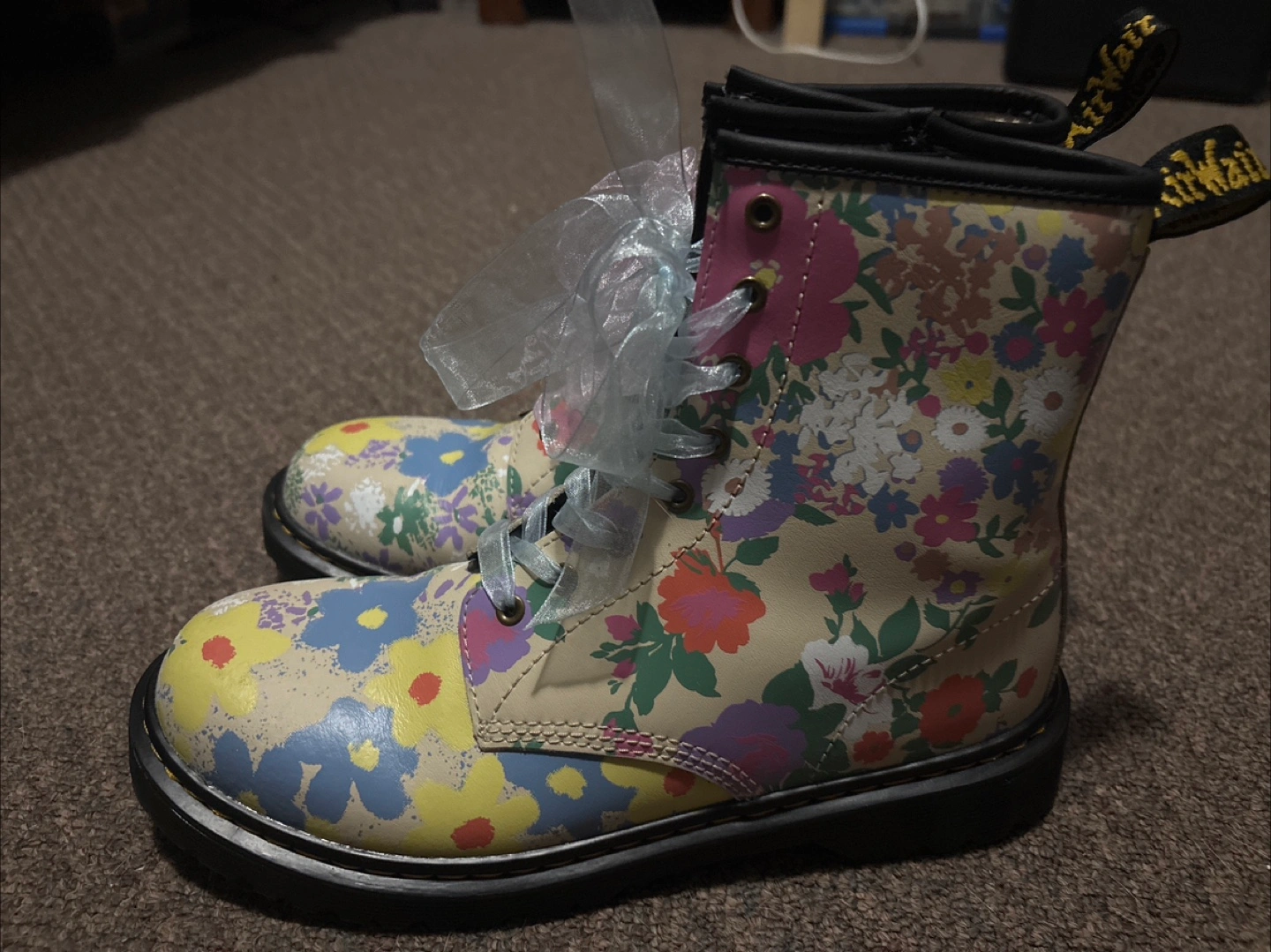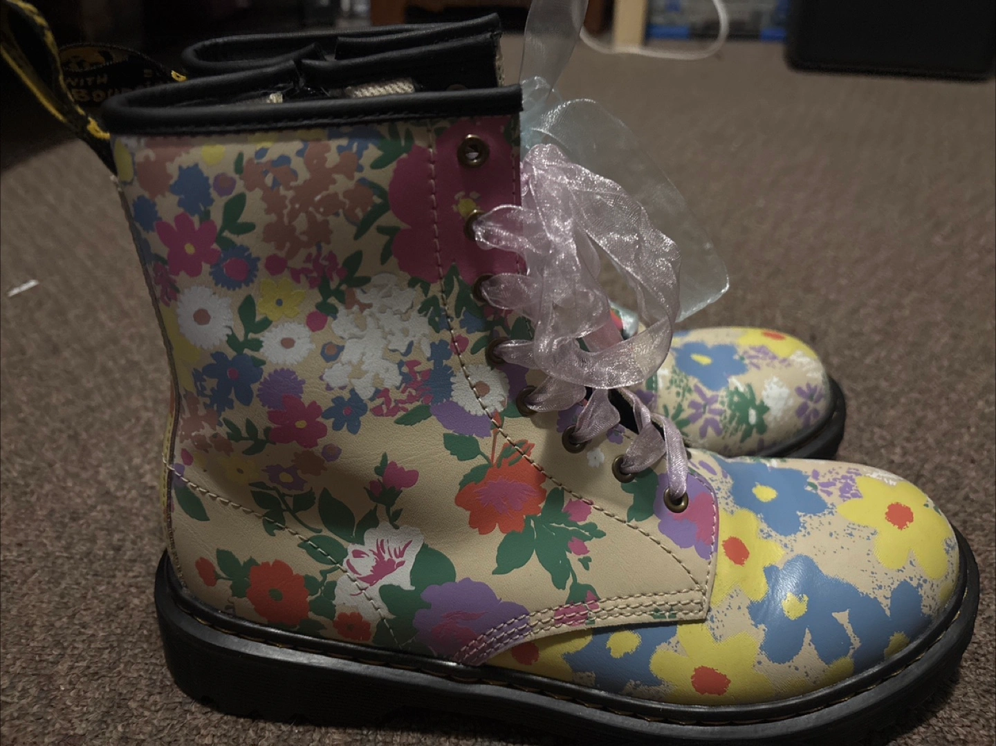 These Dr. Martens boots have a fun floral print! They're in great condition and ready for a new home. They come with both the original black laces and purple/blue ribbon laces. Perfect for adding a pop of colour to any outfit.