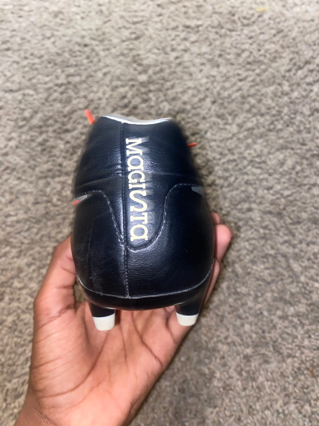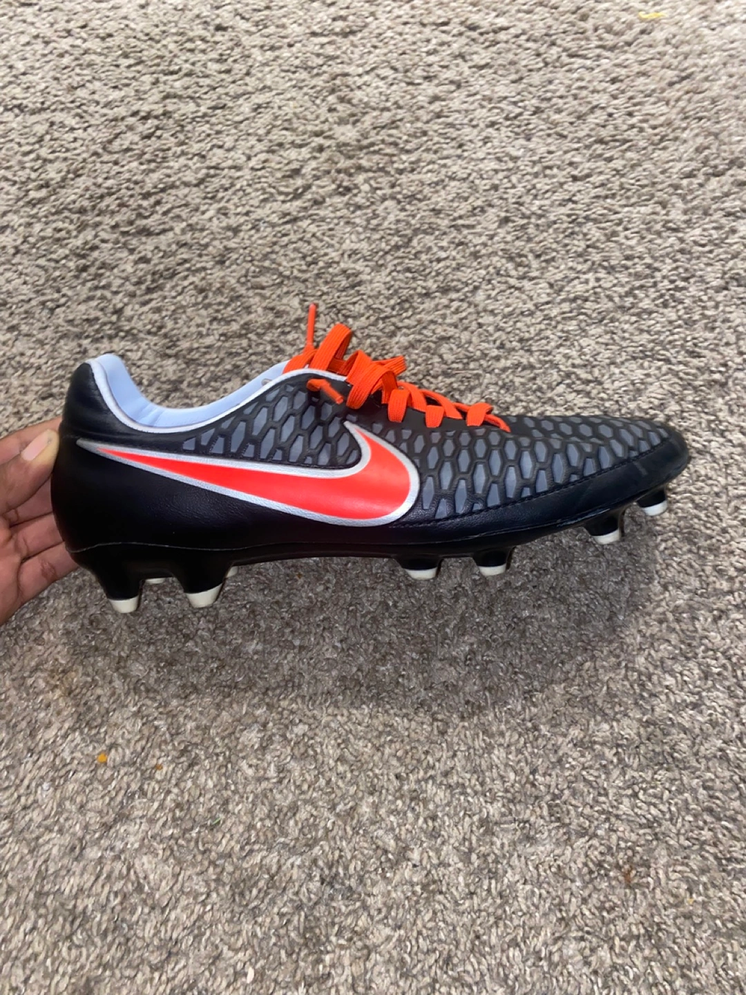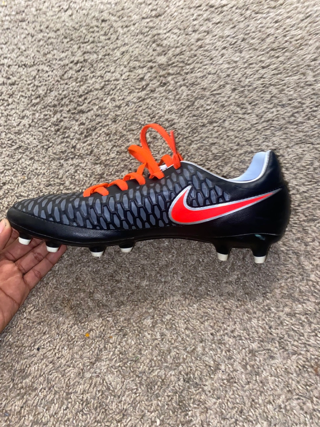 Selling a pair of Nike Magista soccer cleats in size US 9.5. They're in good shape and ready for the field! The cleats feature a black and grey design with orange accents. Perfect for your next soccer game or practice