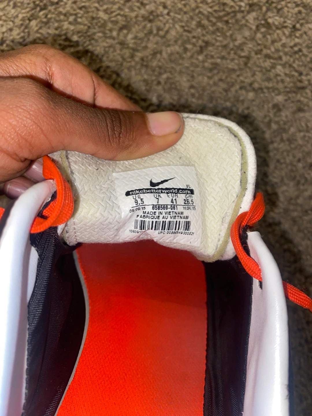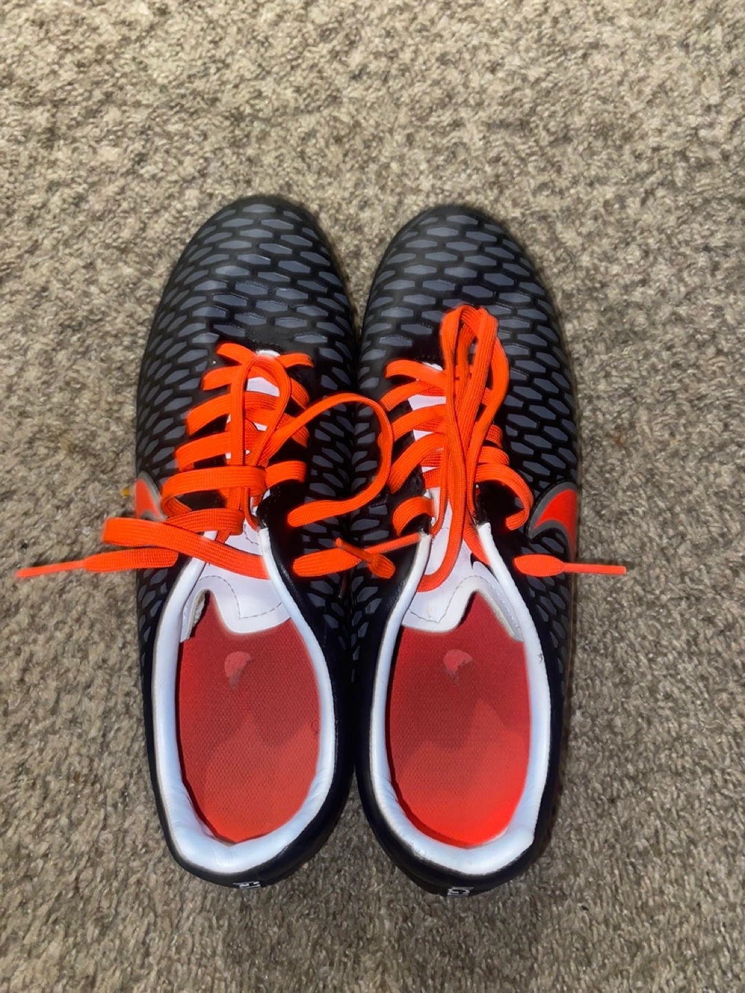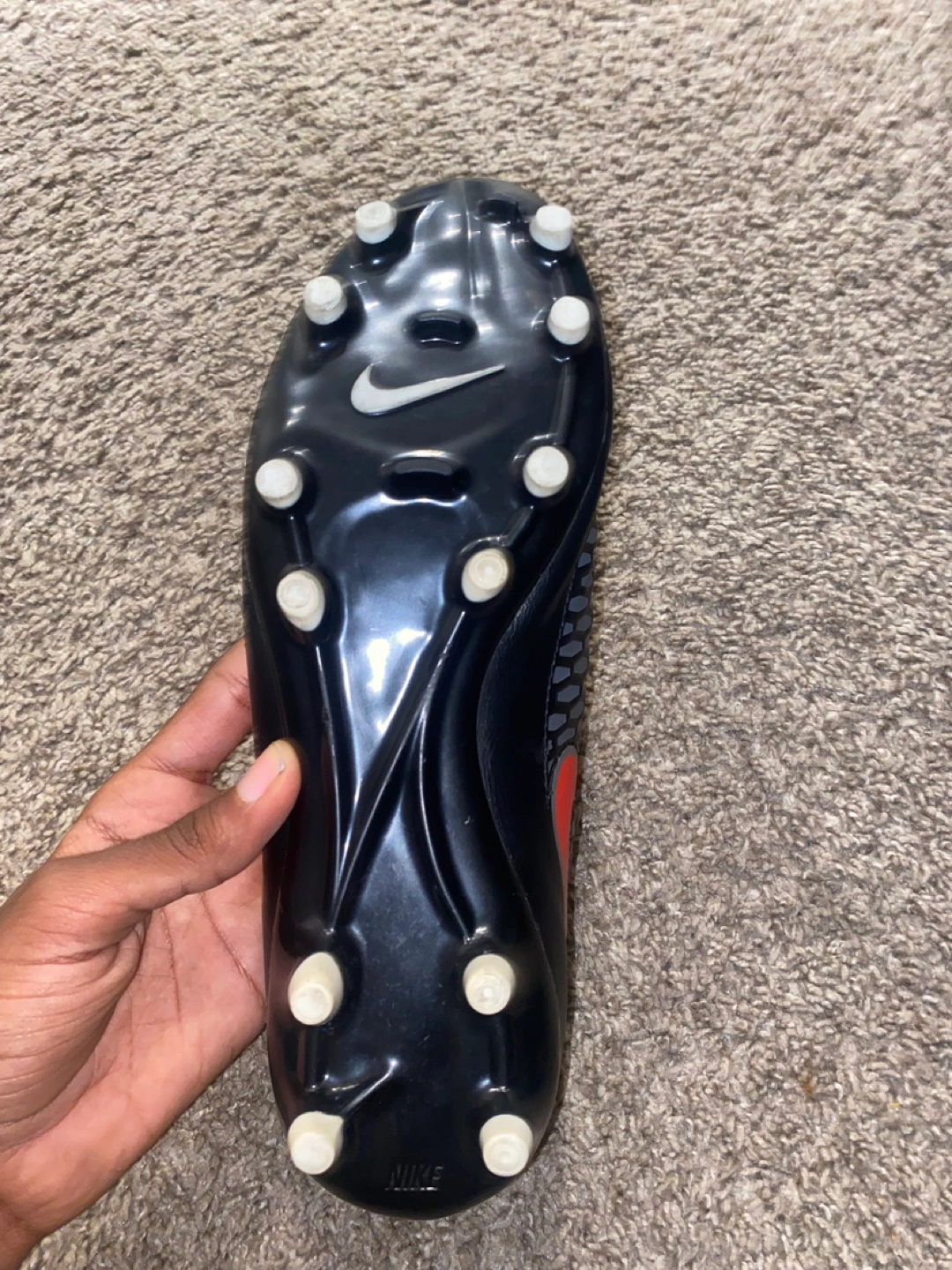 Selling a pair of Nike Magista soccer cleats in size US 9.5. They're in good shape and ready for the field! The cleats feature a black and grey design with orange accents. Perfect for your next soccer game or practice